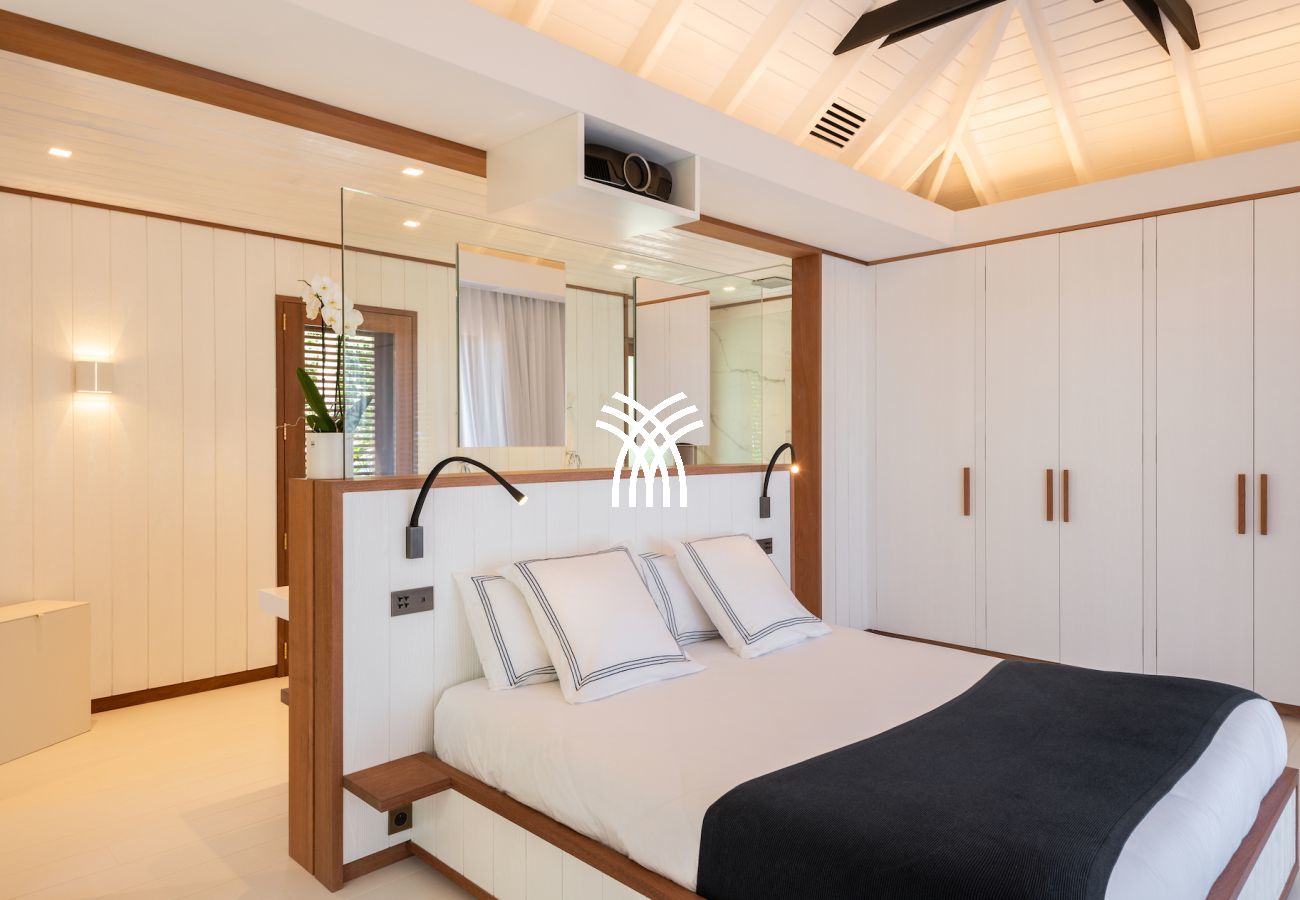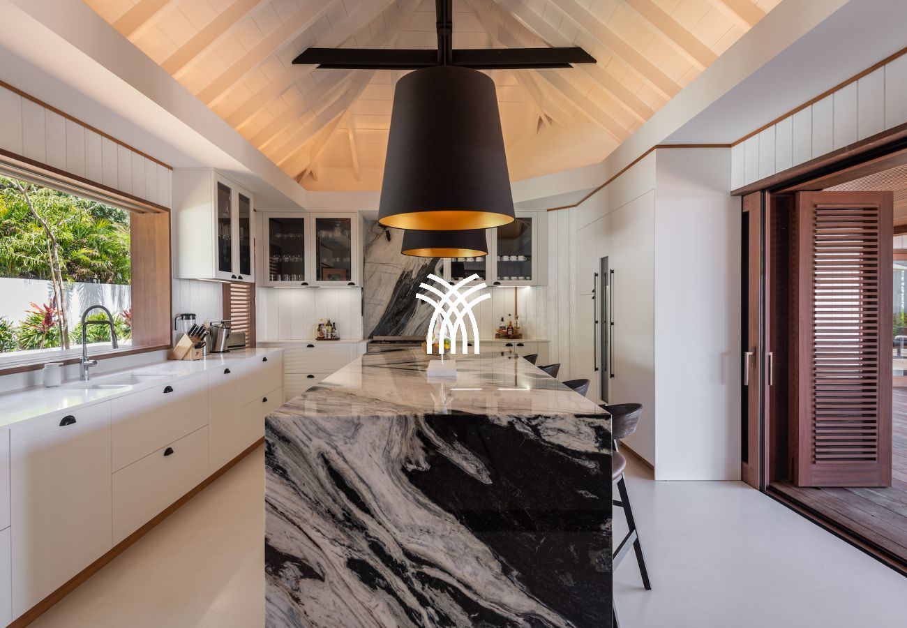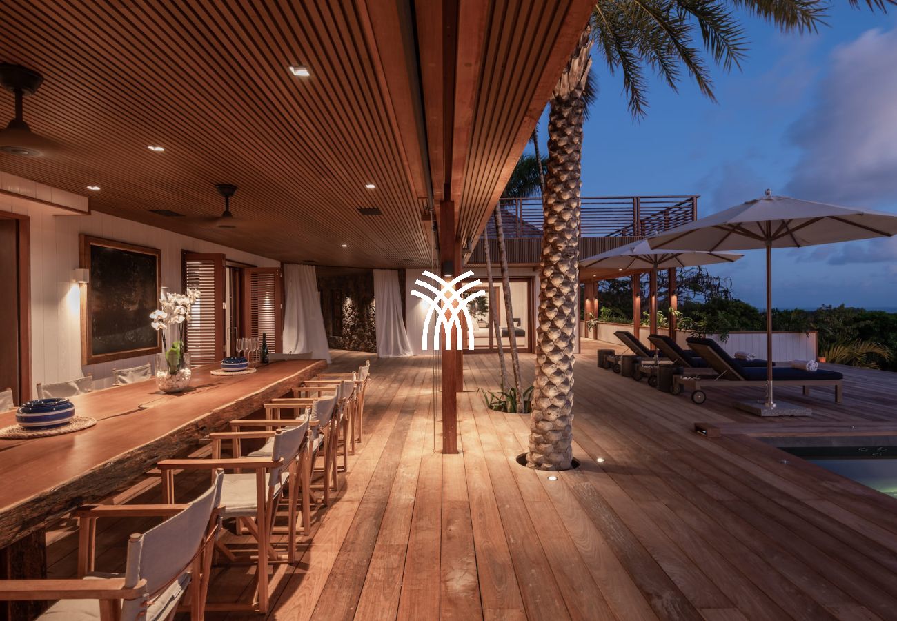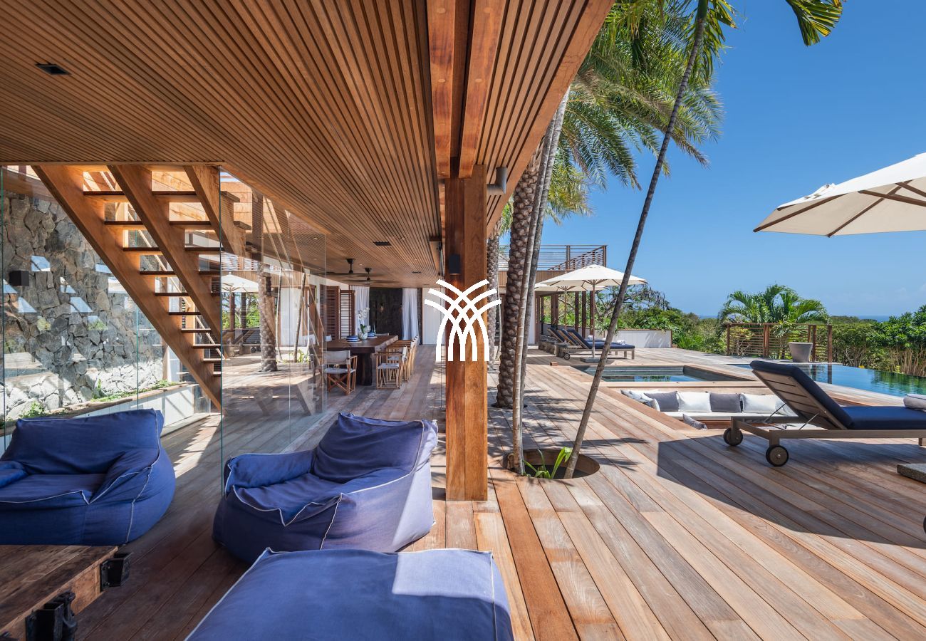 The vast living spaces are bathed in natural light and elegantly decorated. The spacious living room opens onto a covered terrace, ideal for relaxation, while the fully equipped professional kitchen is perfect for hosting up to 12 guests or for a private chef's intervention. Outside, an infinity heated pool nestled on the hillside completes this exceptional setting, surrounded by shaded loungers and parasols in a soothing tropical atmosphere.