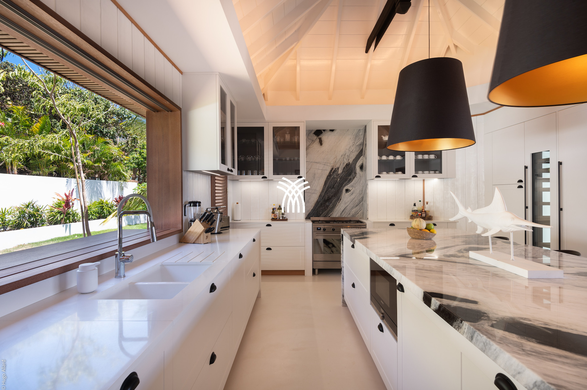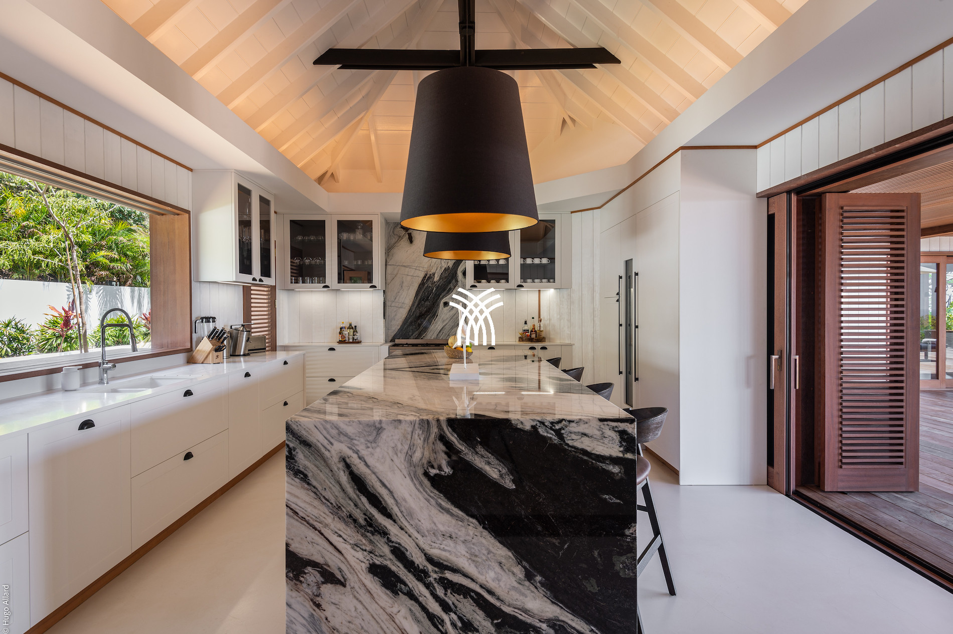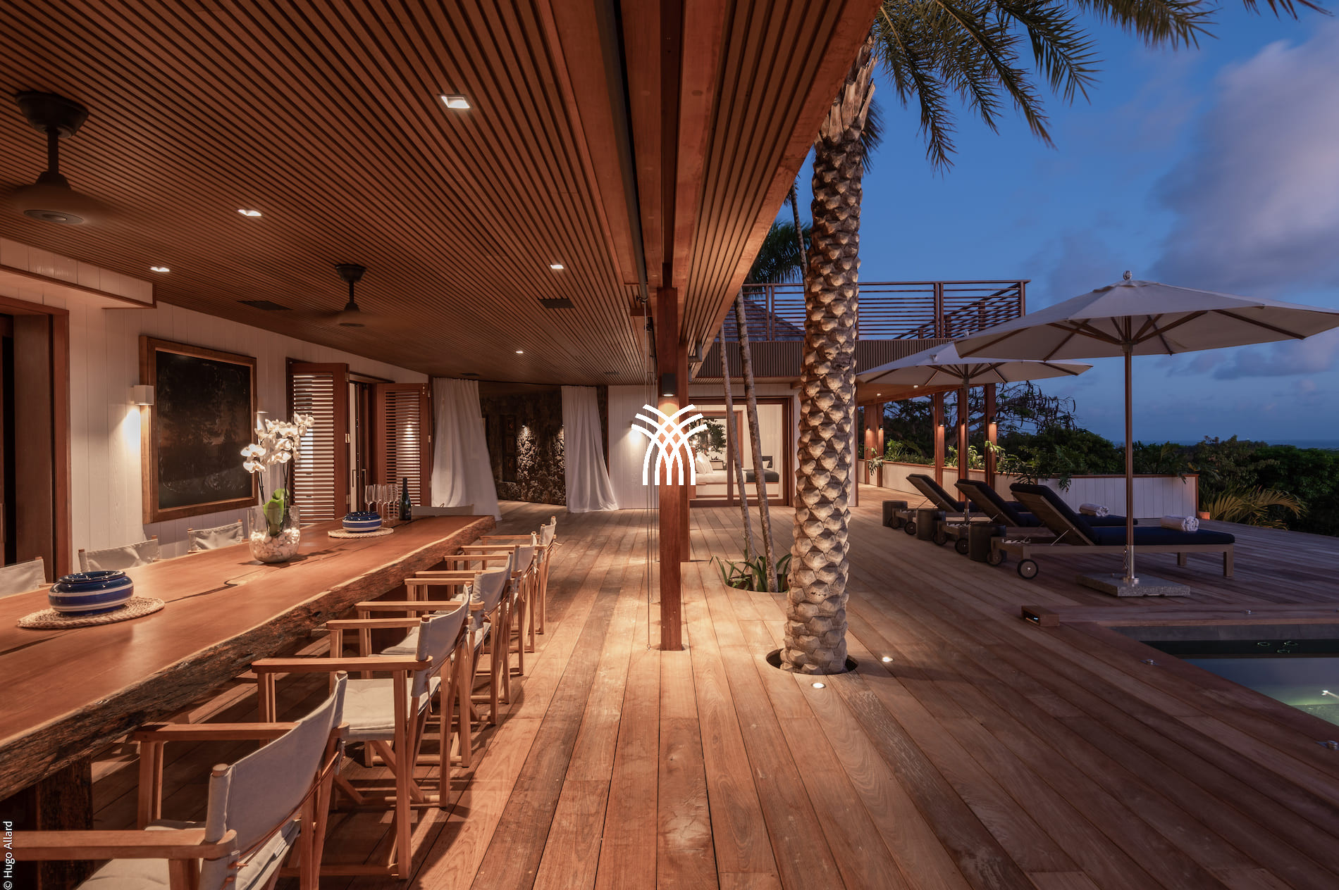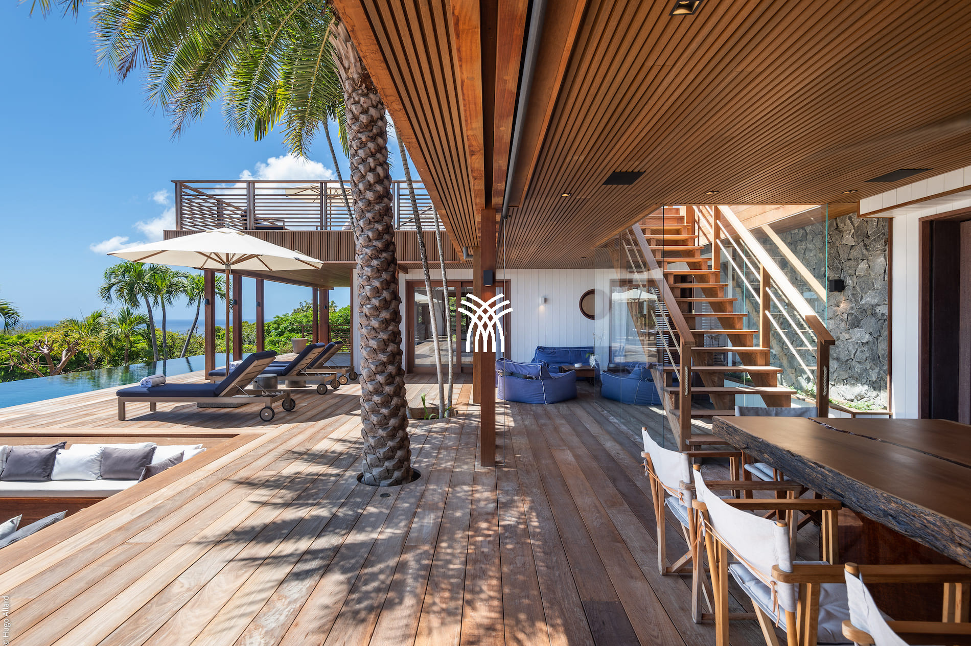The vast living spaces are bathed in natural light and elegantly decorated. The spacious living room opens onto a covered terrace, ideal for relaxation, while the fully equipped professional kitchen is perfect for hosting up to 12 guests or for a private chef's intervention. Outside, an infinity heated pool nestled on the hillside completes this exceptional setting, surrounded by shaded loungers and parasols in a soothing tropical atmosphere.