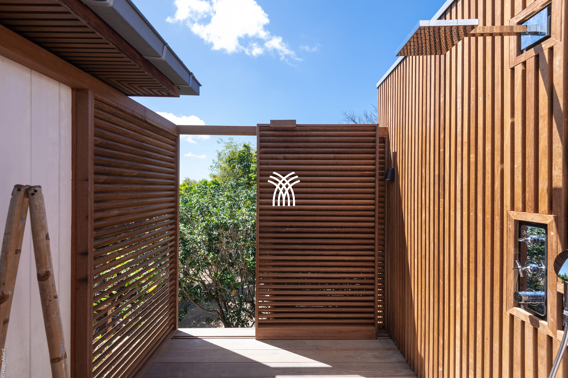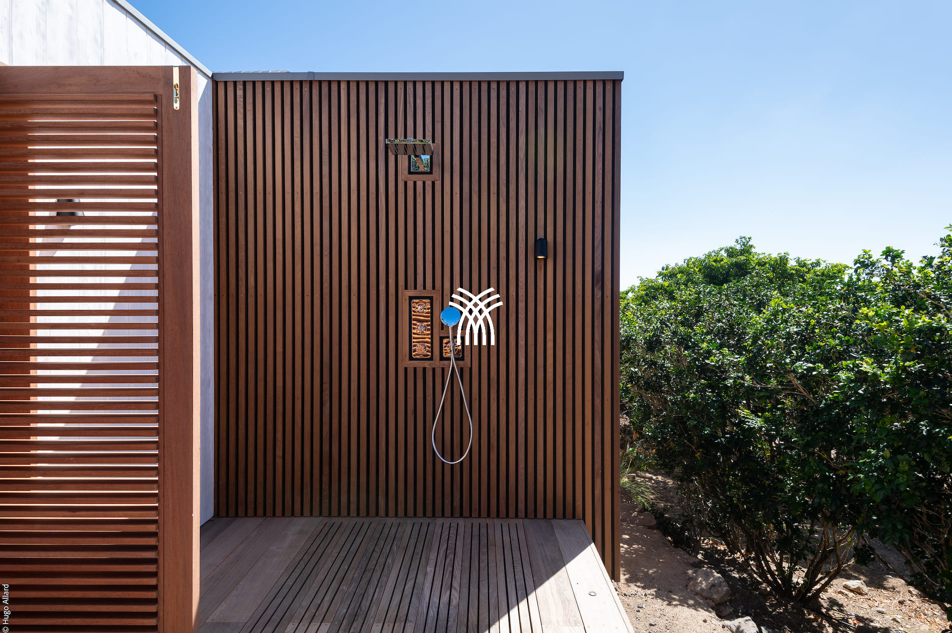 View on ocean and tropical garden. Outdoor shower.