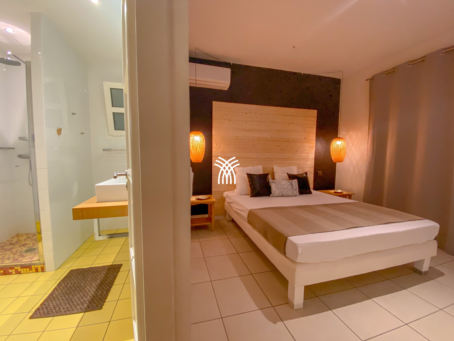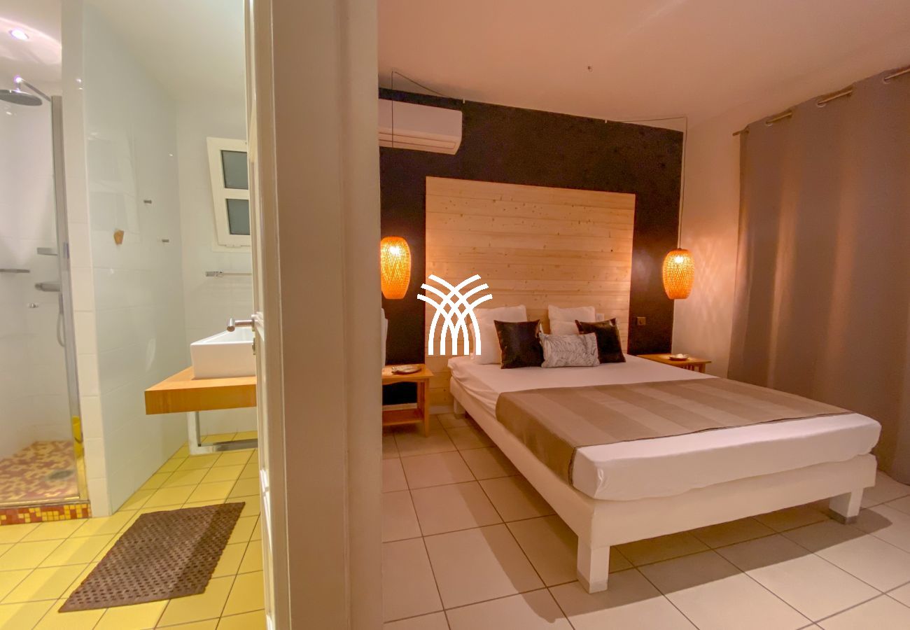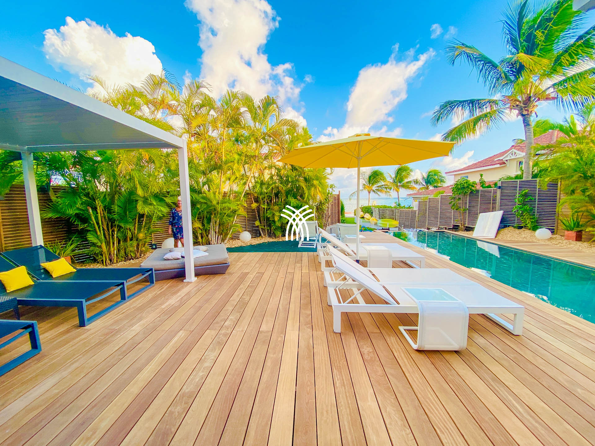 Outside, the vast 150 m² terrace offers an unobstructed view of an intimate beach and the splendid Saint-François lagoon. Both young and old can relax in the heated counter-current swimming pool with its integrated hot tub.