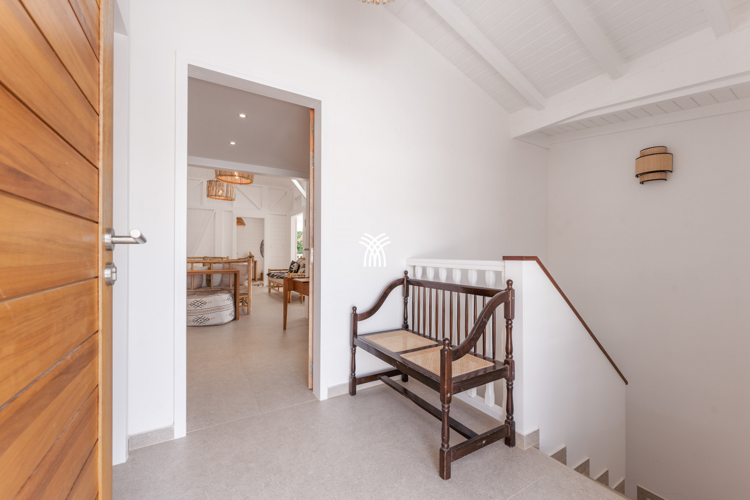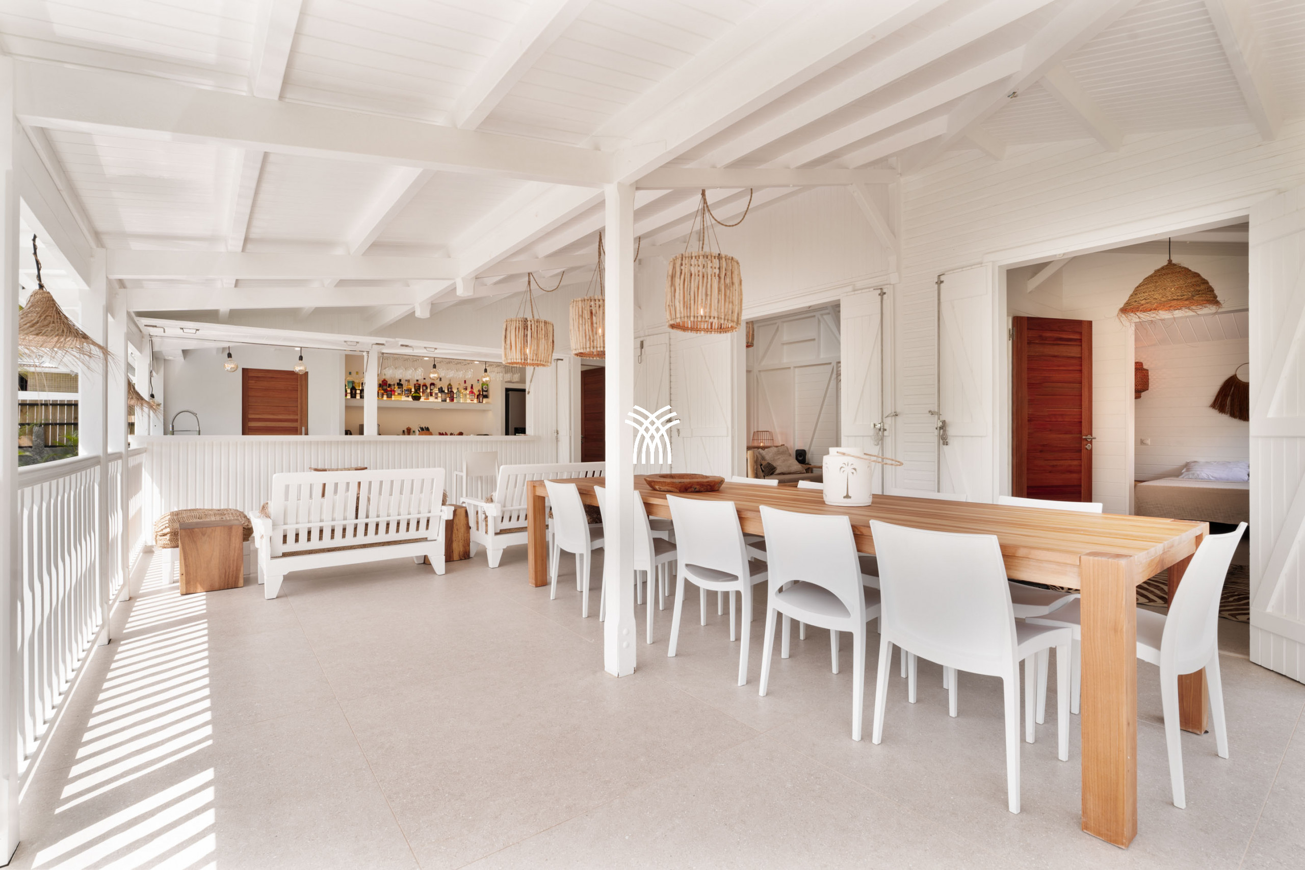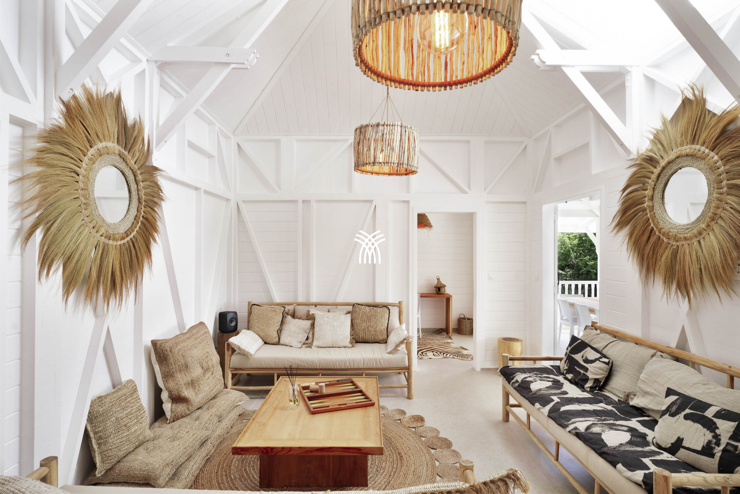Designed as a high-end family retreat, Villa Gwadaluna consists of a main villa and an independent cottage, comfortably accommodating up to twelve people. The living spaces, open to nature, allow light and sea breeze to circulate. This ventilated architecture, typical of Creole homes, offers a soothing setting for those seeking a luxury villa rental in Saint-François, blending modernity and local traditions. The solid wood shutters and doors, light fabrics, and natural finishes enhance the serene atmosphere of a home designed for well-being.