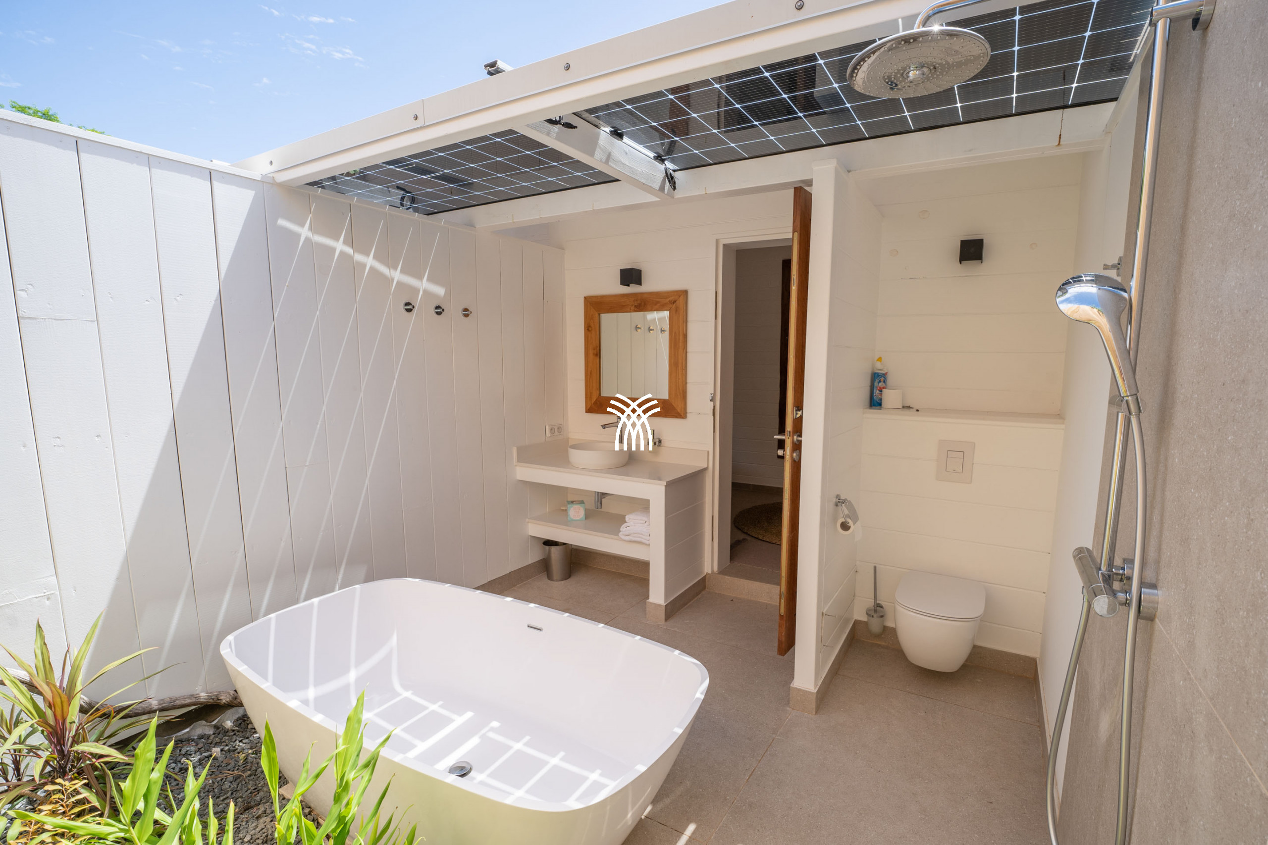 In the sleeping area, the villa features five spacious air-conditioned bedrooms and a mezzanine. Each bedroom is equipped with its own en-suite bathroom or shower and toilet, ensuring maximum comfort for all guests.