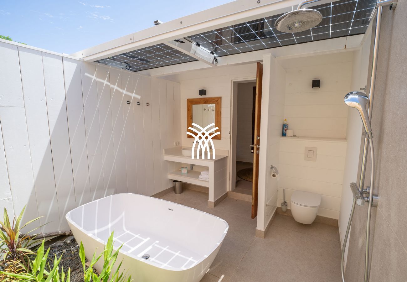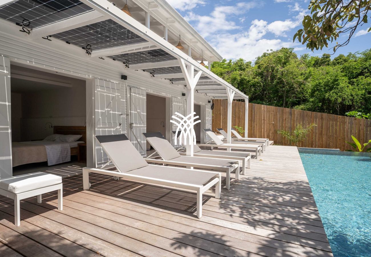 Outside, Villa Gwadaluna reveals an even more enchanting atmosphere. The uniquely shaped swimming pool bordered by a tropical wood terrace becomes the stage for sunny days and peaceful evenings. Sunbeds invite relaxation, while shaded outdoor lounges offer perfect spaces to gather, read, or enjoy a cocktail facing the garden. A large wooden table hosts outdoor meals, punctuated by the fragrances of tropical flowers and the discreet song of birds. A hammock nestled between the trees promises moments of absolute letting go, enveloped by nature.