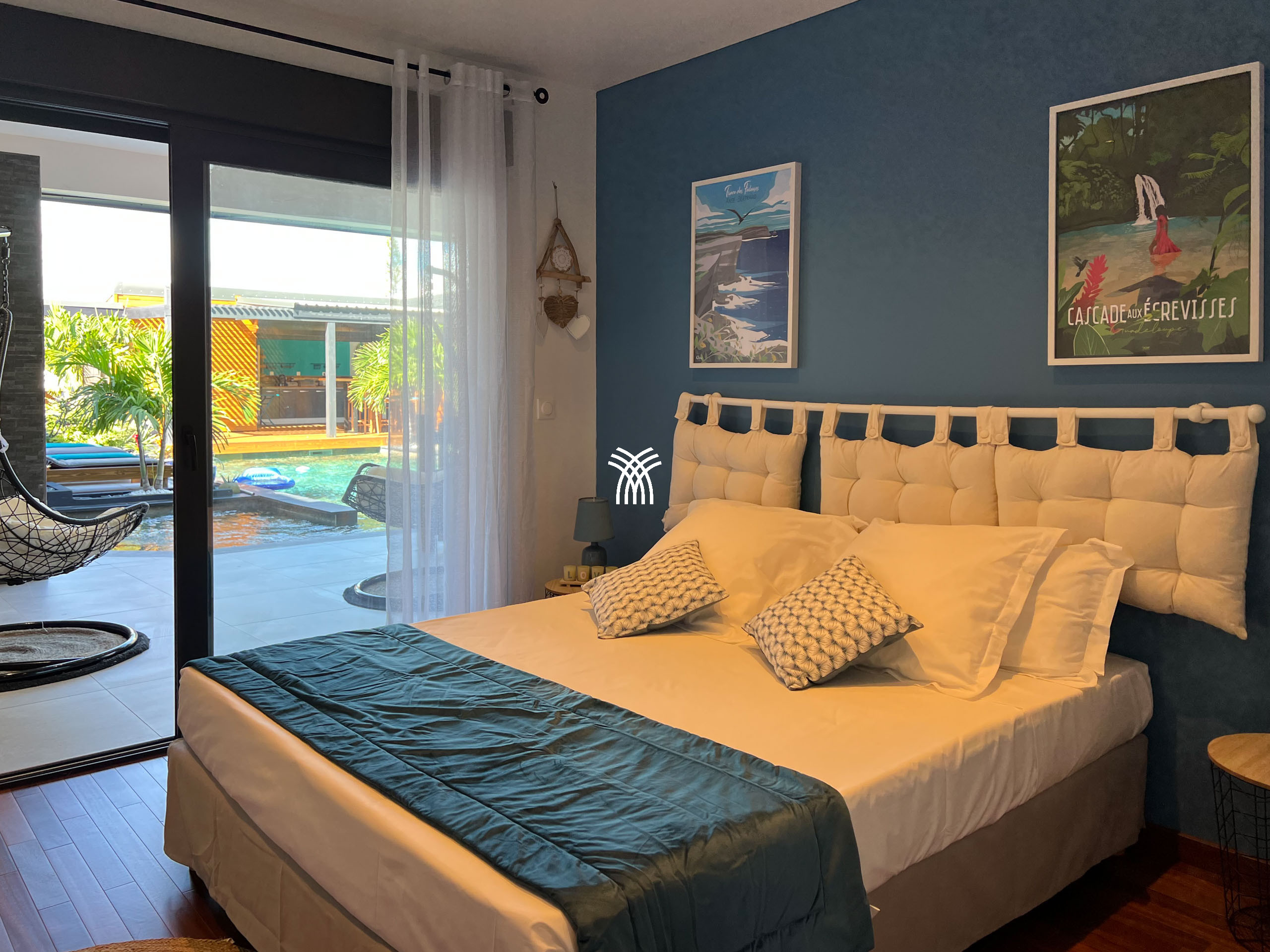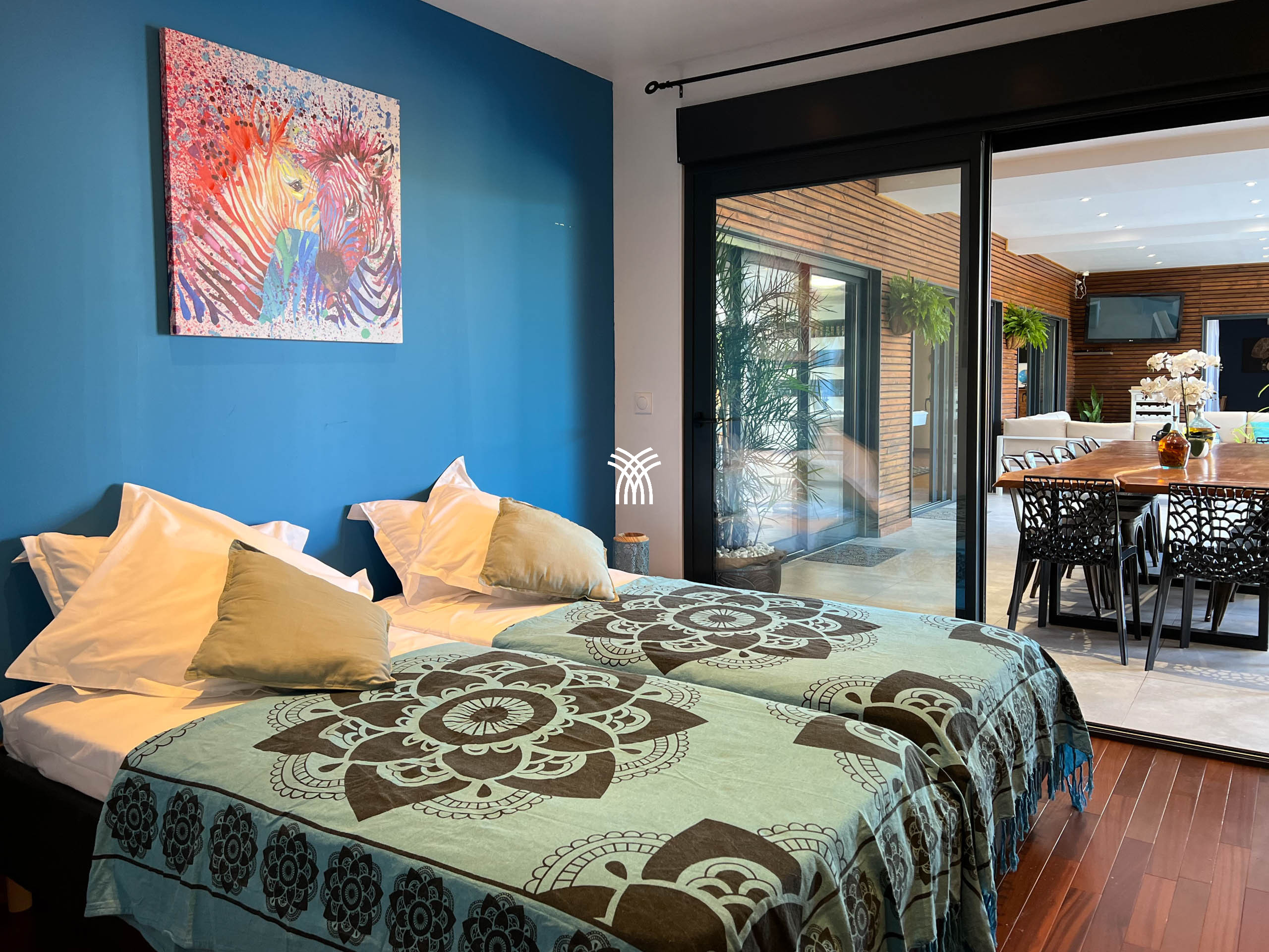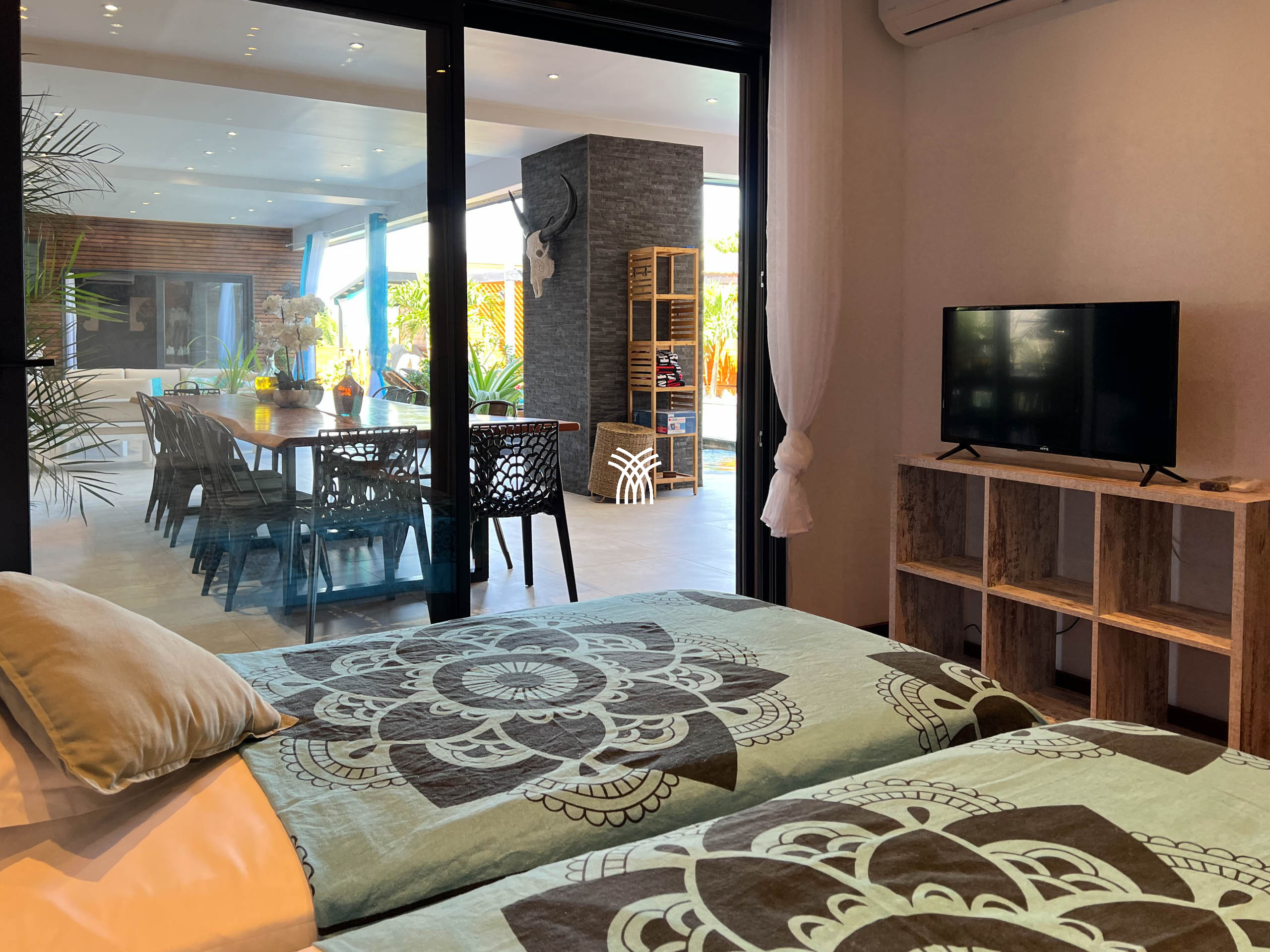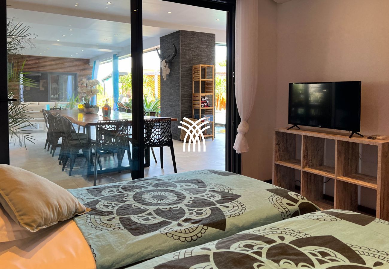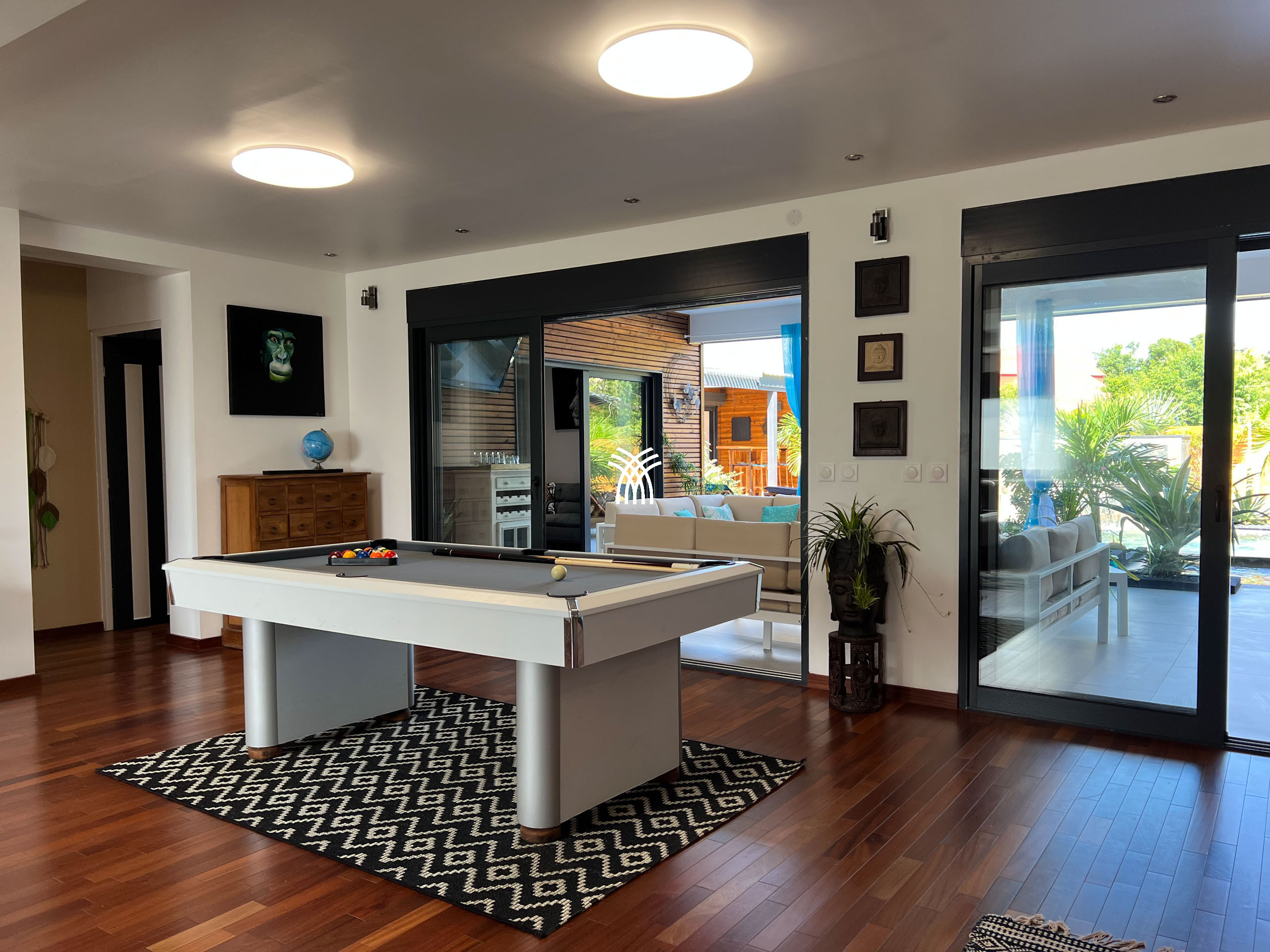 As soon as you enter, let yourself be seduced by a vast living room bathed in light, a fully equipped open kitchen where every detail has been designed for your well-being: microwave, ovens, gas and induction hobs, dishwasher, American fridge, wine cellar stocked with great vintages, champagnes and local rums at wine merchant prices. Share convivial moments in front of the 180 cm connected television or around the billiards table, in a living space of 80m² where elegance and modernity meet.