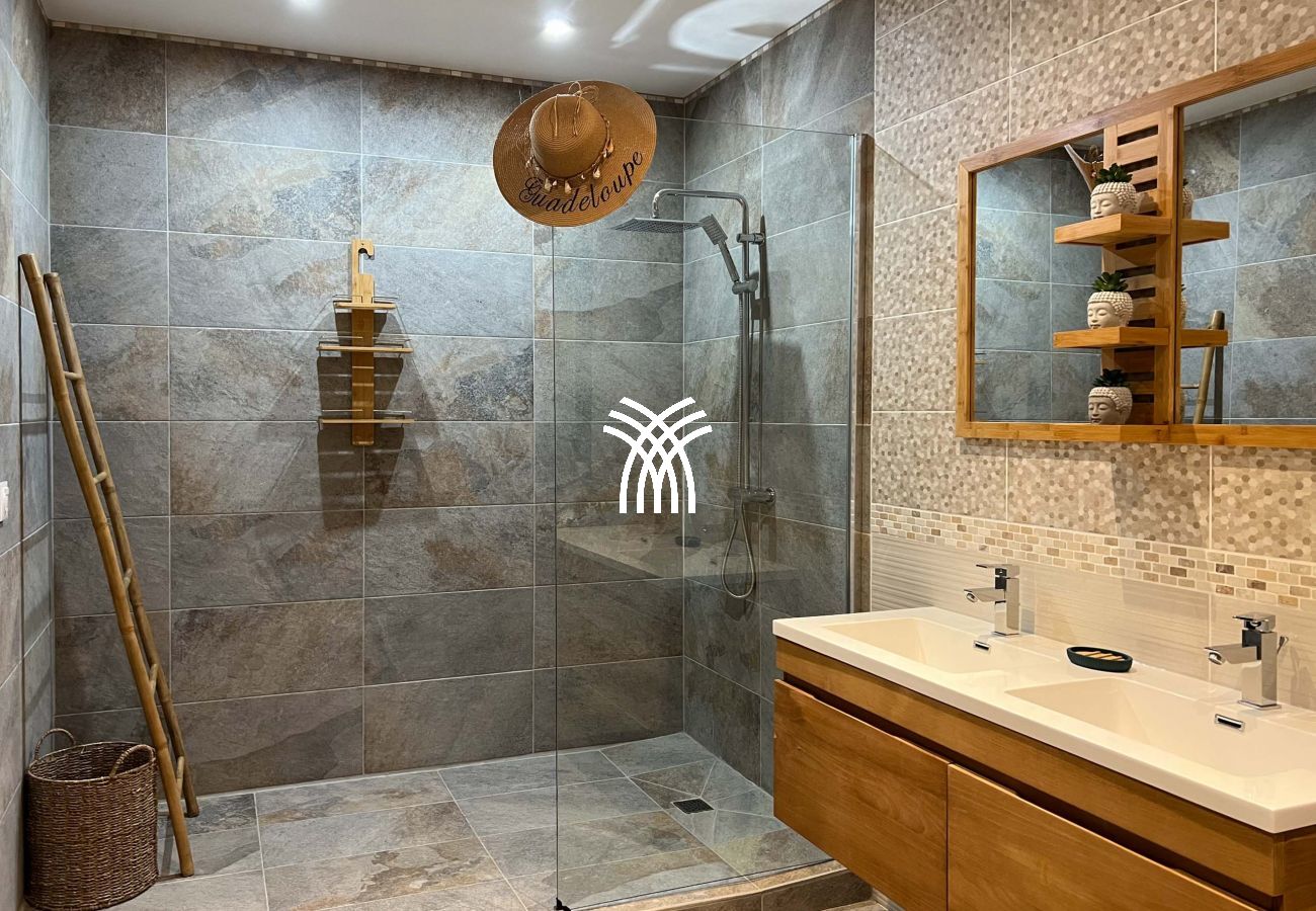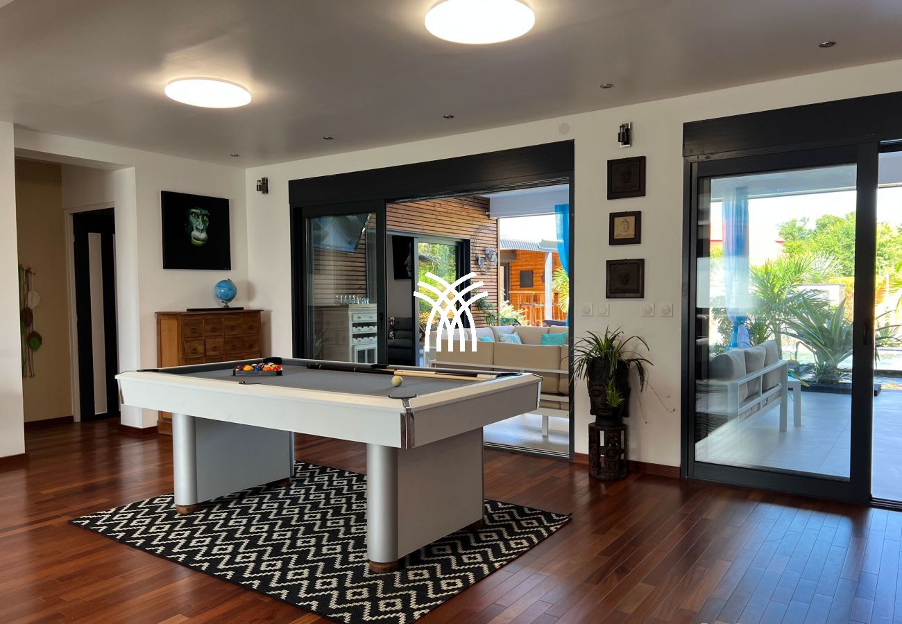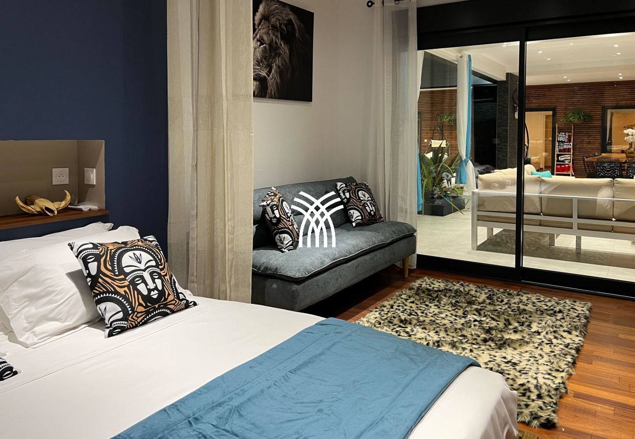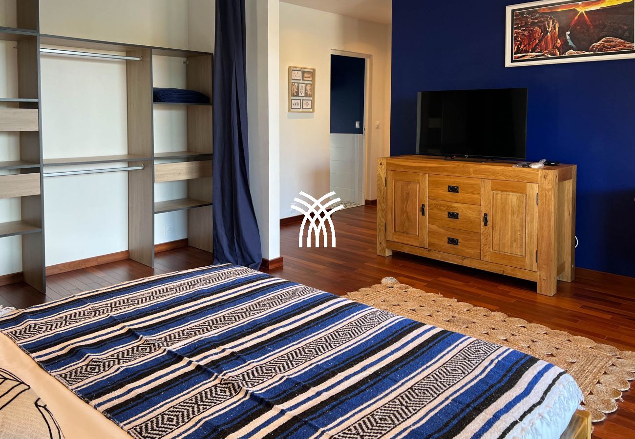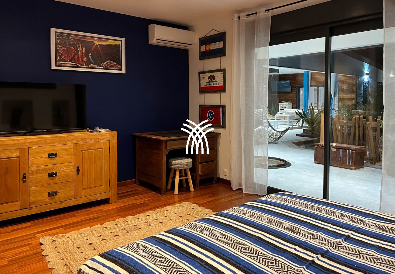 As soon as you enter, let yourself be seduced by a vast living room bathed in light, a fully equipped open kitchen where every detail has been designed for your well-being: microwave, ovens, gas and induction hobs, dishwasher, American fridge, wine cellar stocked with great vintages, champagnes and local rums at wine merchant prices. Share convivial moments in front of the 180 cm connected television or around the billiards table, in a living space of 80m² where elegance and modernity meet.