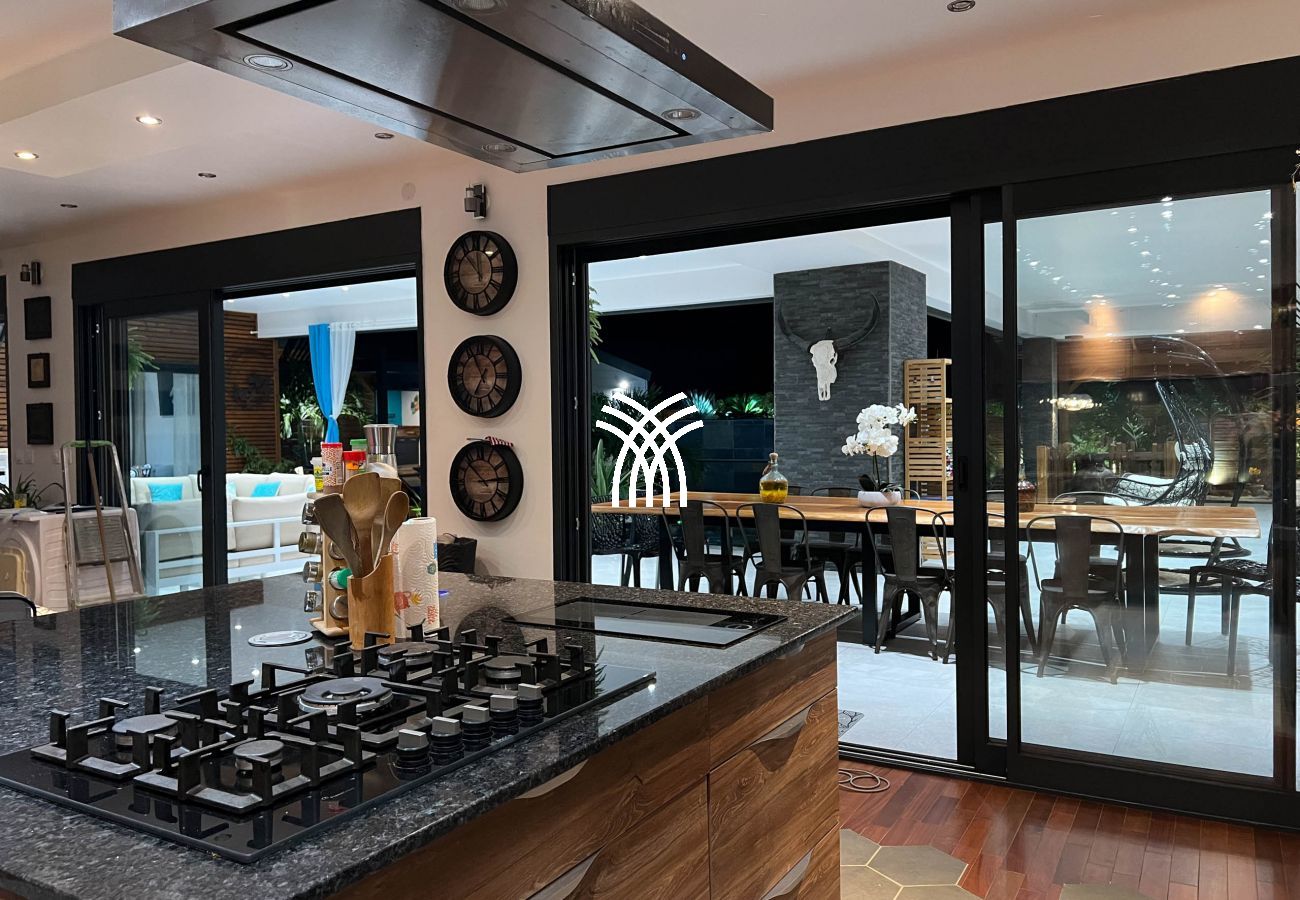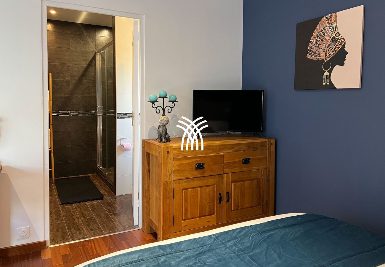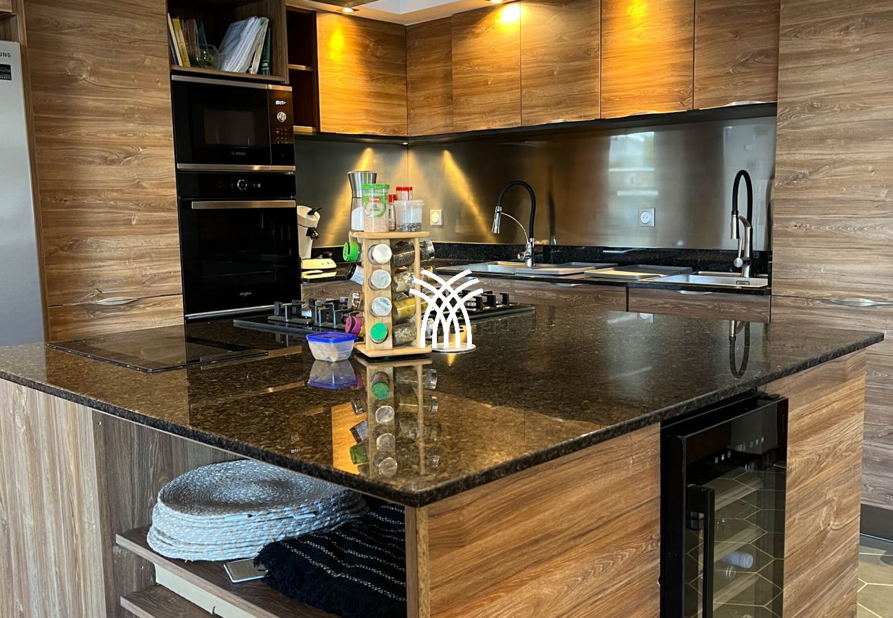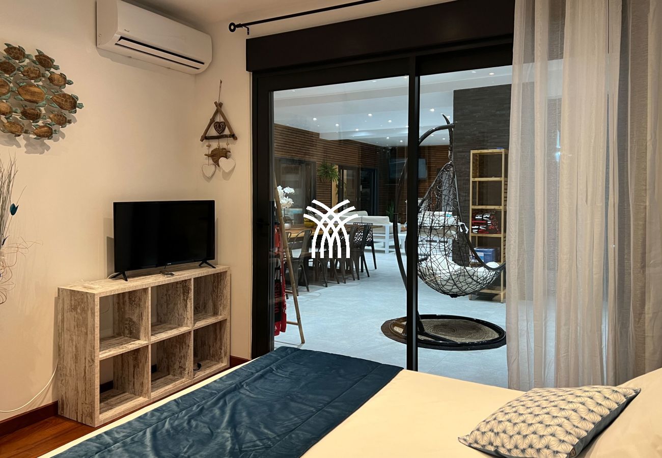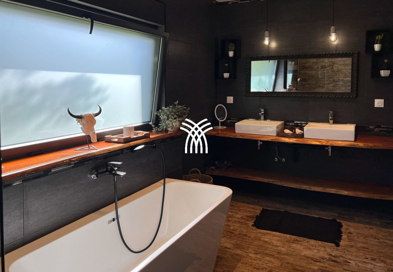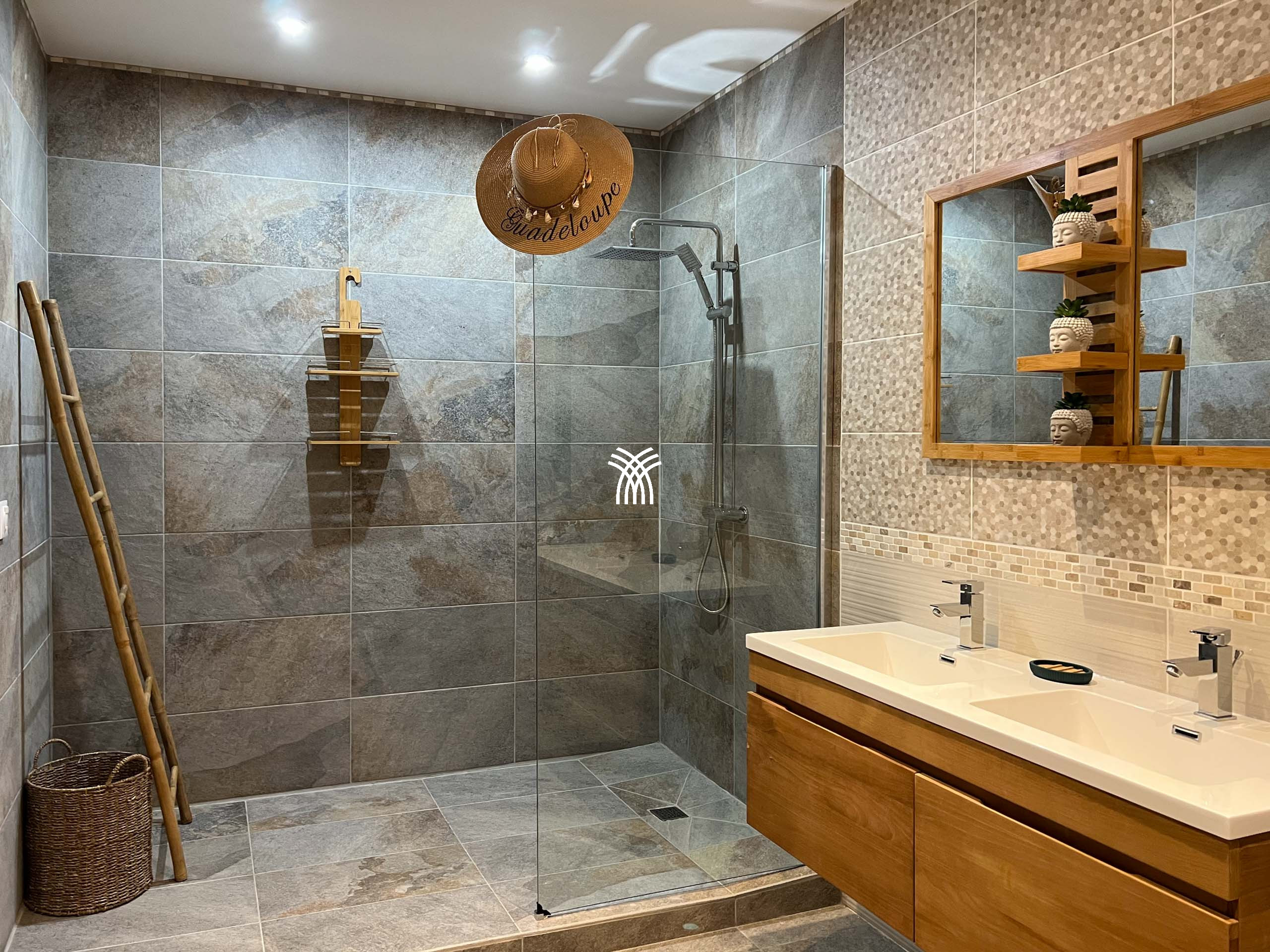 As soon as you enter, let yourself be seduced by a vast living room bathed in light, a fully equipped open kitchen where every detail has been designed for your well-being: microwave, ovens, gas and induction hobs, dishwasher, American fridge, wine cellar stocked with great vintages, champagnes and local rums at wine merchant prices. Share convivial moments in front of the 180 cm connected television or around the billiards table, in a living space of 80m² where elegance and modernity meet.
