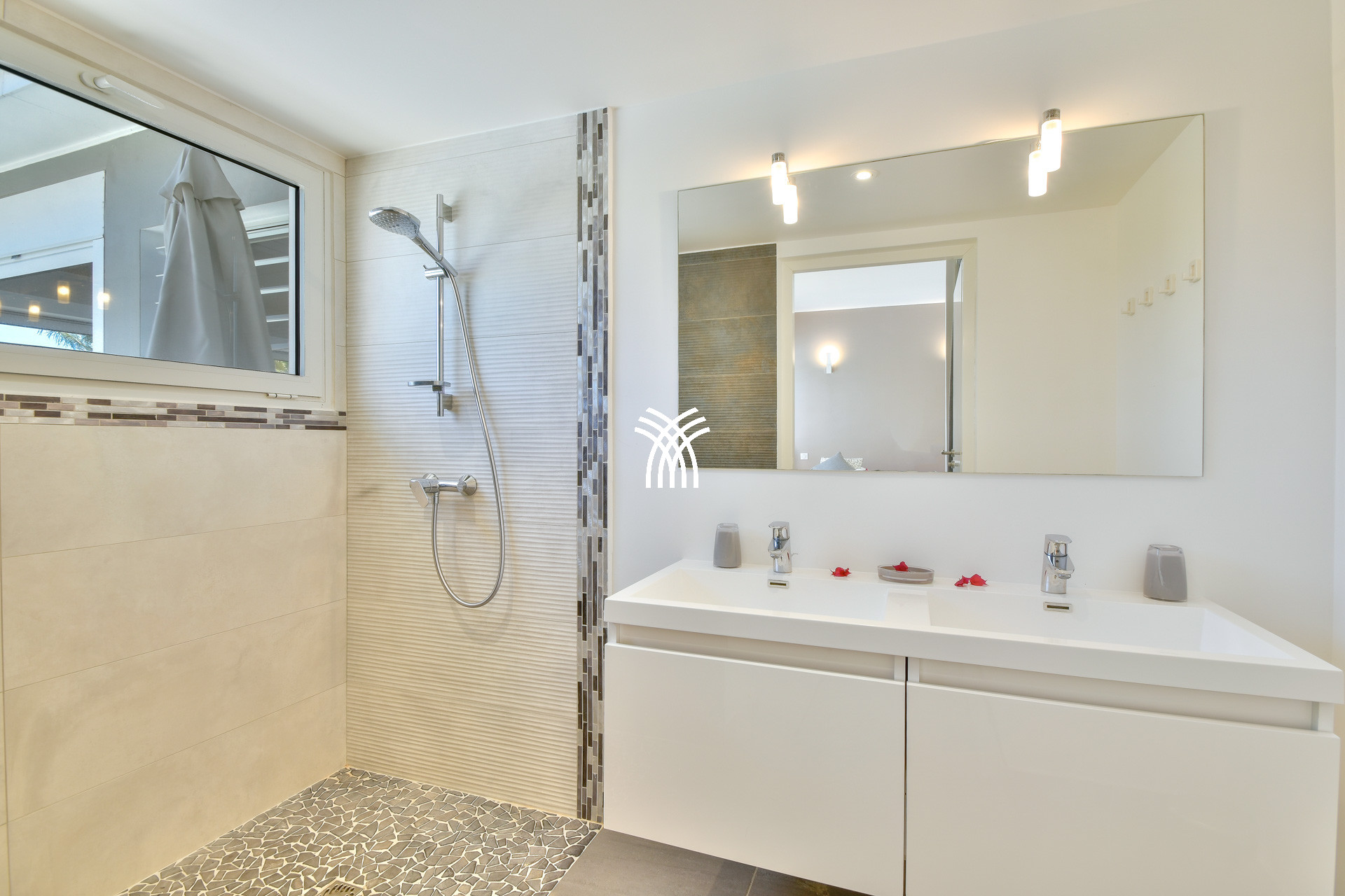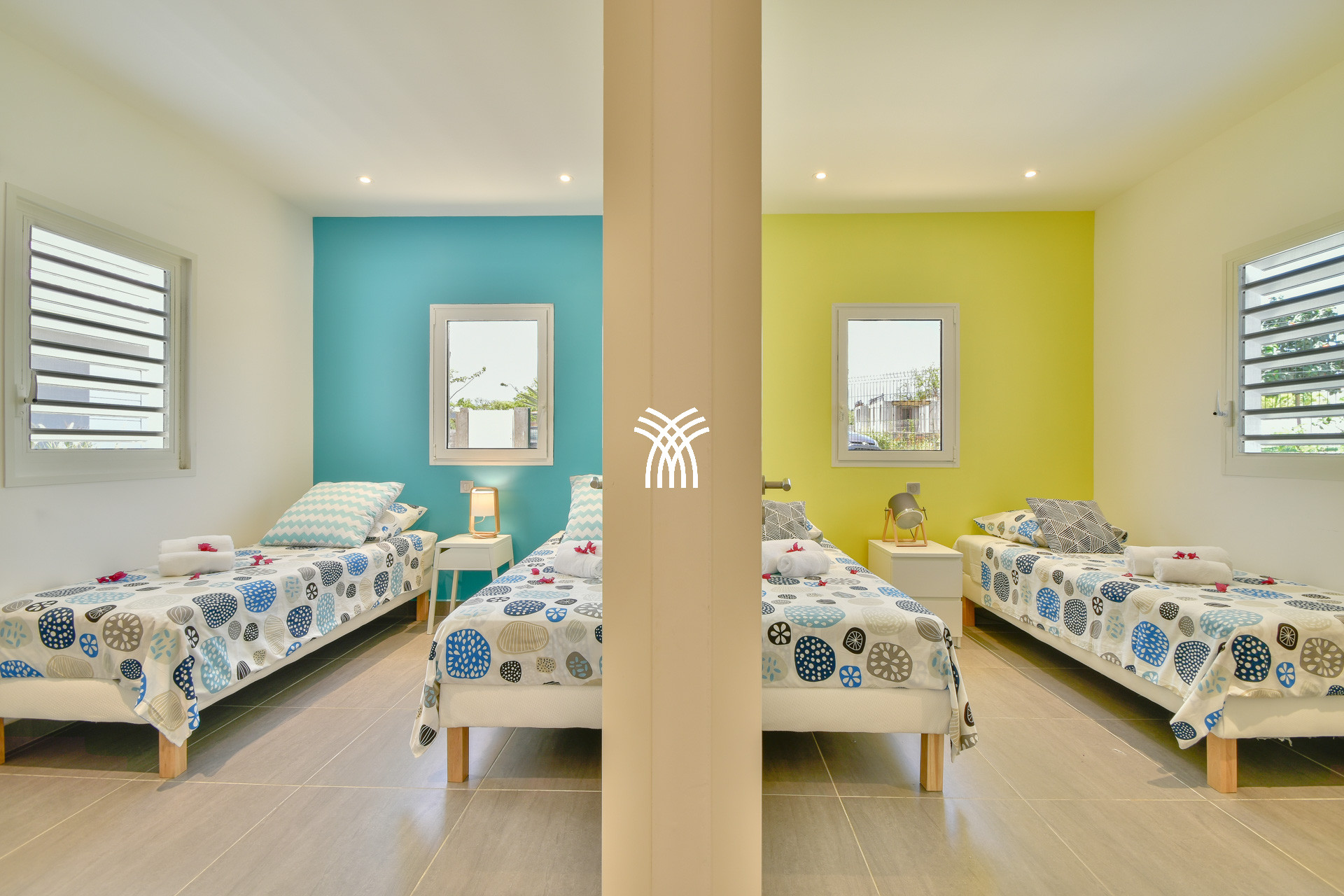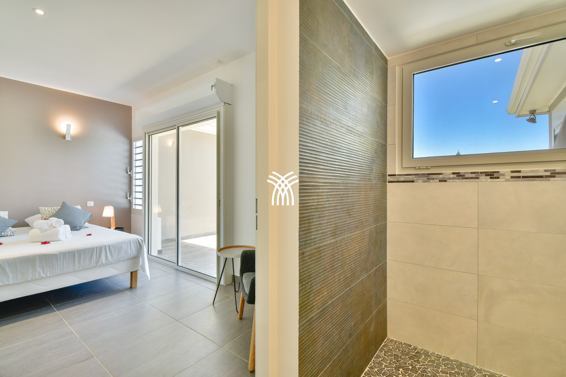 Villa Bonheur Guadeloupe is tastefully furnished with high-end model furniture. This prestigious villa features air conditioned bedrooms and four en-suite bathrooms, and can welcome up to 10 people (8 adults, 2 children) easily. The kitchen is fully equipped and you will enjoy the beautiful terrace with pool and jacuzzi at disposal .