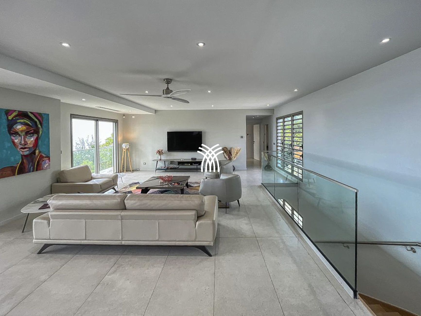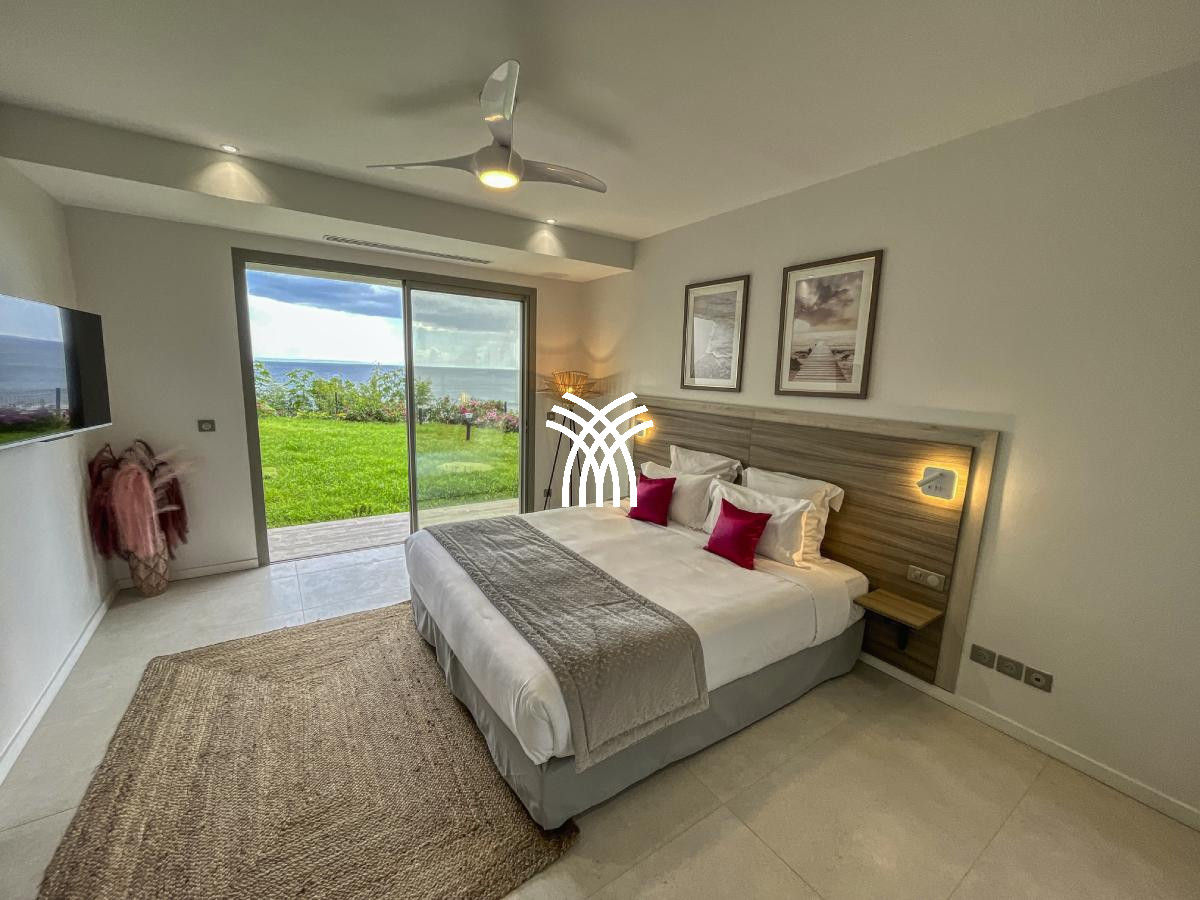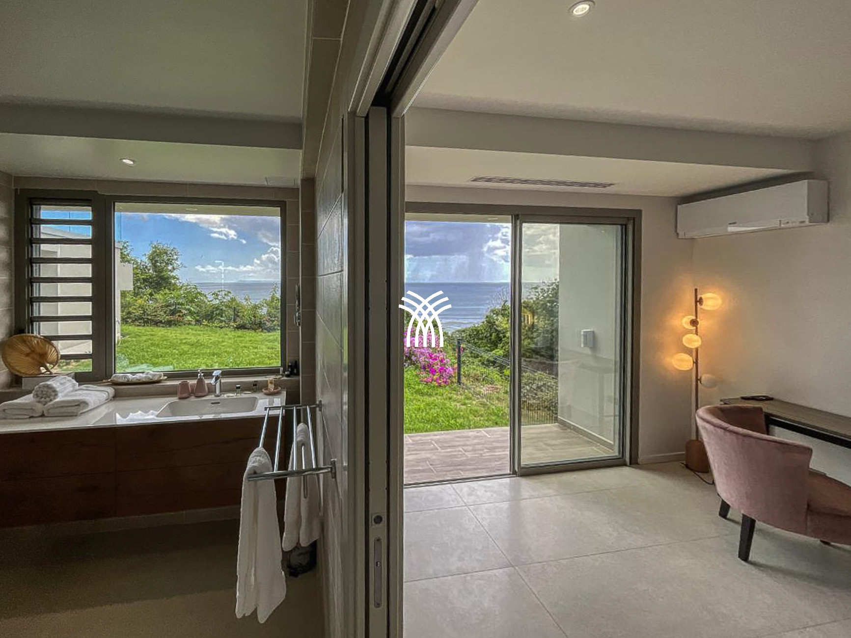 Located in a secure and prestigious residential area of the Tourist Route in Saint-François, the villa is ideal for hosting up to 6 people. Designed over two floors, it features three elegant bedrooms, each equipped with its own adjoining bathroom and offering a breathtaking sea view. One bedroom is located on the ground floor, while the other two, situated on the garden level, benefit from direct access to the terrace and swimming pool.