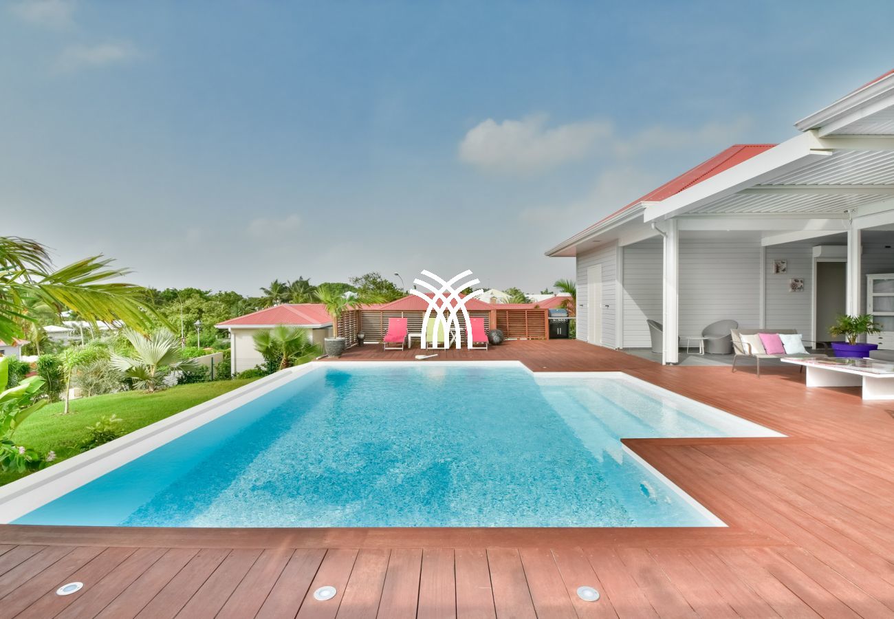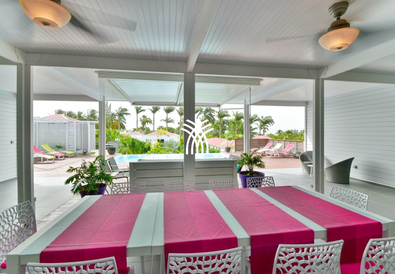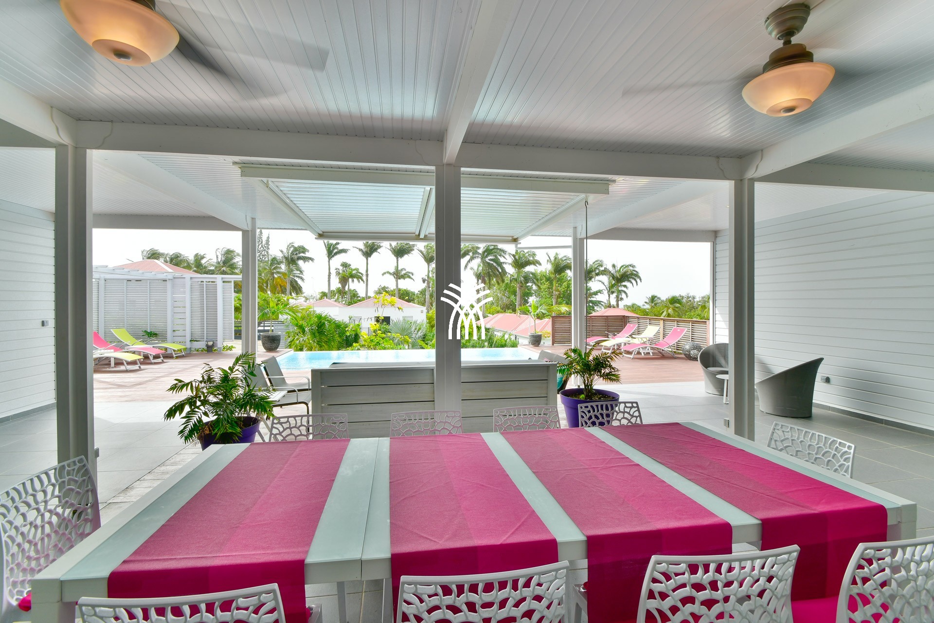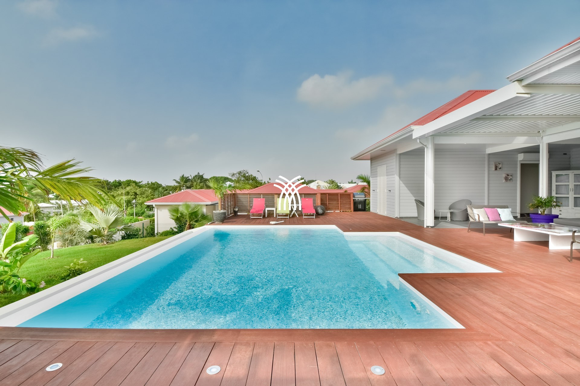Villa Katorz is a charming villa in Guadeloupe located in Saint-François, offering a panoramic sea view and a beautiful 5x10m private salt water swimming pool. Designed for peaceful stays, this villa rental in Saint-François combines modern comfort and Creole atmosphere in a lush and intimate setting. The spacious living area opens onto a covered terrace overlooking the pool and a carbet, perfect for enjoying the softness of Guadeloupean evenings facing the sea.