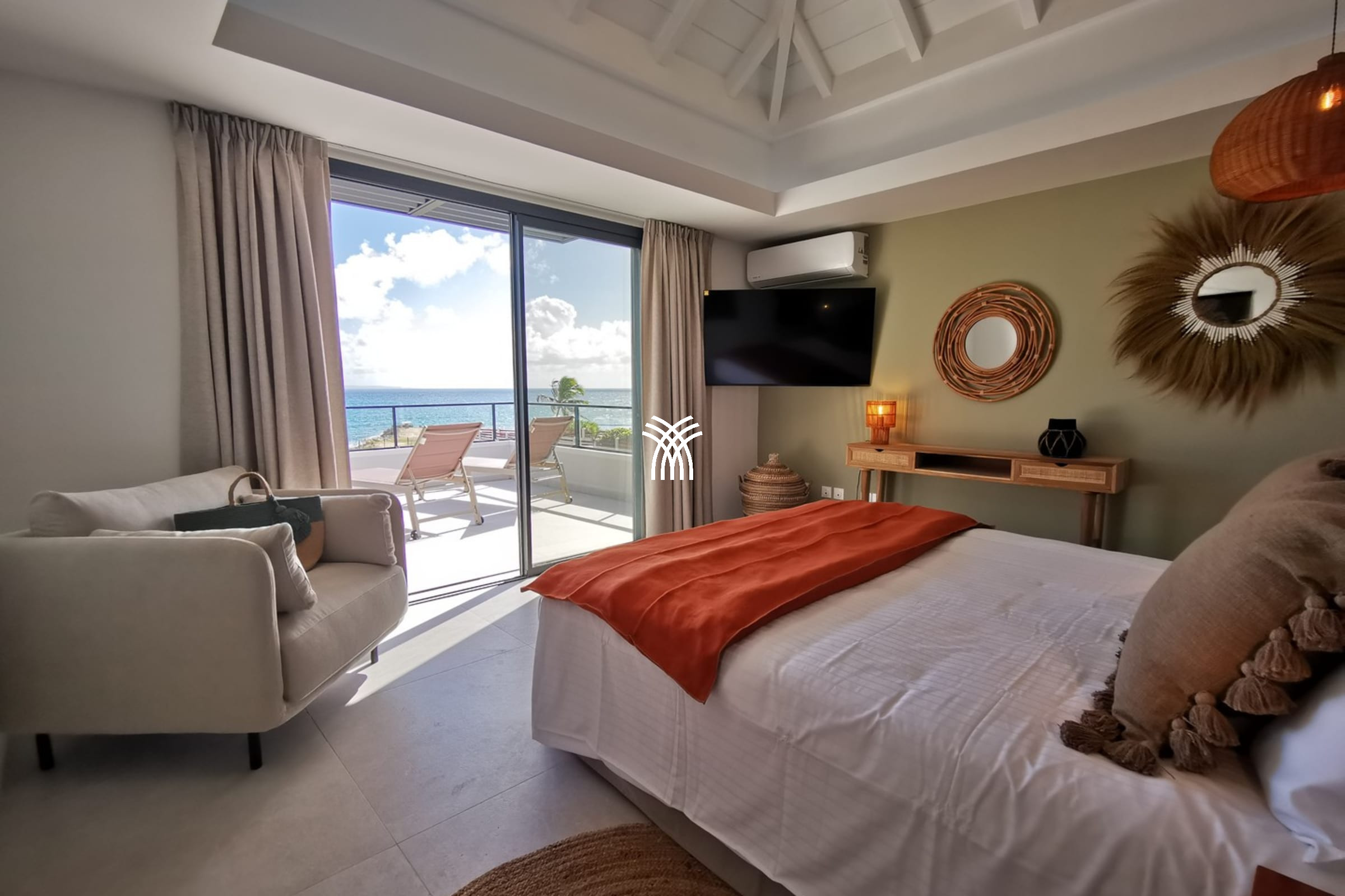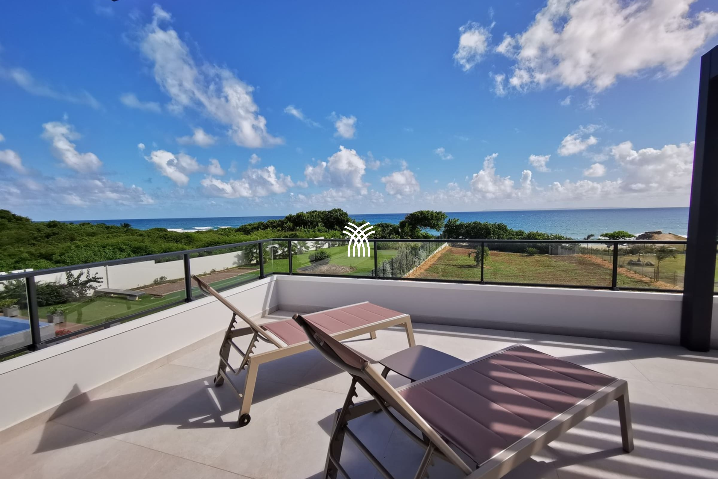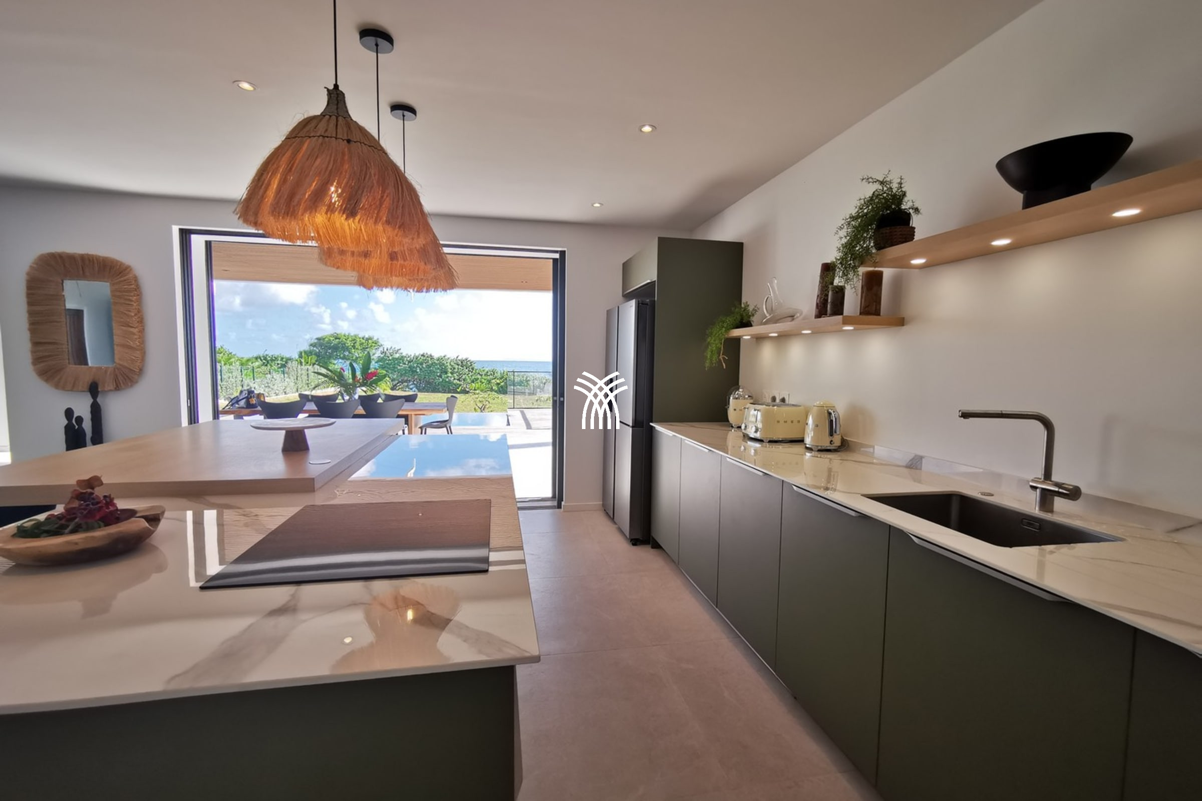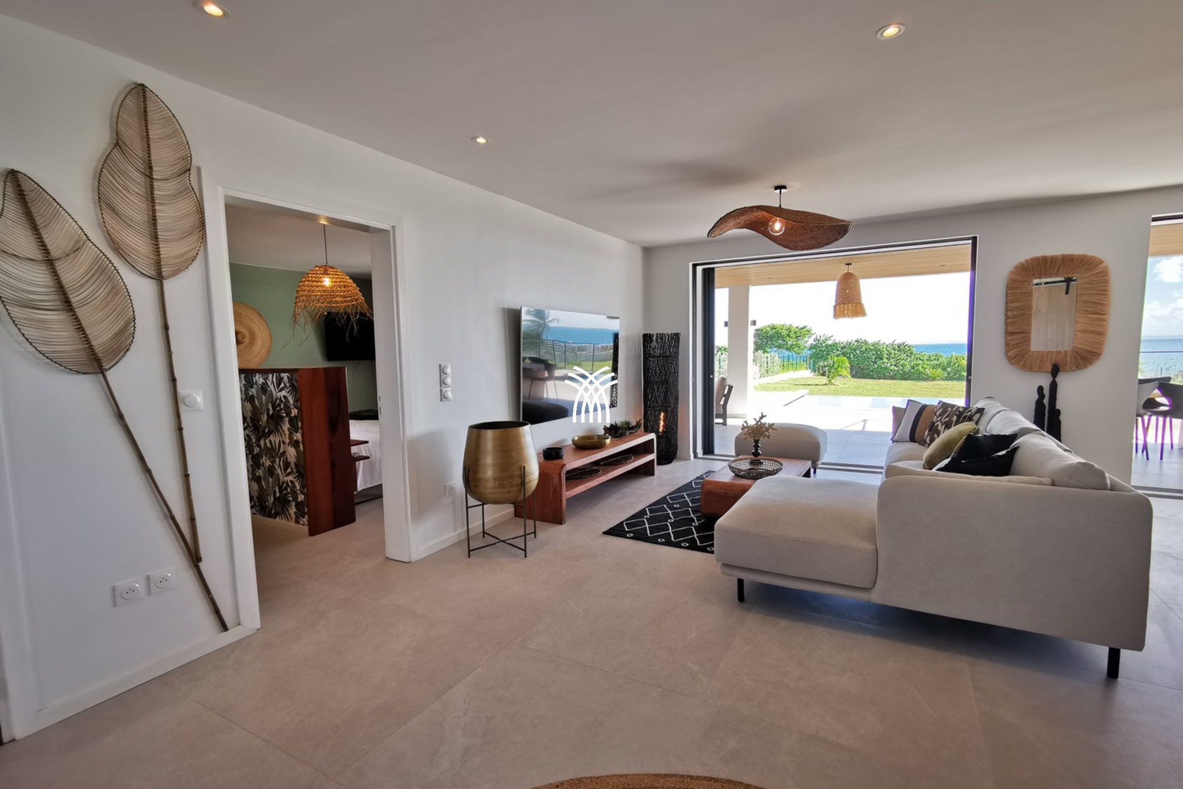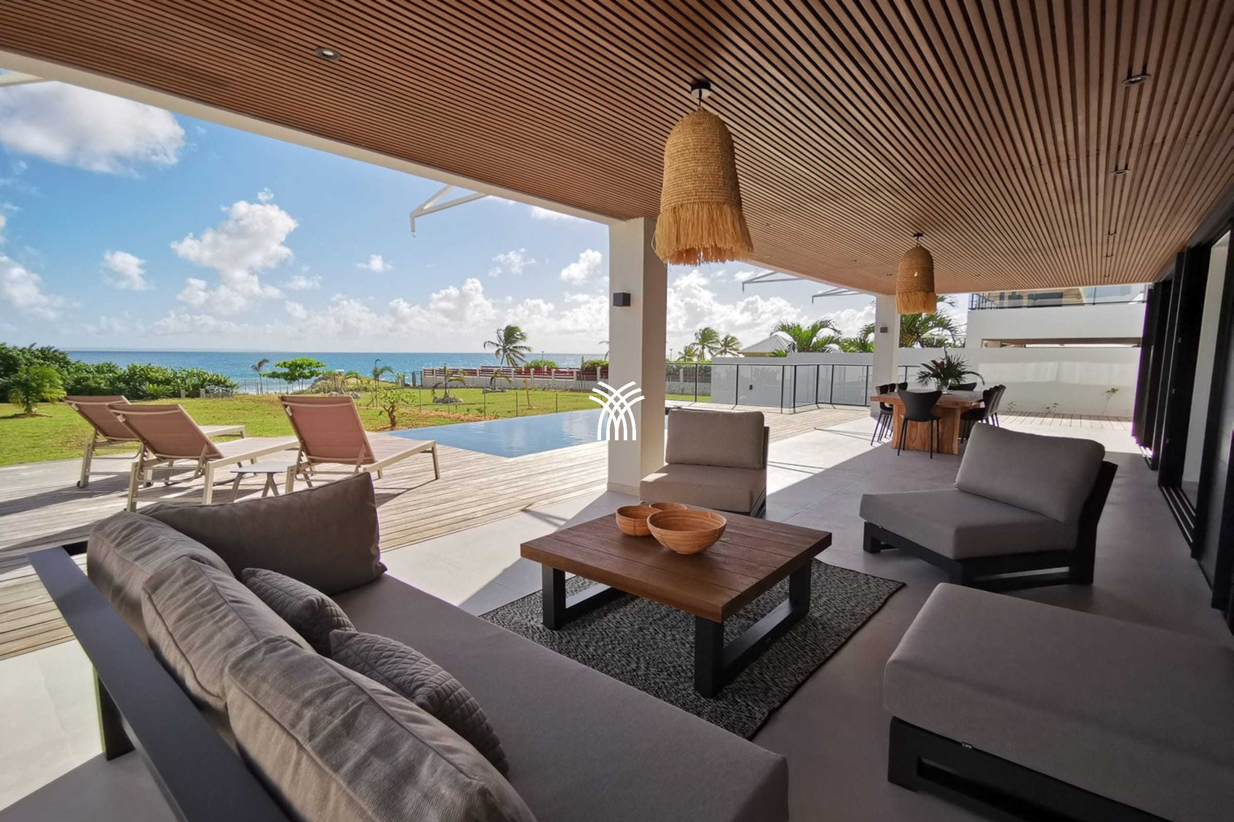 Entirely facing the sea, the villa captivates from the entrance with its luminous volumes and elegant contemporary decoration. The vast living space on the ground floor brings together a comfortable lounge and a fully equipped modern kitchen, organised around a large central island. The whole naturally opens onto the outdoor terrace, a true extension of the house, where one shares meals facing the lagoon, lulled by the trade winds. The private garden leads directly to the beach, offering a rare luxury villa rental experience in Saint-François with direct access to the sea.