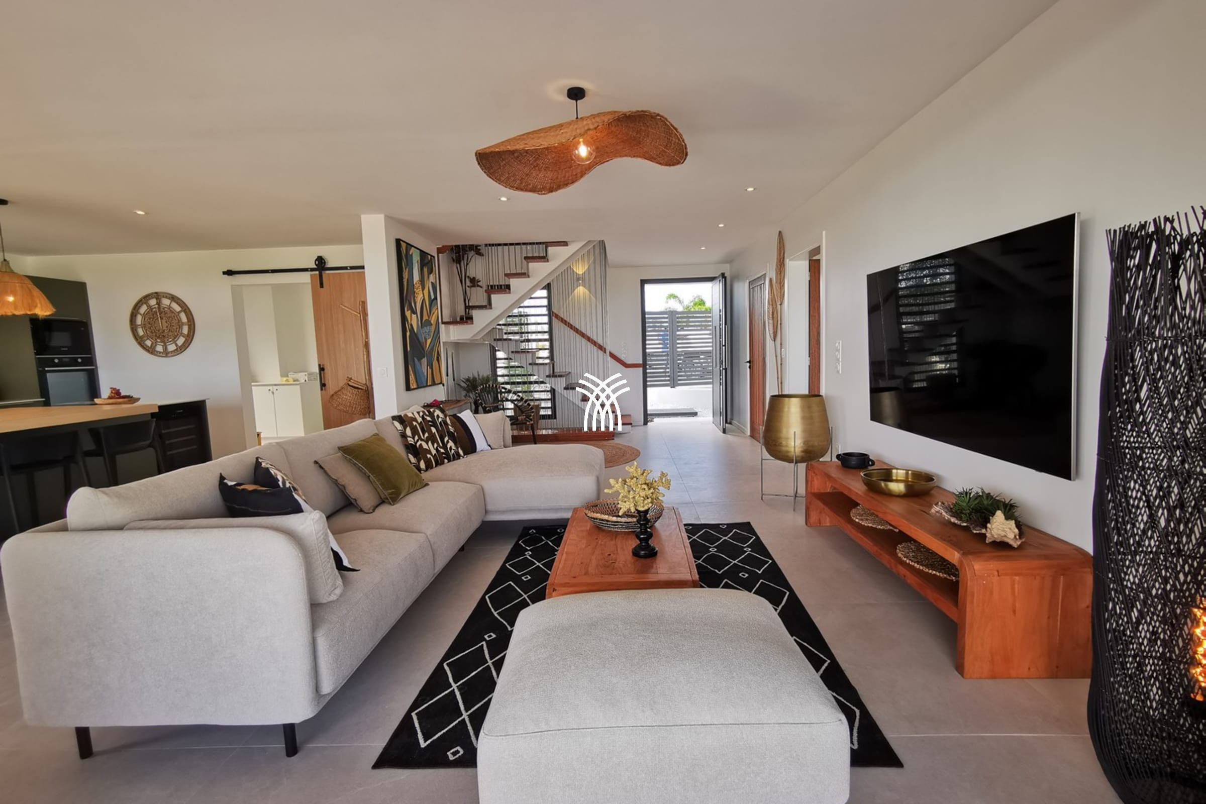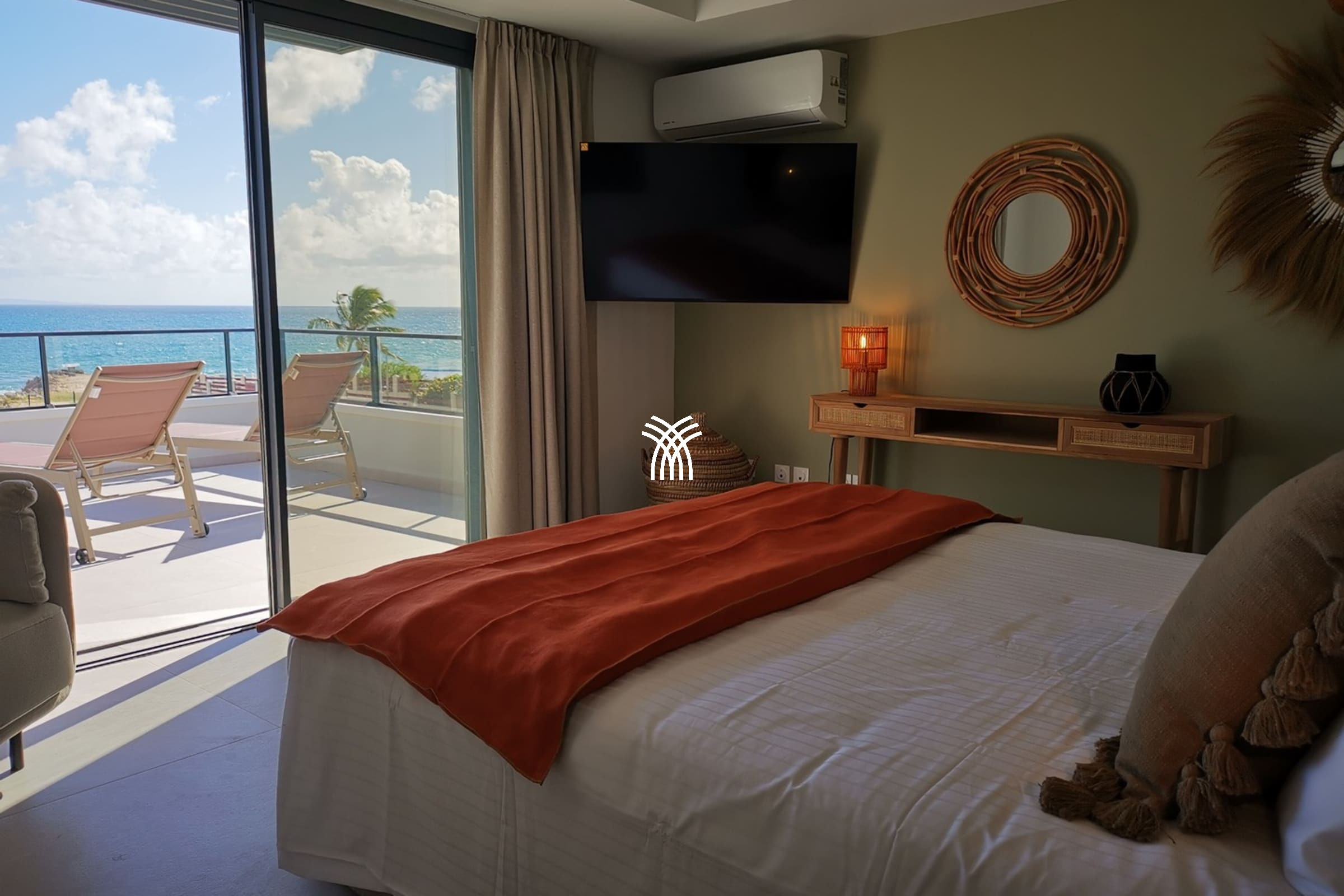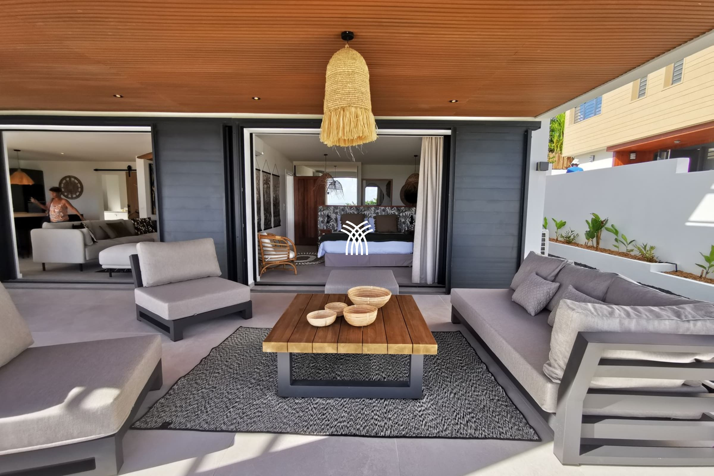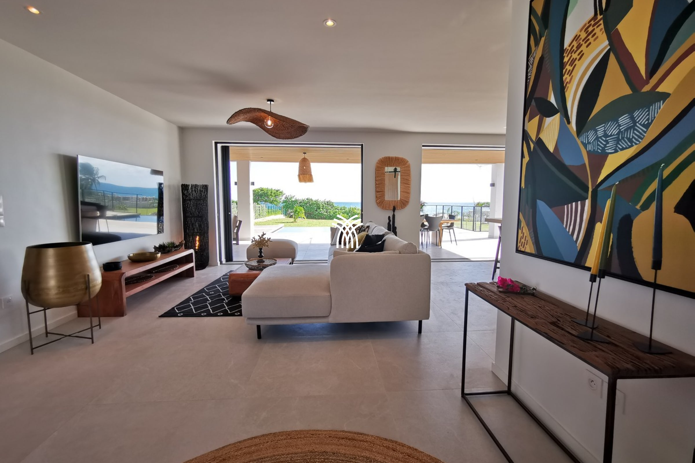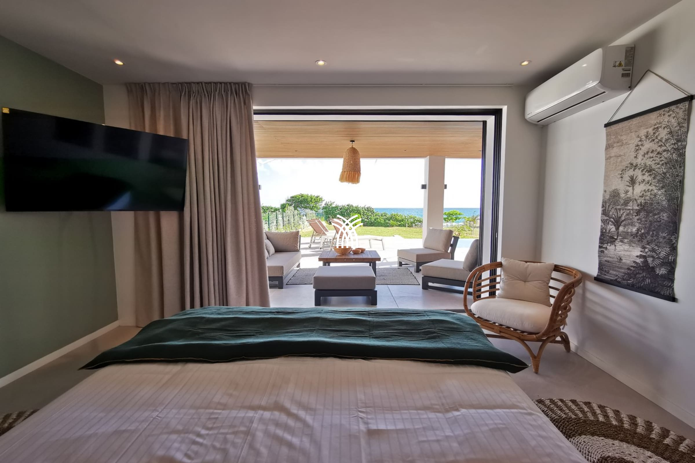 Entirely facing the sea, the villa captivates from the entrance with its luminous volumes and elegant contemporary decoration. The vast living space on the ground floor brings together a comfortable lounge and a fully equipped modern kitchen, organised around a large central island. The whole naturally opens onto the outdoor terrace, a true extension of the house, where one shares meals facing the lagoon, lulled by the trade winds. The private garden leads directly to the beach, offering a rare luxury villa rental experience in Saint-François with direct access to the sea.