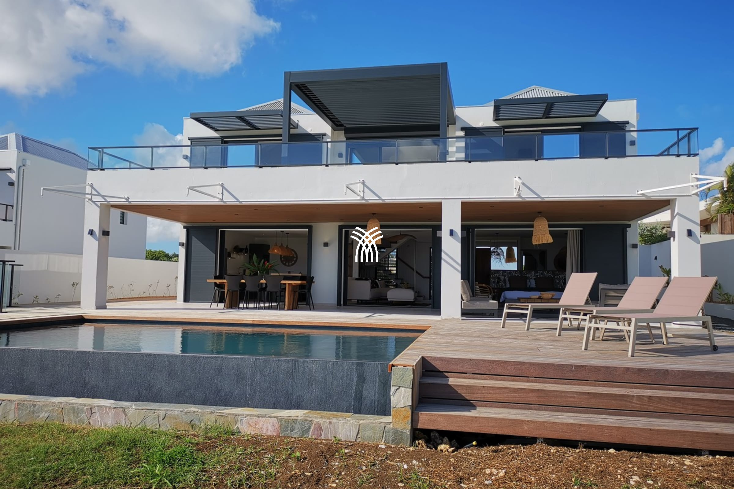 Located in the heart of the highly sought-after La Mer residence in Saint-François, Villa Isabelle embodies the Caribbean art of living in its most exclusive form. This luxury villa for rent in Guadeloupe, literally with feet in the water, benefits from direct beach access, an infinity pool facing the lagoon, and a sought-after residential environment, in the immediate vicinity of restaurants, shops, and the lively centre of Saint-François. An ideal address for a high-end stay with family or friends, combining comfort, privacy, and an exceptional panorama.
