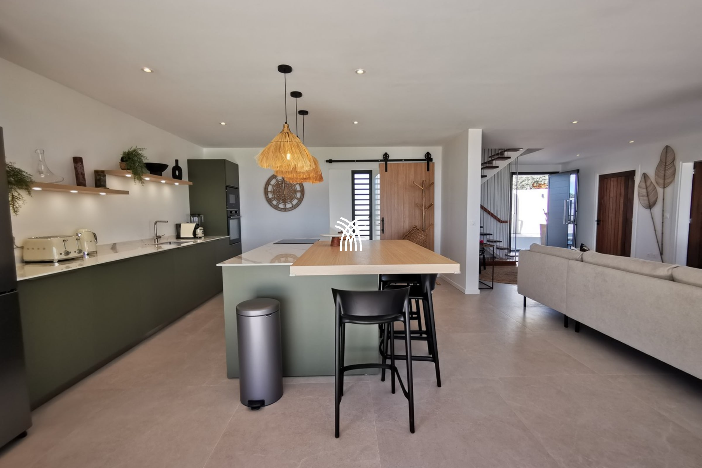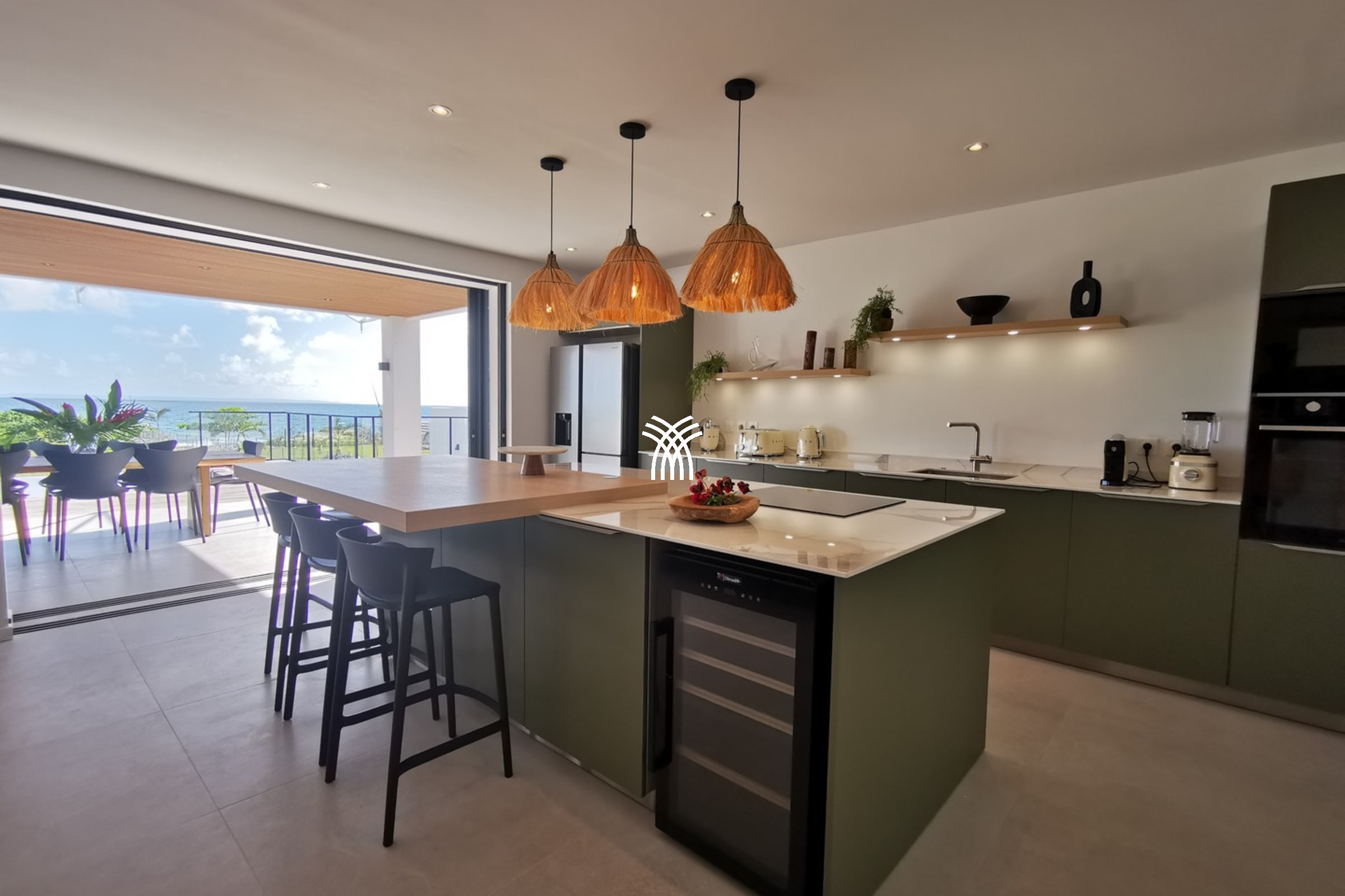 The ground floor reveals a fully equipped kitchen, open to a bright living room and an elegant dining area, all oriented towards the marine horizon. The spacious terrace is perfect for sharing convivial moments around a meal or an aperitif, while the infinity pool, visually blending into the ocean, offers an unforgettable experience of relaxation and luxury.