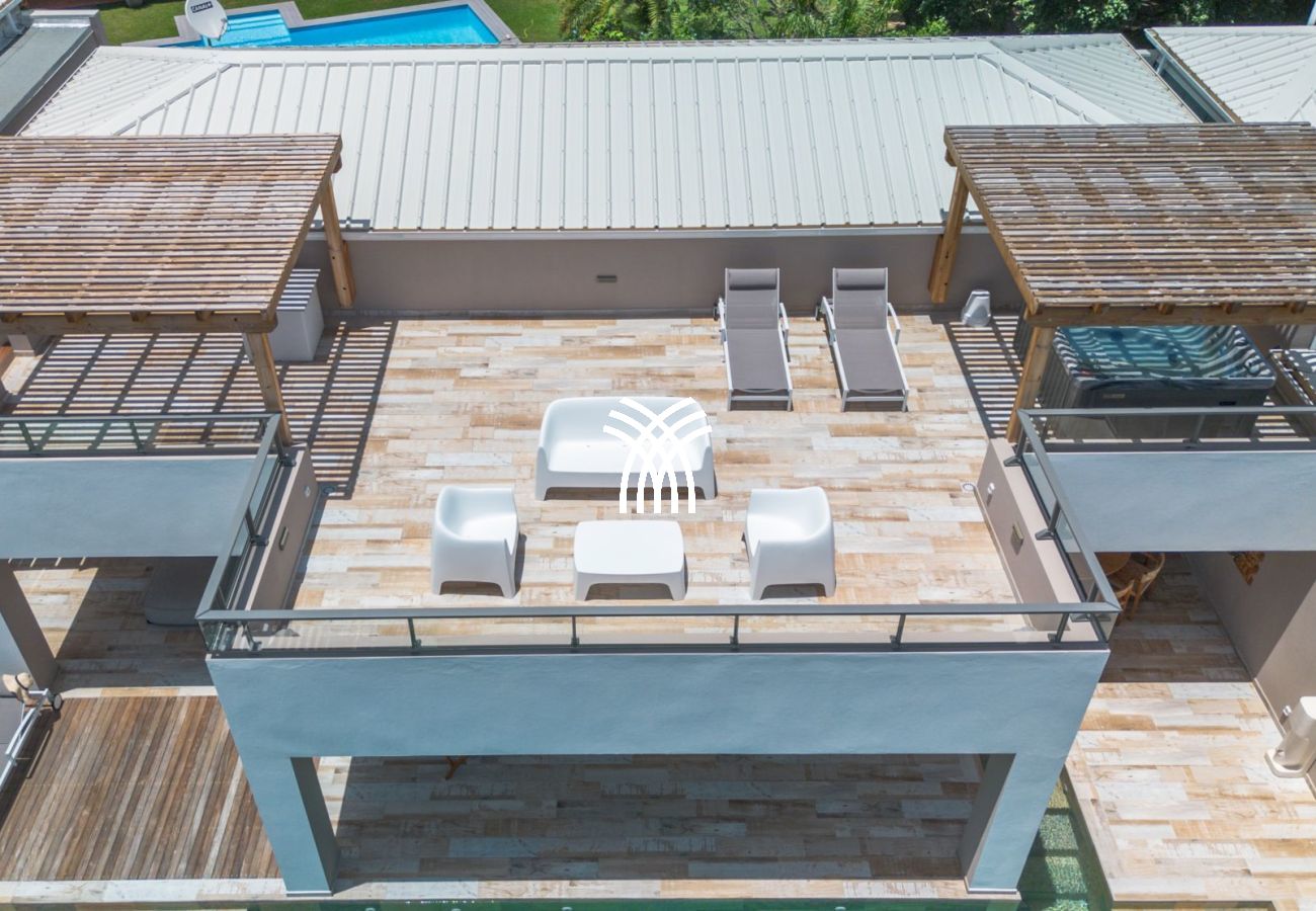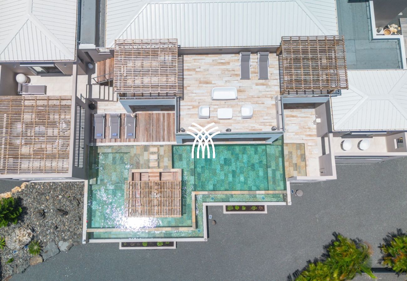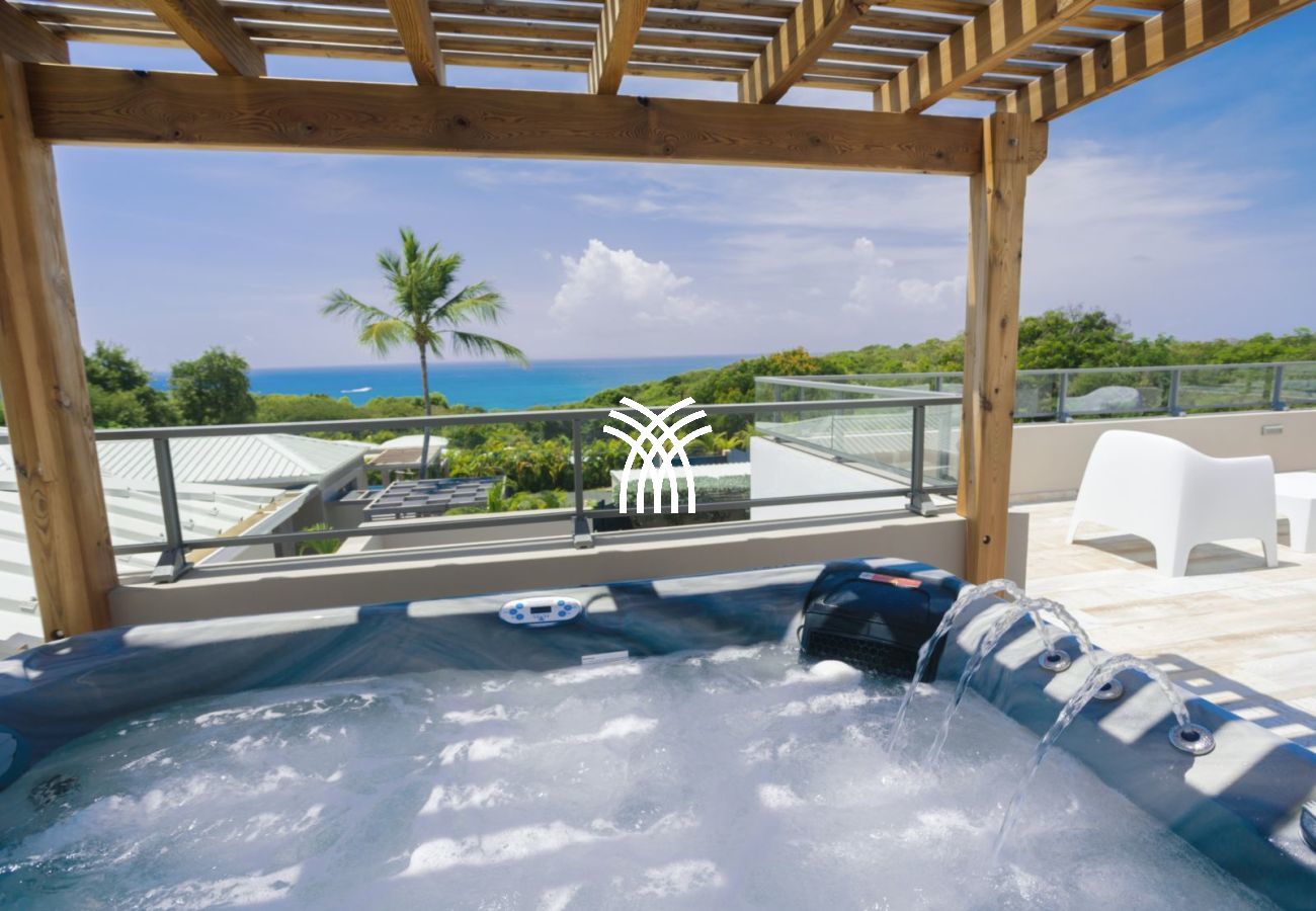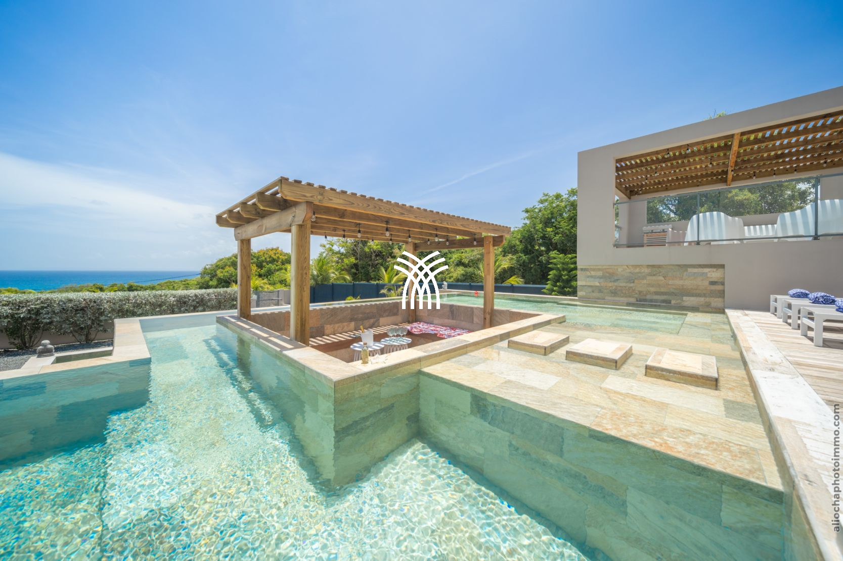 The shaded terrace naturally extends the living area, creating a convivial space to relax and enjoy the exceptional view of the Caribbean Sea. The uniquely designed pool features a suspended gazebo, ideal for unwinding to the sound of the trade winds. The rooftop terrace, accessible via two exterior staircases, offers a 360° panoramic view of the archipelago and houses a jacuzzi, perfect for admiring sunsets and stargazing in a magical setting.