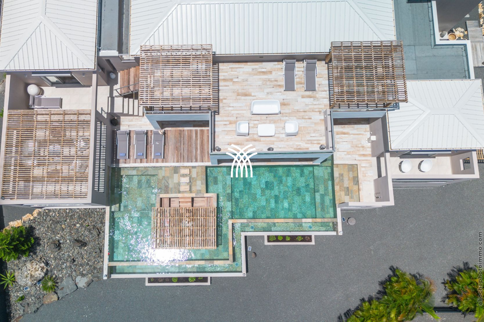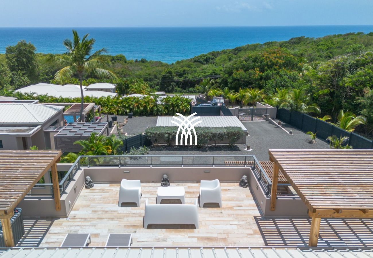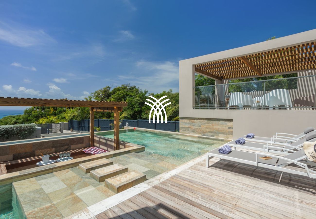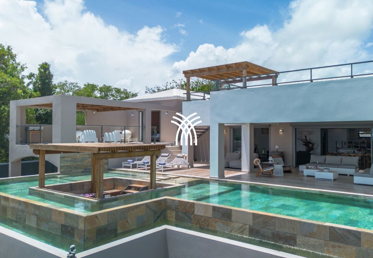 The shaded terrace naturally extends the living area, creating a convivial space to relax and enjoy the exceptional view of the Caribbean Sea. The uniquely designed pool features a suspended gazebo, ideal for unwinding to the sound of the trade winds. The rooftop terrace, accessible via two exterior staircases, offers a 360° panoramic view of the archipelago and houses a jacuzzi, perfect for admiring sunsets and stargazing in a magical setting.