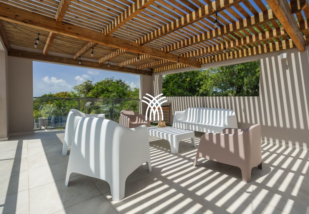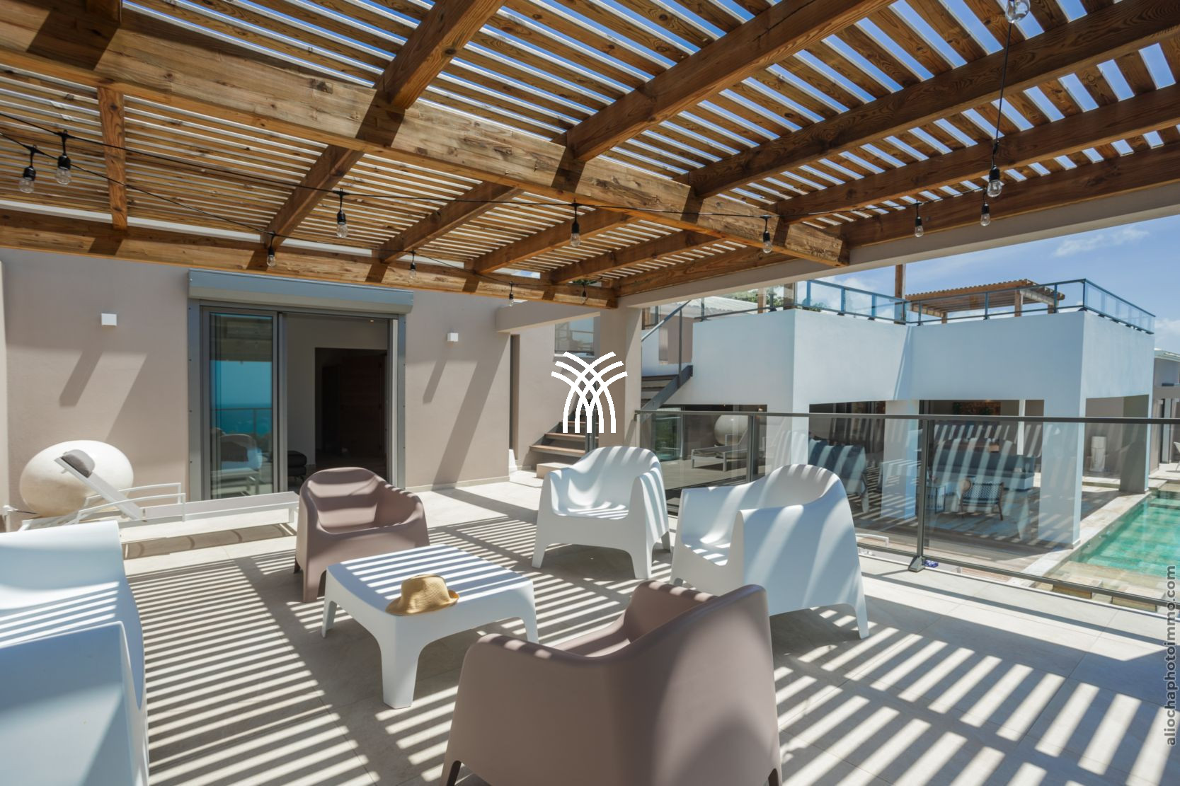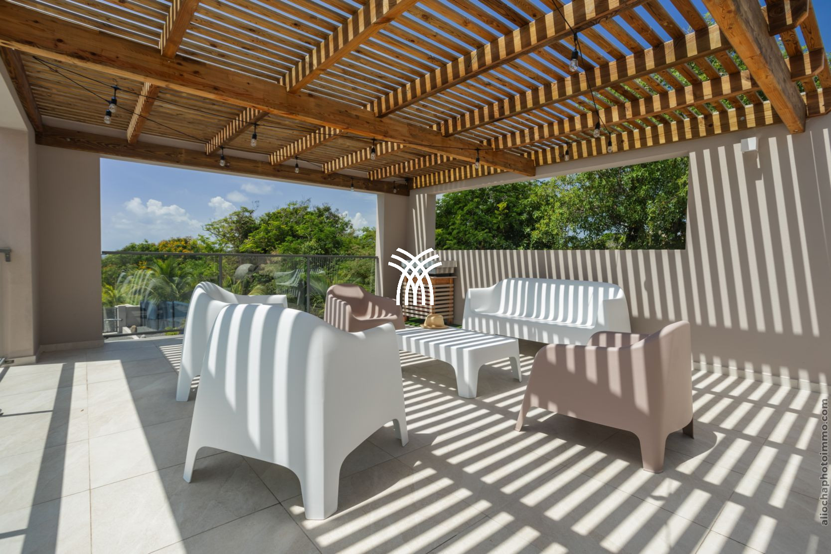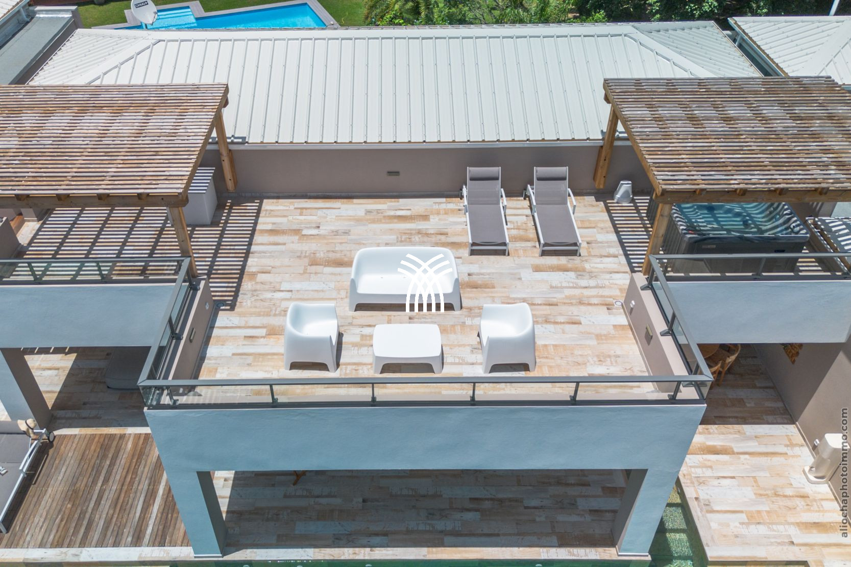 The shaded terrace naturally extends the living area, creating a convivial space to relax and enjoy the exceptional view of the Caribbean Sea. The uniquely designed pool features a suspended gazebo, ideal for unwinding to the sound of the trade winds. The rooftop terrace, accessible via two exterior staircases, offers a 360° panoramic view of the archipelago and houses a jacuzzi, perfect for admiring sunsets and stargazing in a magical setting.