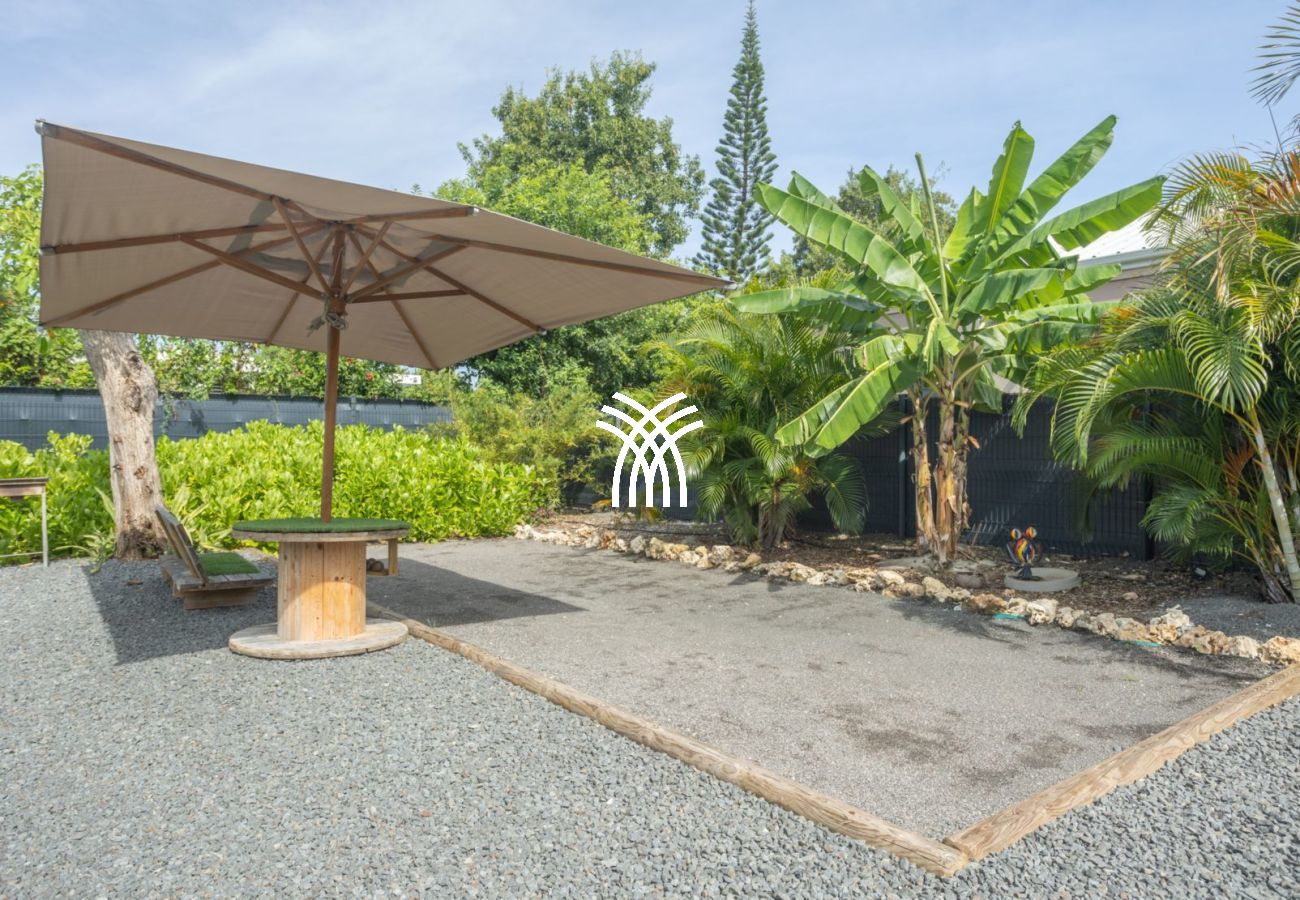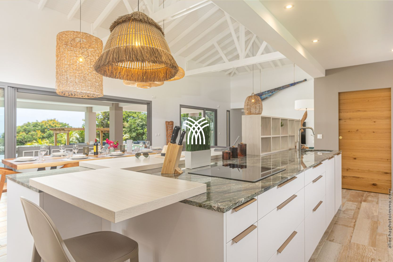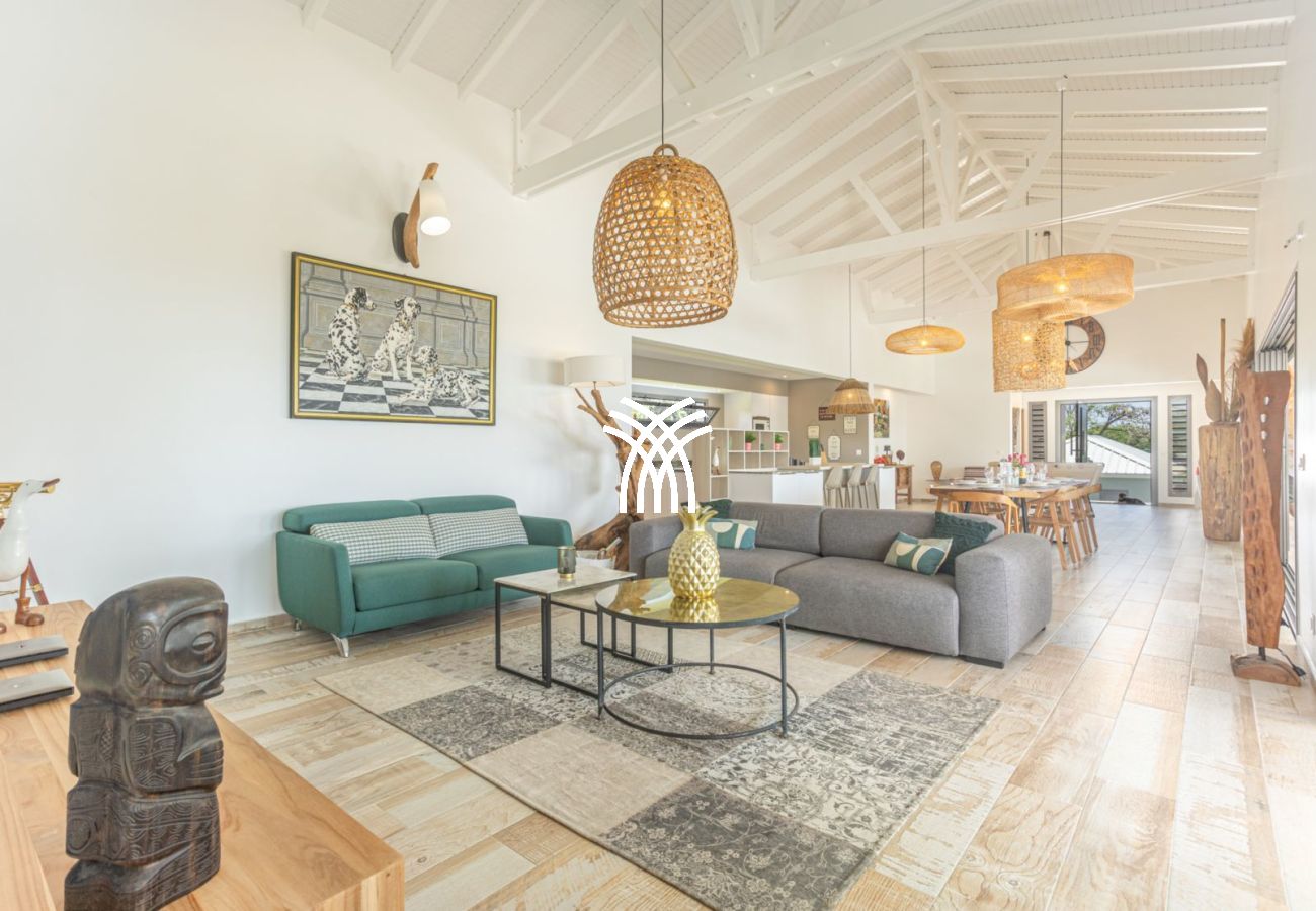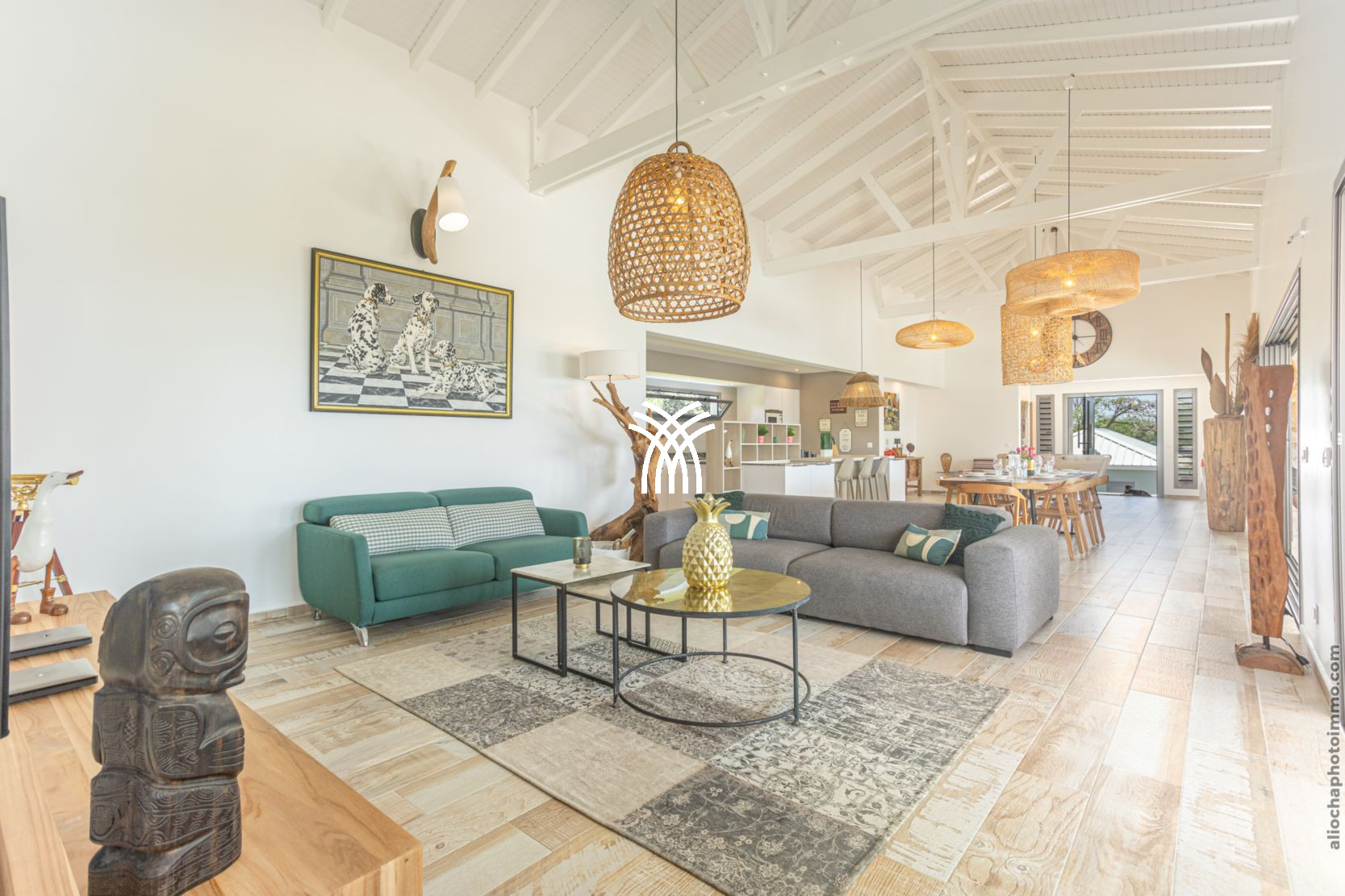The outdoor space of Villa Abawak is ideal for gathering with family or friends. The covered terrace allows sharing meals with a view of the salt water pool and tropical garden. The private carbet is perfect for relaxing around a ti-punch or local specialties.
