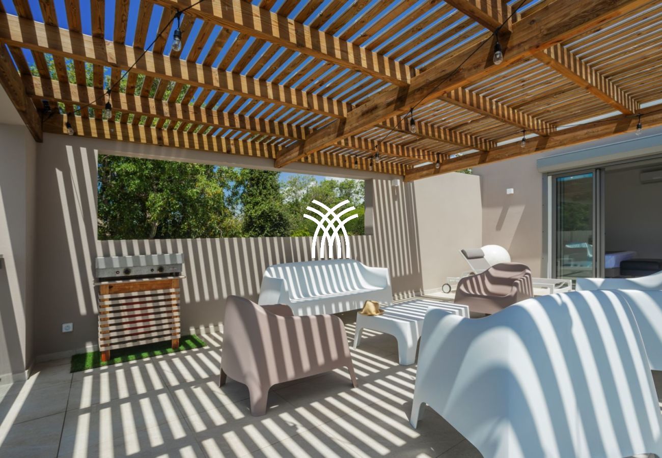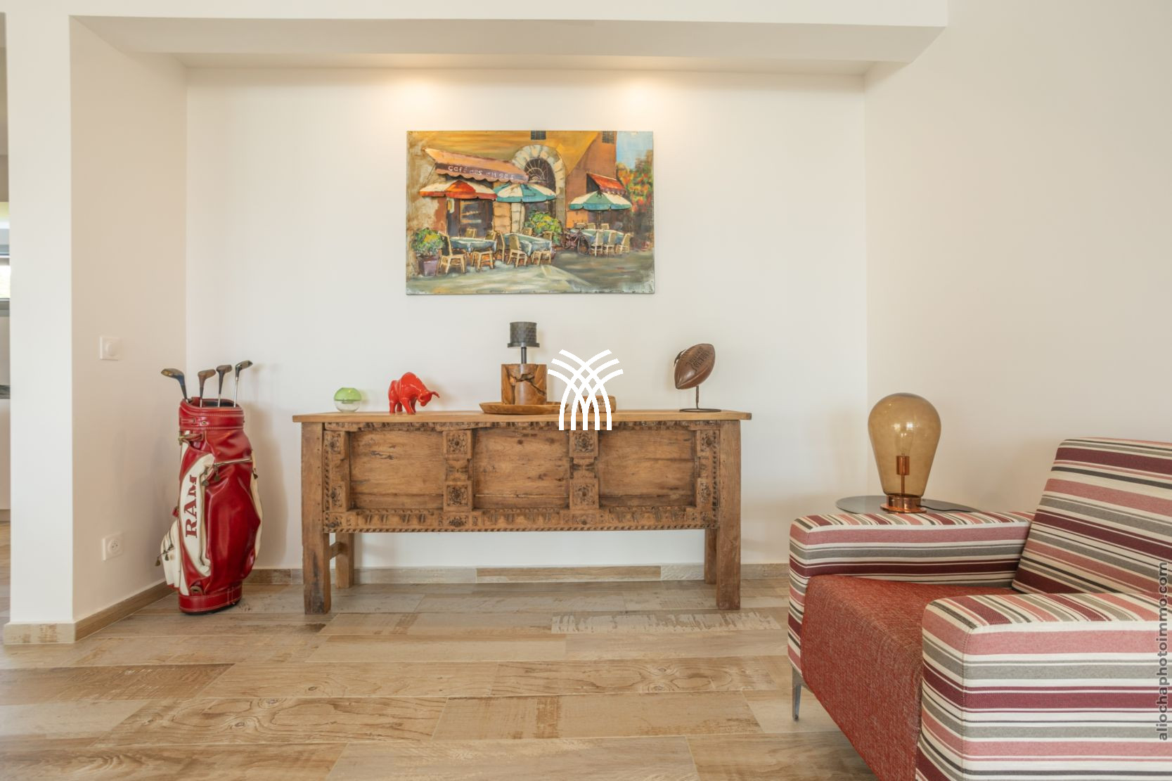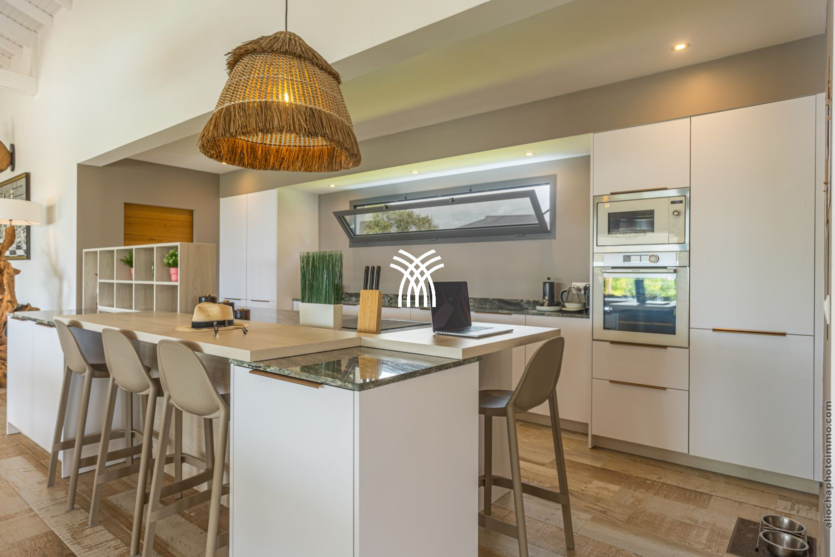 The living area, open to the outdoors, is tastefully decorated with unique pieces handpicked by the owners. The modern and comfortable lounge invites relaxation, while the contemporary kitchen is fully equipped for preparing meals in a refined atmosphere.