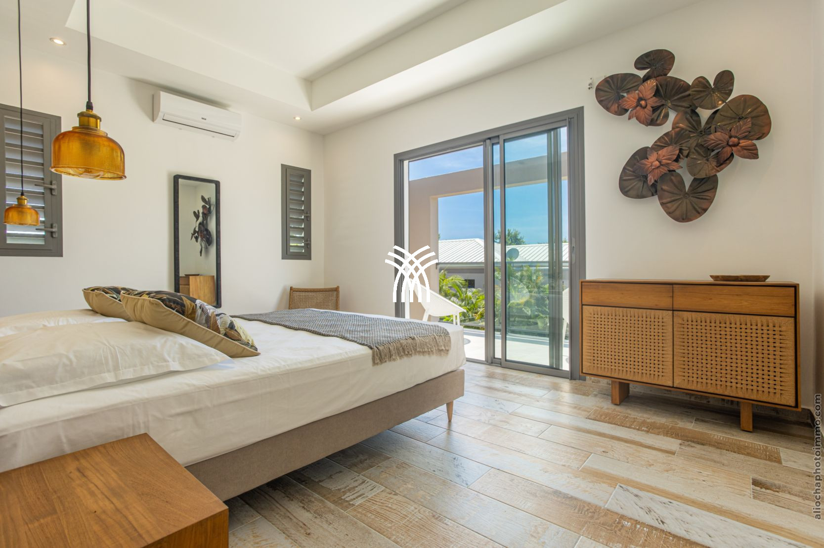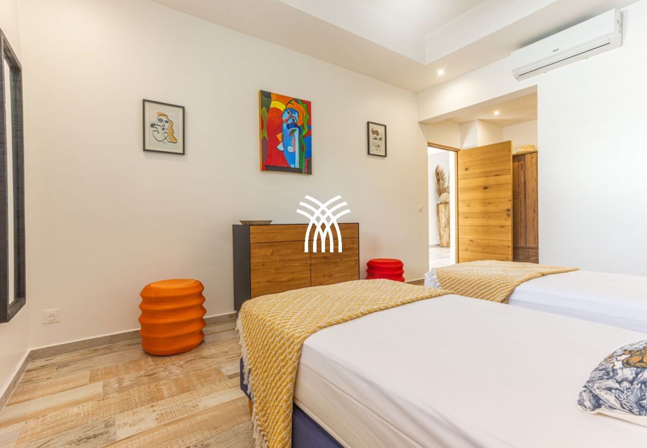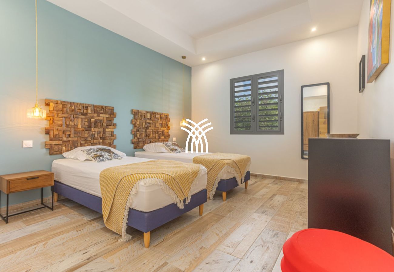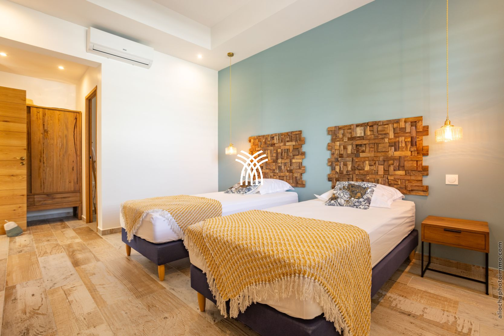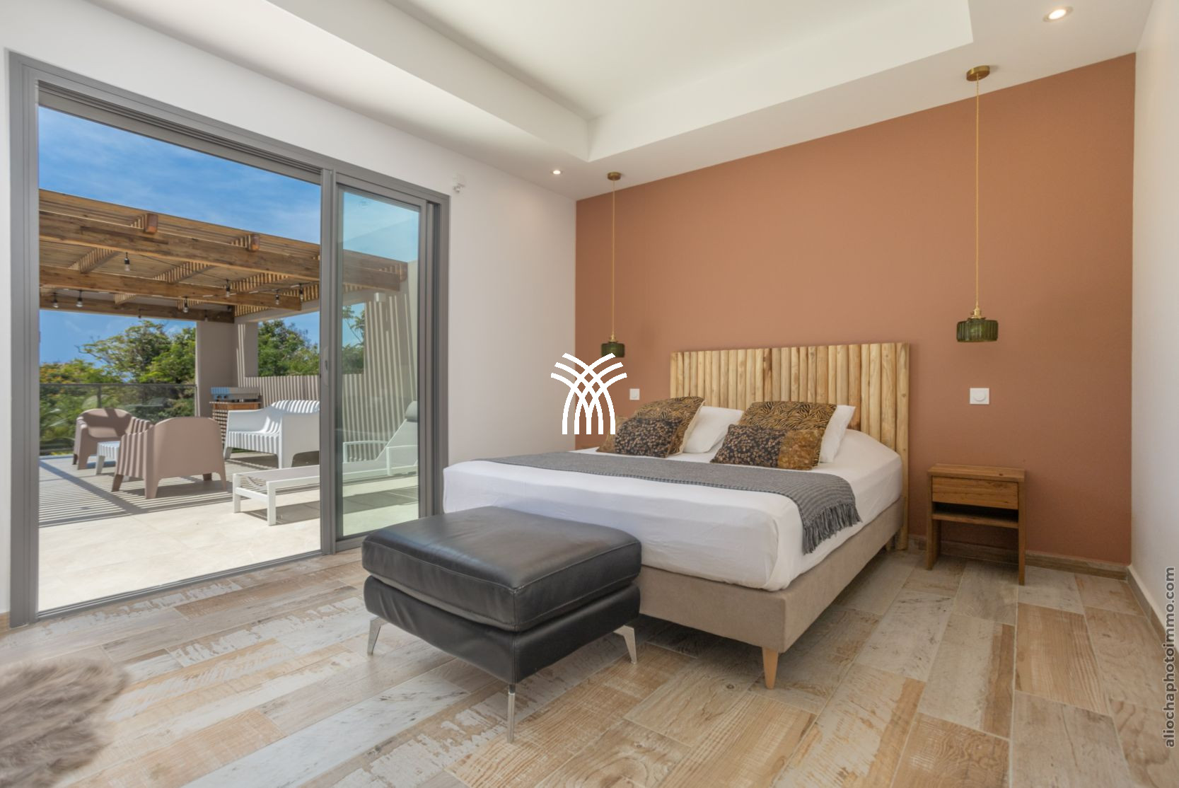 Karibea offers four air-conditioned suites with sea views. The master suite, spanning 30 m², delivers a 5-star hotel experience with a king-size bed, a luxurious bathroom, and a private terrace. The other bedrooms, each with their own en-suite bathrooms, blend charm and elegance to ensure comfort and privacy for all guests. The fourth suite, independent and accessible via a contemporary staircase, features a private terrace with stunning sea views.