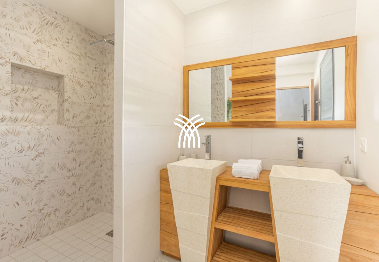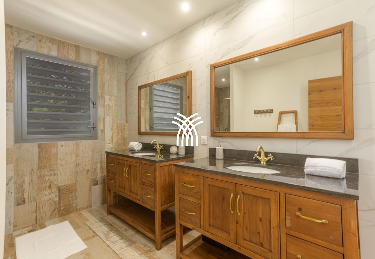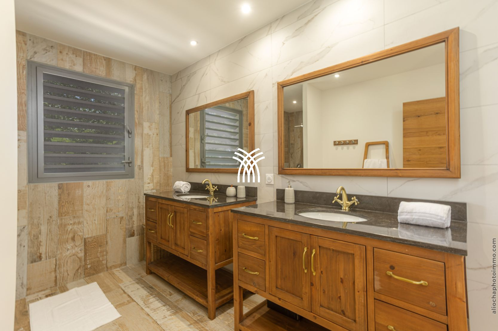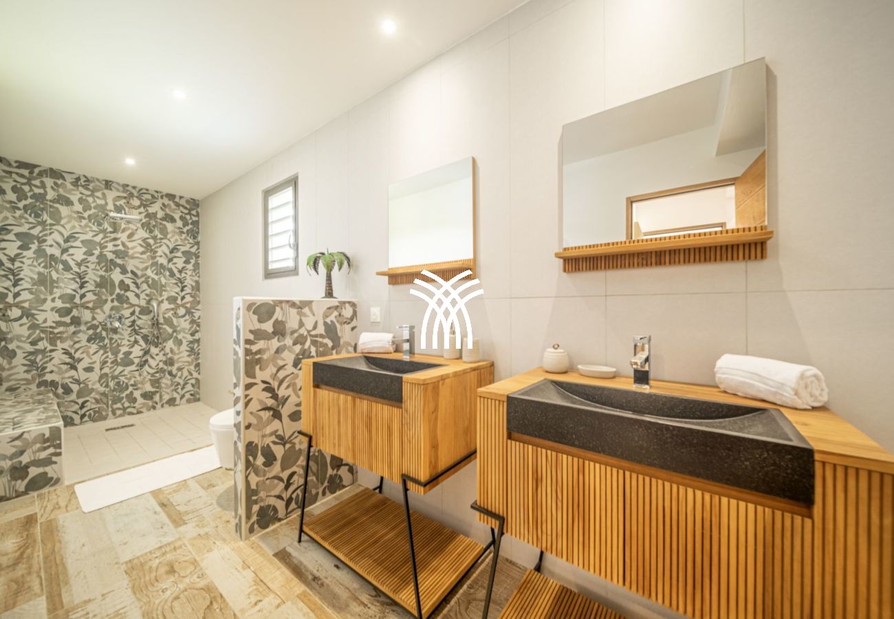 The single-storey Abawak villa features 4 air-conditioned bedrooms tastefully decorated to offer comfort and serenity. The main master suite is a true cocoon with a king-size bed, walk-in closet, and private bathroom. A second master suite offers a unique experience with an outdoor shower under the starry sky of Guadeloupe.