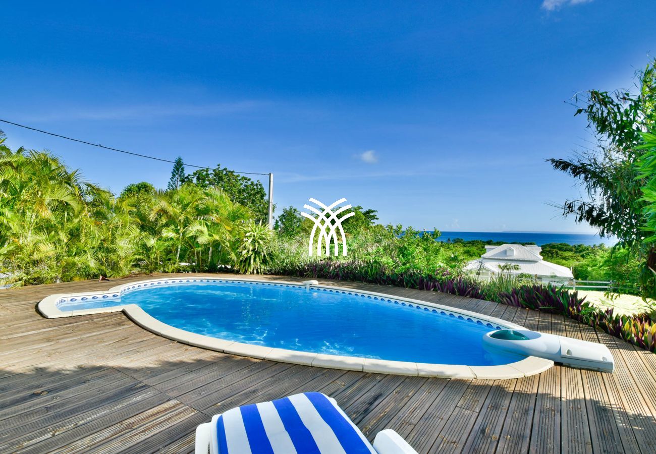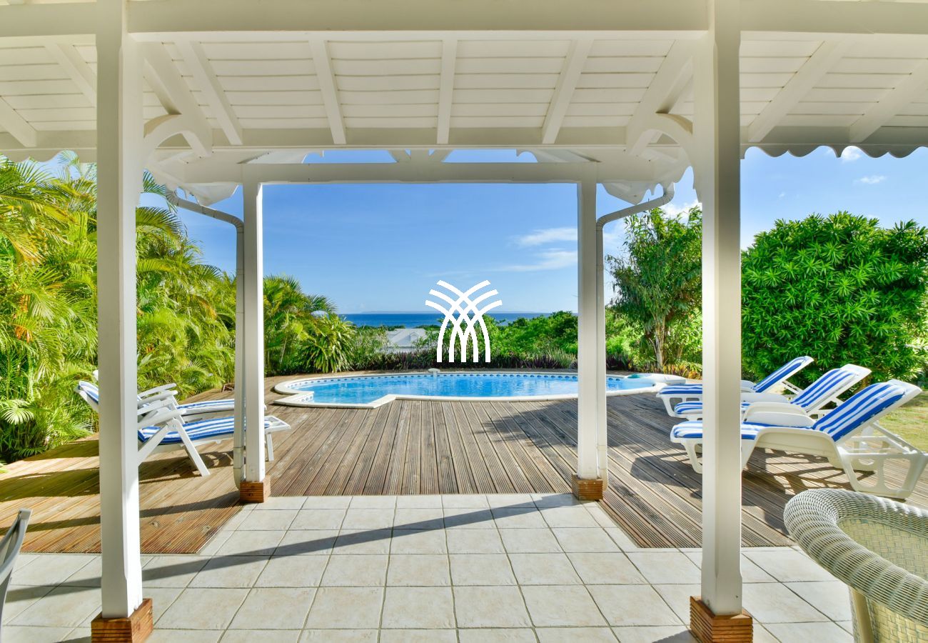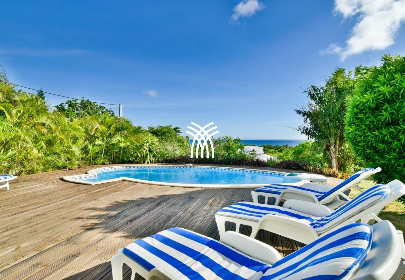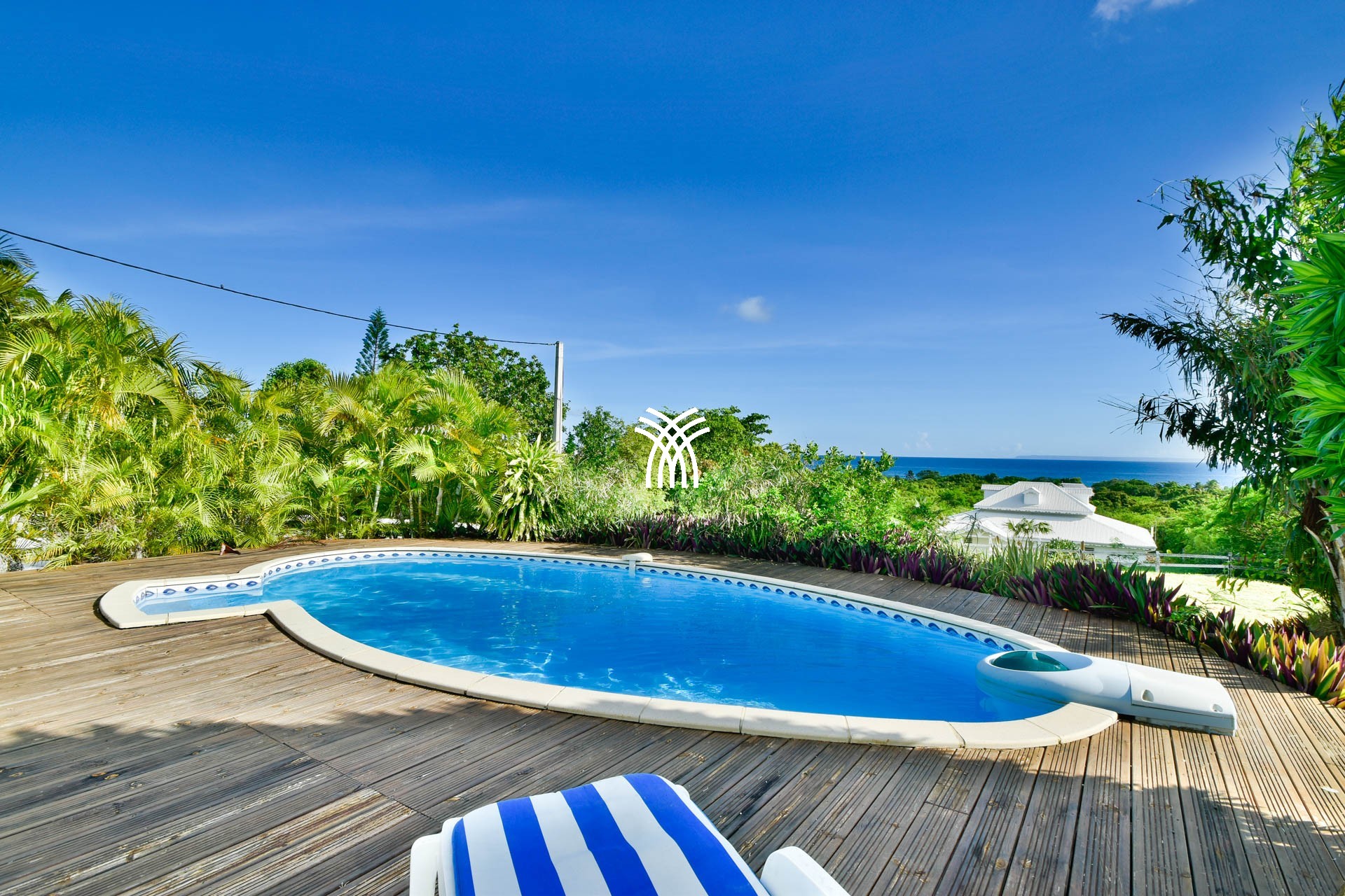 Villa Katorz is a charming villa in Guadeloupe located in Saint-François, offering a panoramic sea view and a beautiful 5x10m private salt water swimming pool. Designed for peaceful stays, this villa rental in Saint-François combines modern comfort and Creole atmosphere in a lush and intimate setting. The spacious living area opens onto a covered terrace overlooking the pool and a carbet, perfect for enjoying the softness of Guadeloupean evenings facing the sea.