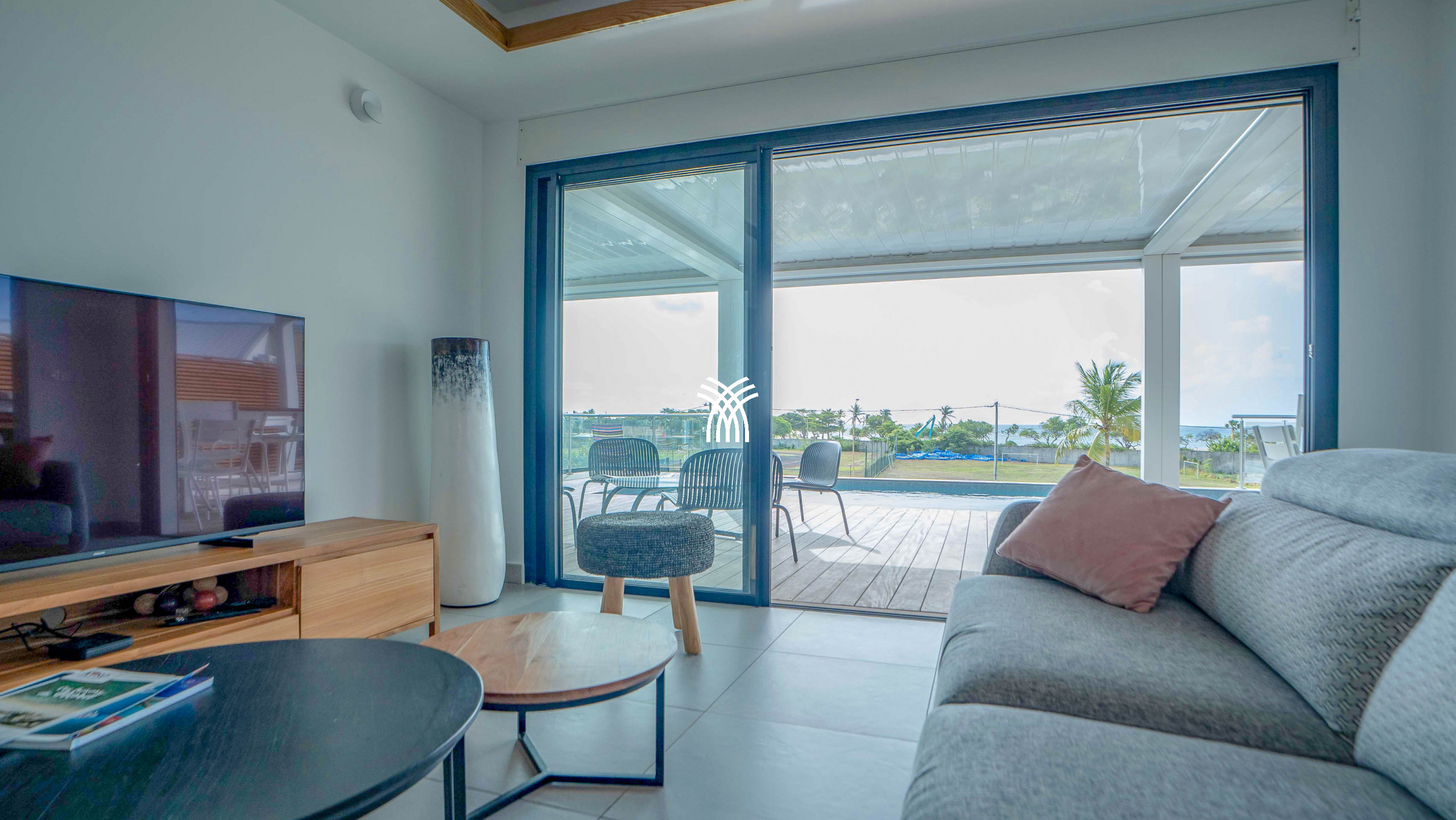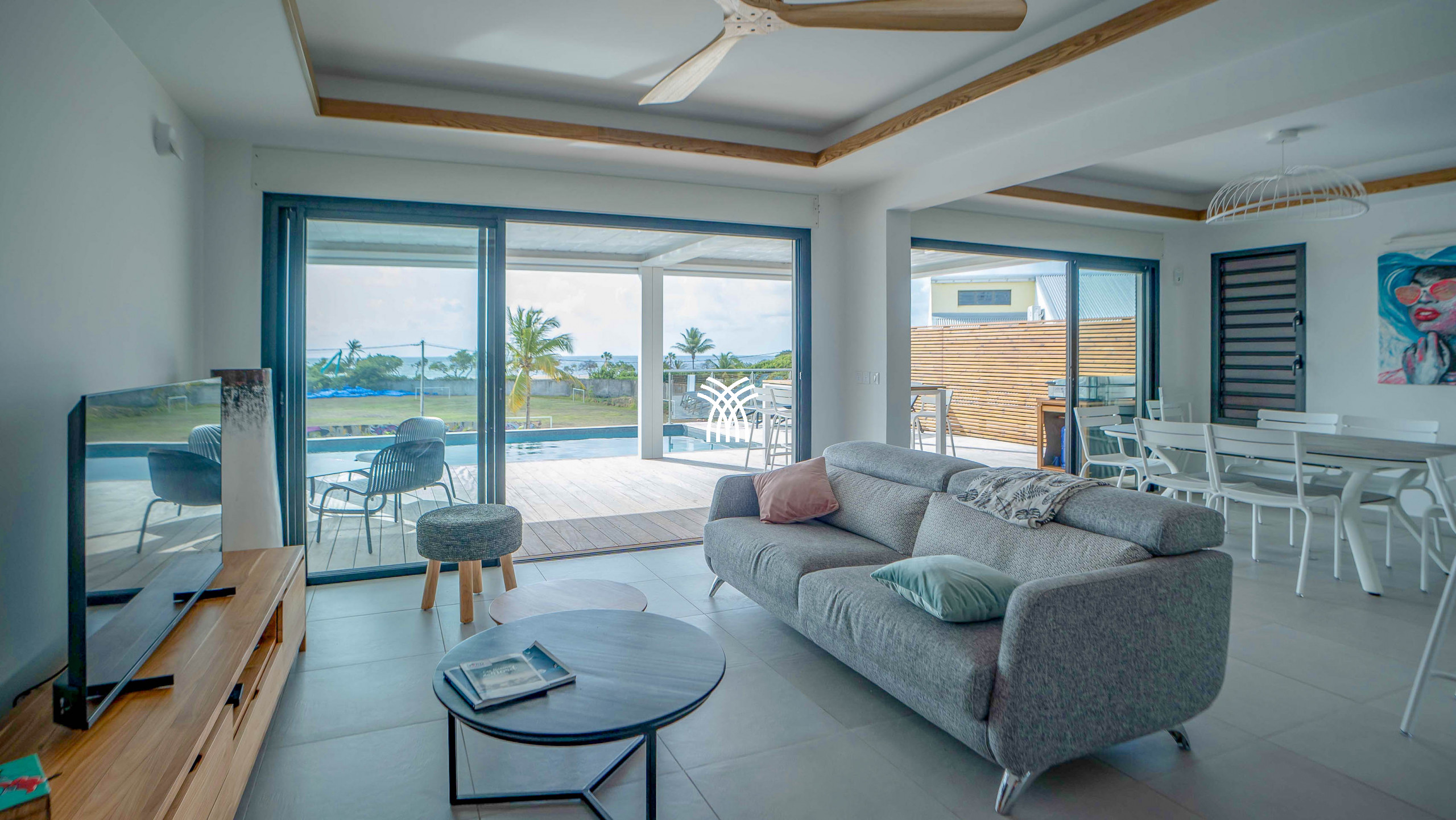 Villa Katorz is a charming villa in Guadeloupe located in Saint-François, offering a panoramic sea view and a beautiful 5x10m private salt water swimming pool. Designed for peaceful stays, this villa rental in Saint-François combines modern comfort and Creole atmosphere in a lush and intimate setting. The spacious living area opens onto a covered terrace overlooking the pool and a carbet, perfect for enjoying the softness of Guadeloupean evenings facing the sea.