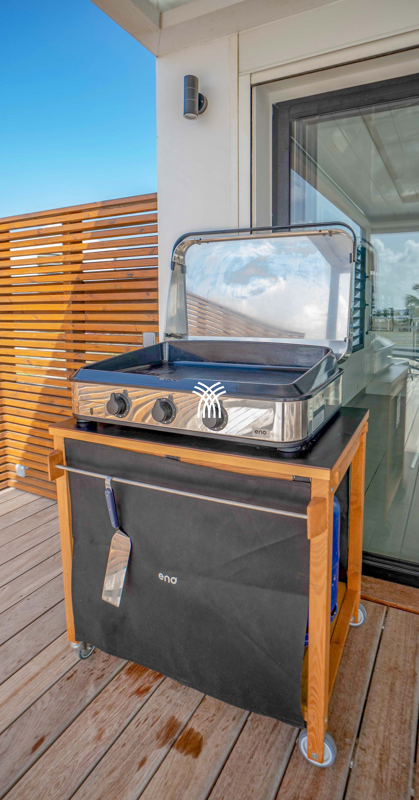 The villa has two bedrooms with private bathrooms, a friendly living area with a sofa bed that can accommodate up to six people, as well as a fully landscaped garden that ensures peace and privacy. The kitchen is fully equipped for your meals with family or friends: oven, hob, dishwasher, refrigerator, microwave, barbecue, coffee maker, kettle, blender, ice maker and even a lobster pot to savour local specialities.