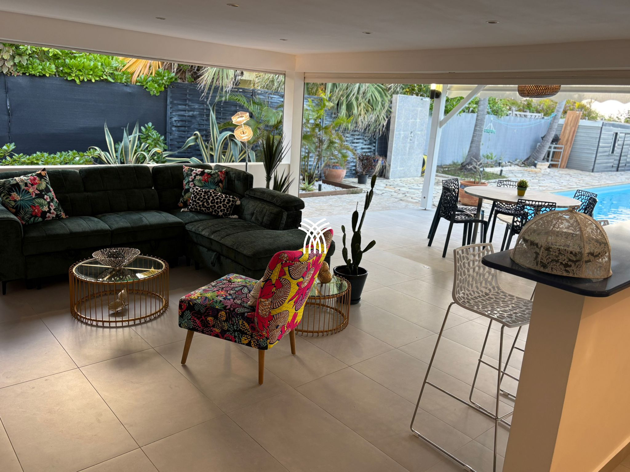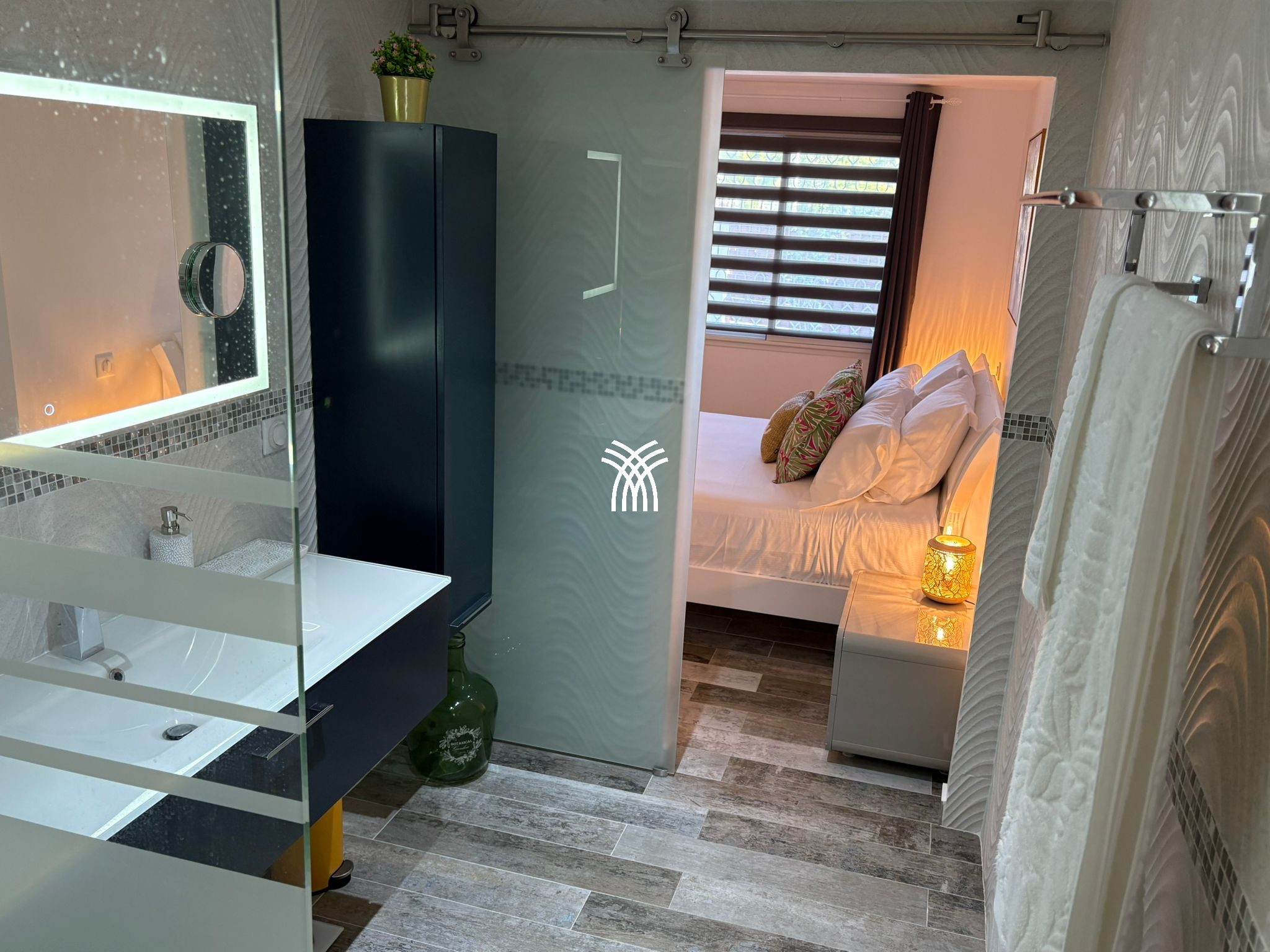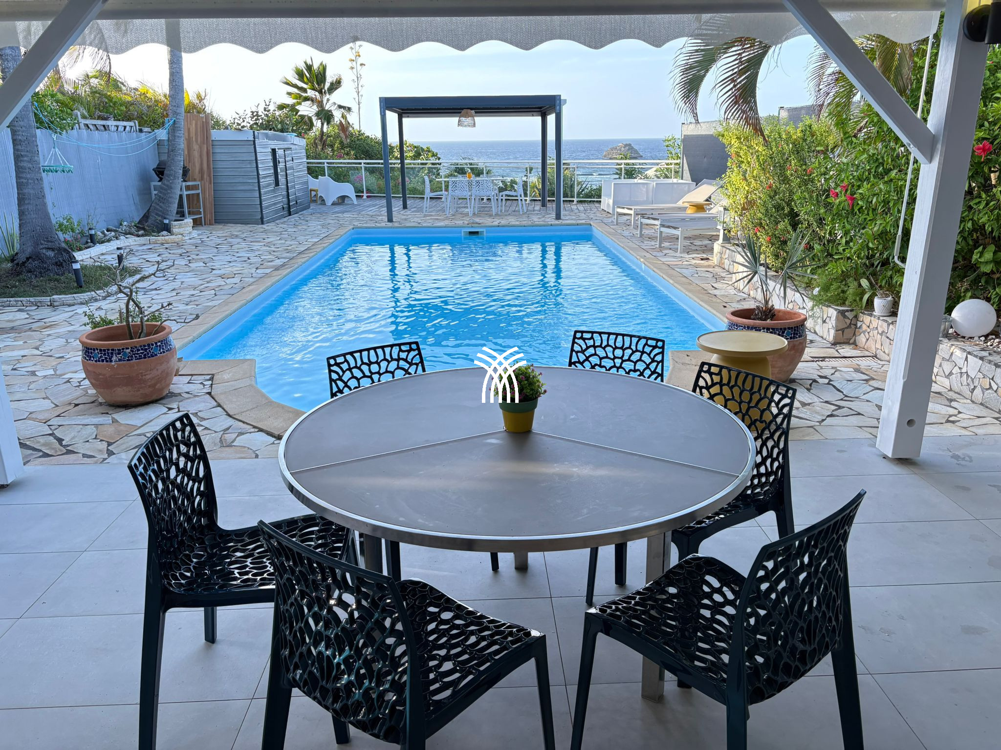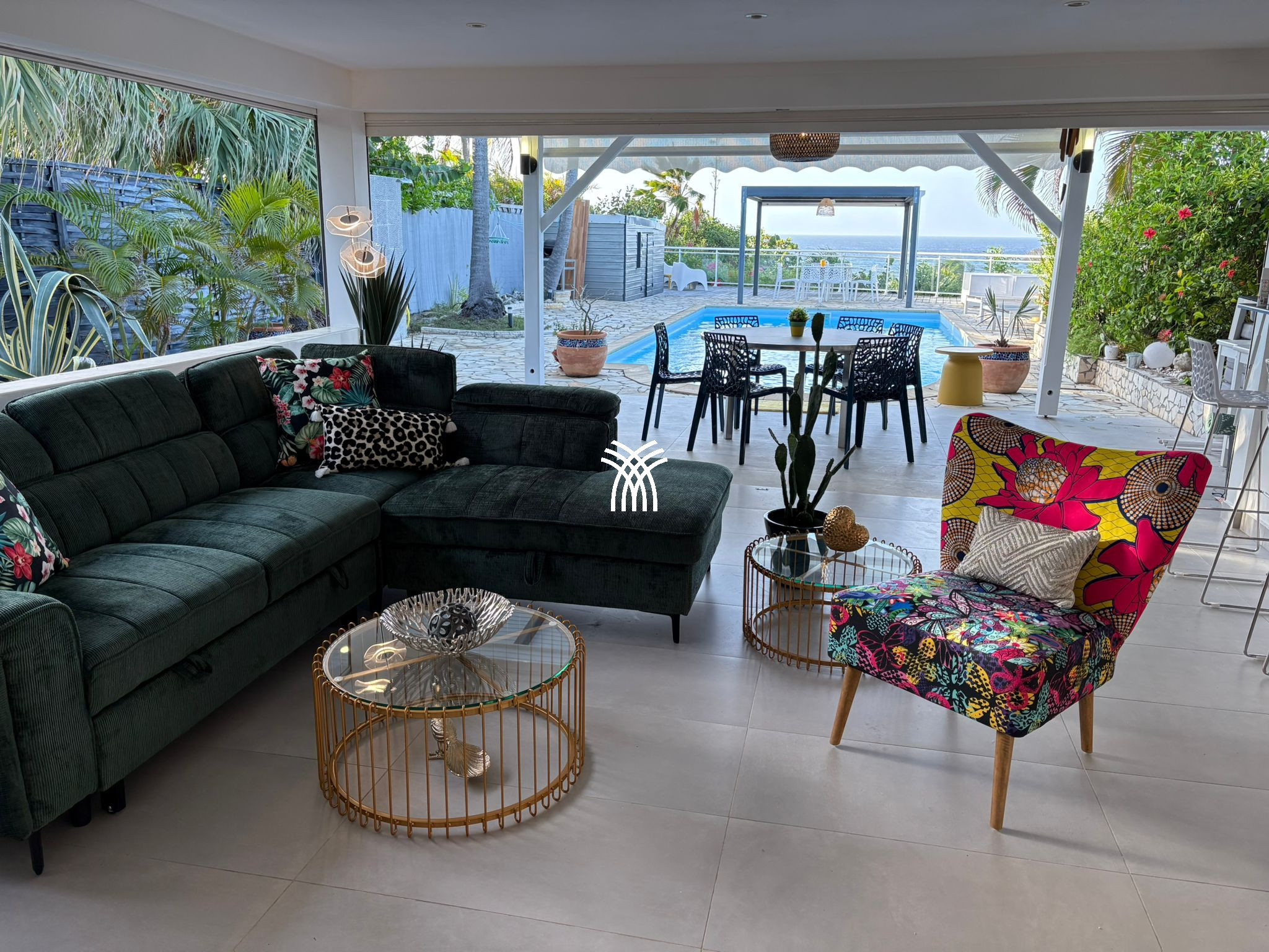 Villa Katorz is a charming villa in Guadeloupe located in Saint-François, offering a panoramic sea view and a beautiful 5x10m private salt water swimming pool. Designed for peaceful stays, this villa rental in Saint-François combines modern comfort and Creole atmosphere in a lush and intimate setting. The spacious living area opens onto a covered terrace overlooking the pool and a carbet, perfect for enjoying the softness of Guadeloupean evenings facing the sea.