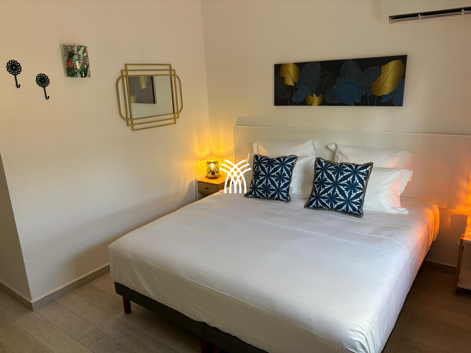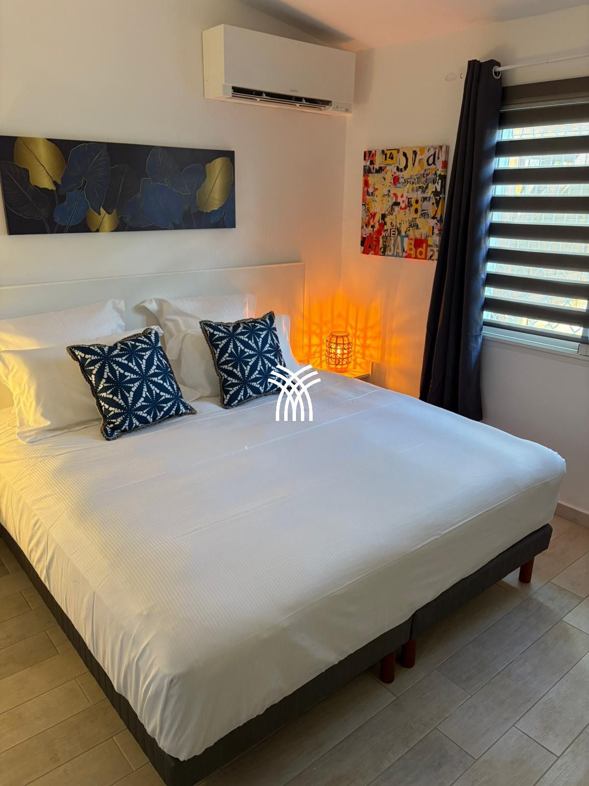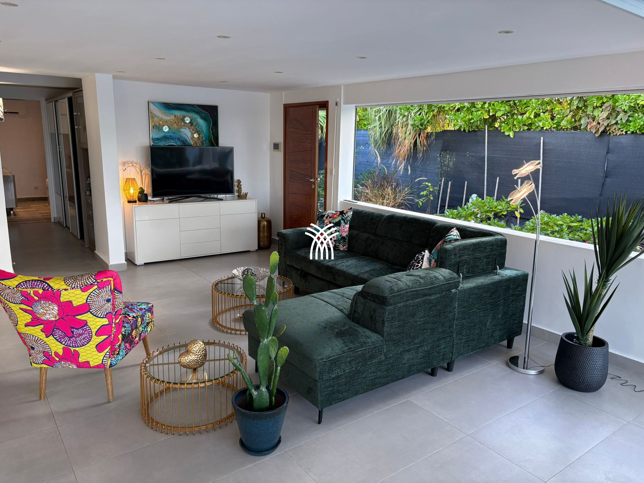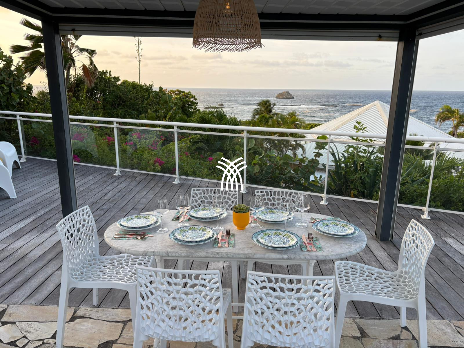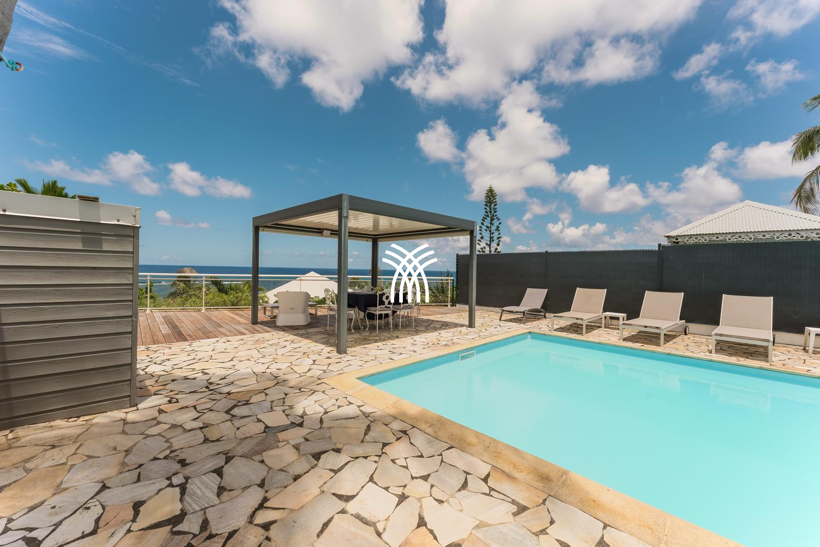 Villa Katorz is a charming villa in Guadeloupe located in Saint-François, offering a panoramic sea view and a beautiful 5x10m private salt water swimming pool. Designed for peaceful stays, this villa rental in Saint-François combines modern comfort and Creole atmosphere in a lush and intimate setting. The spacious living area opens onto a covered terrace overlooking the pool and a carbet, perfect for enjoying the softness of Guadeloupean evenings facing the sea.