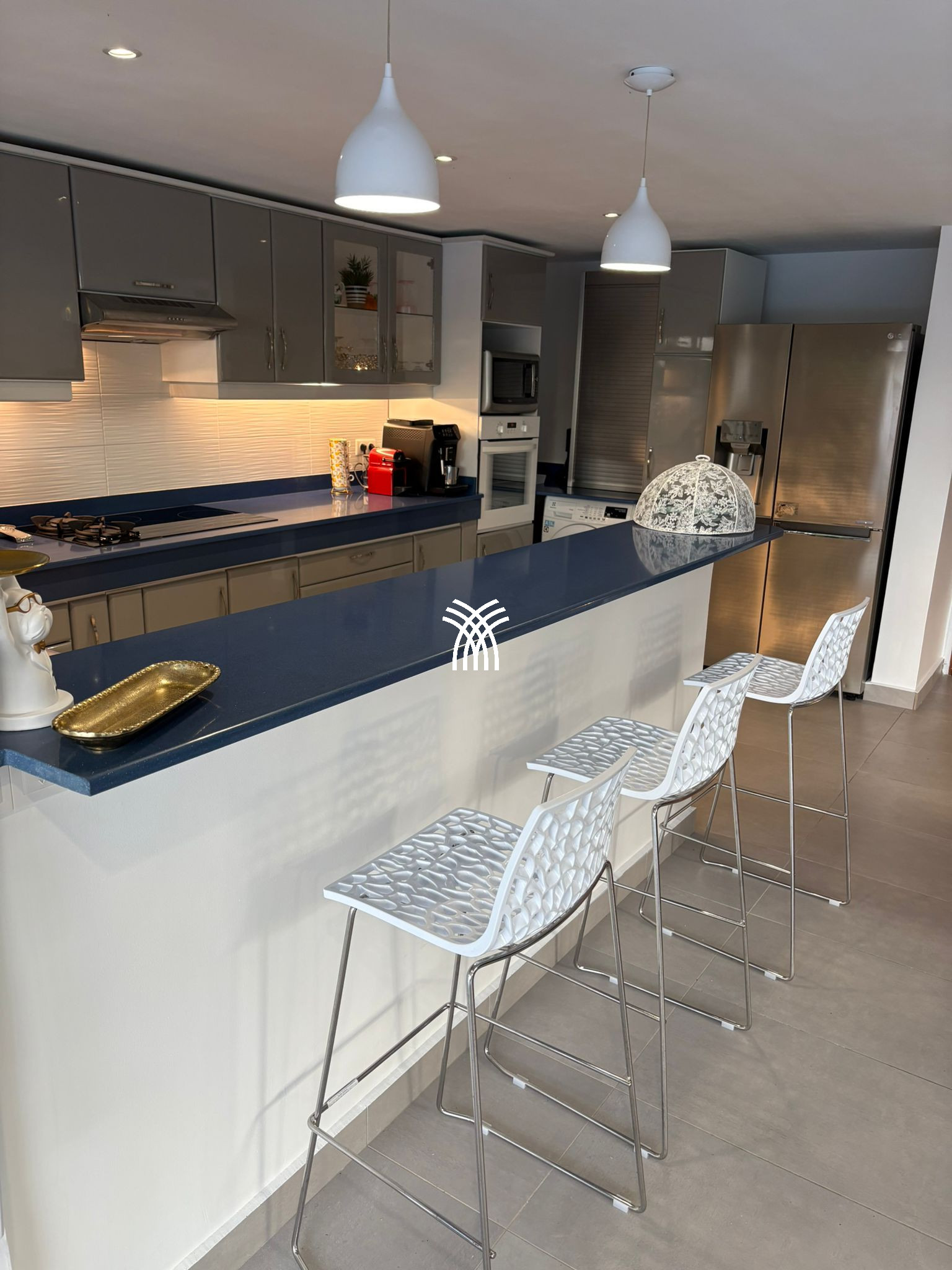 Oven, Microwave, Nespresso machine, toaster, dishwasher, fridge-freezer, water dispenser and ice cubes, kettle, juicer