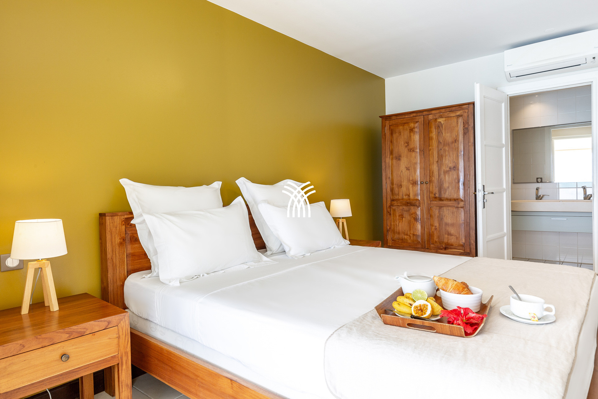 Designed as a high-end family retreat, Villa Gwadaluna consists of a main villa and an independent cottage, comfortably accommodating up to twelve people. The living spaces, open to nature, allow light and sea breeze to circulate. This ventilated architecture, typical of Creole homes, offers a soothing setting for those seeking a luxury villa rental in Saint-François, blending modernity and local traditions. The solid wood shutters and doors, light fabrics, and natural finishes enhance the serene atmosphere of a home designed for well-being.