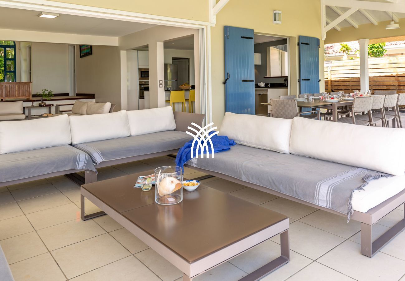 Villa Caribe, located in a private estate in Saint-François, is a luxurious rental perfect for an unforgettable vacation in Guadeloupe. This high-end property accommodates up to 12 guests, making it ideal for large families with children or groups of friends. With a total surface area of 330 m², including a covered terrace, the villa centers around a spacious living and dining area that opens onto the outdoors, creating a convivial space to share memorable moments while enjoying modern multimedia equipment.