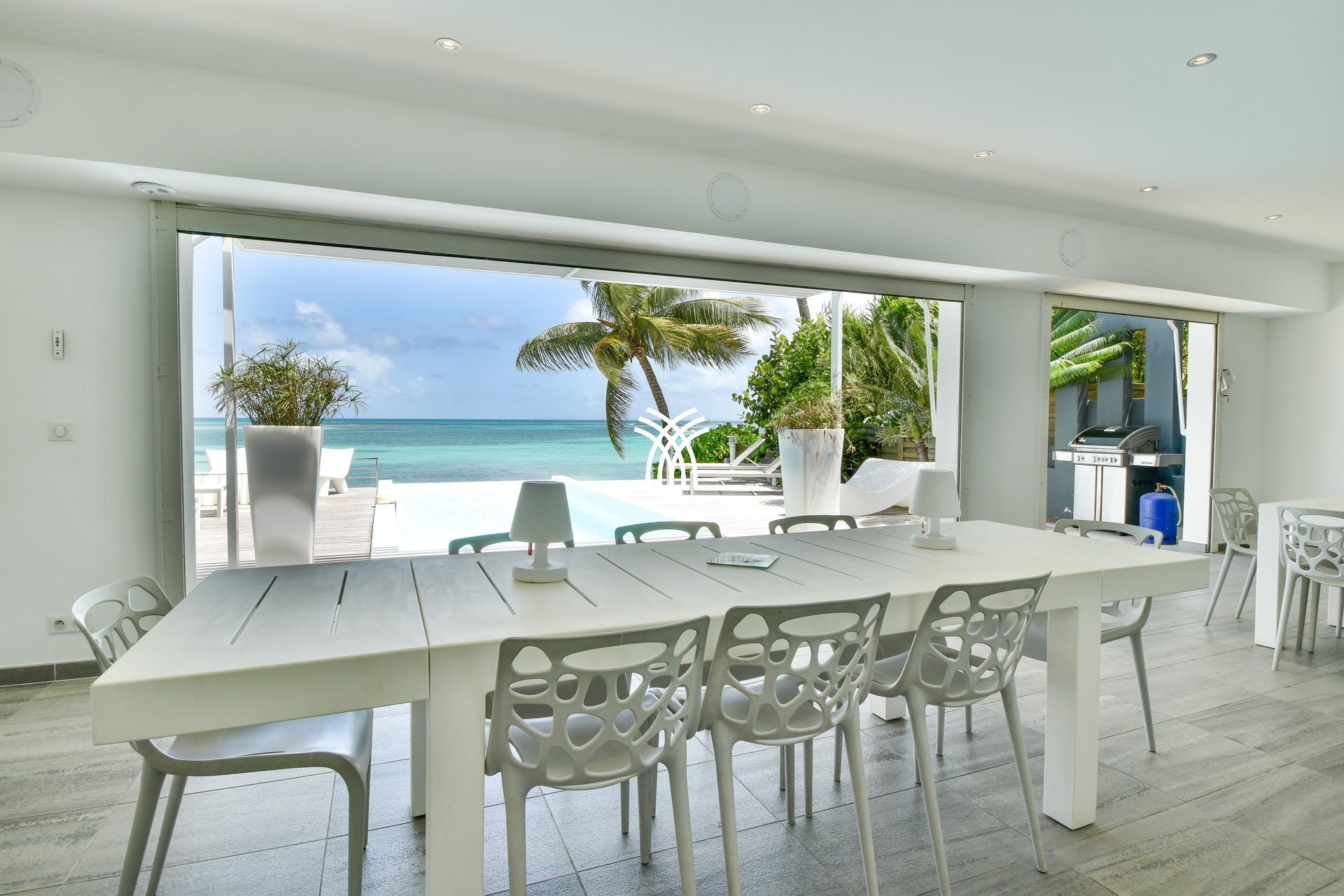 The outdoor space of Villa Abawak is ideal for gathering with family or friends. The covered terrace allows sharing meals with a view of the salt water pool and tropical garden. The private carbet is perfect for relaxing around a ti-punch or local specialties.