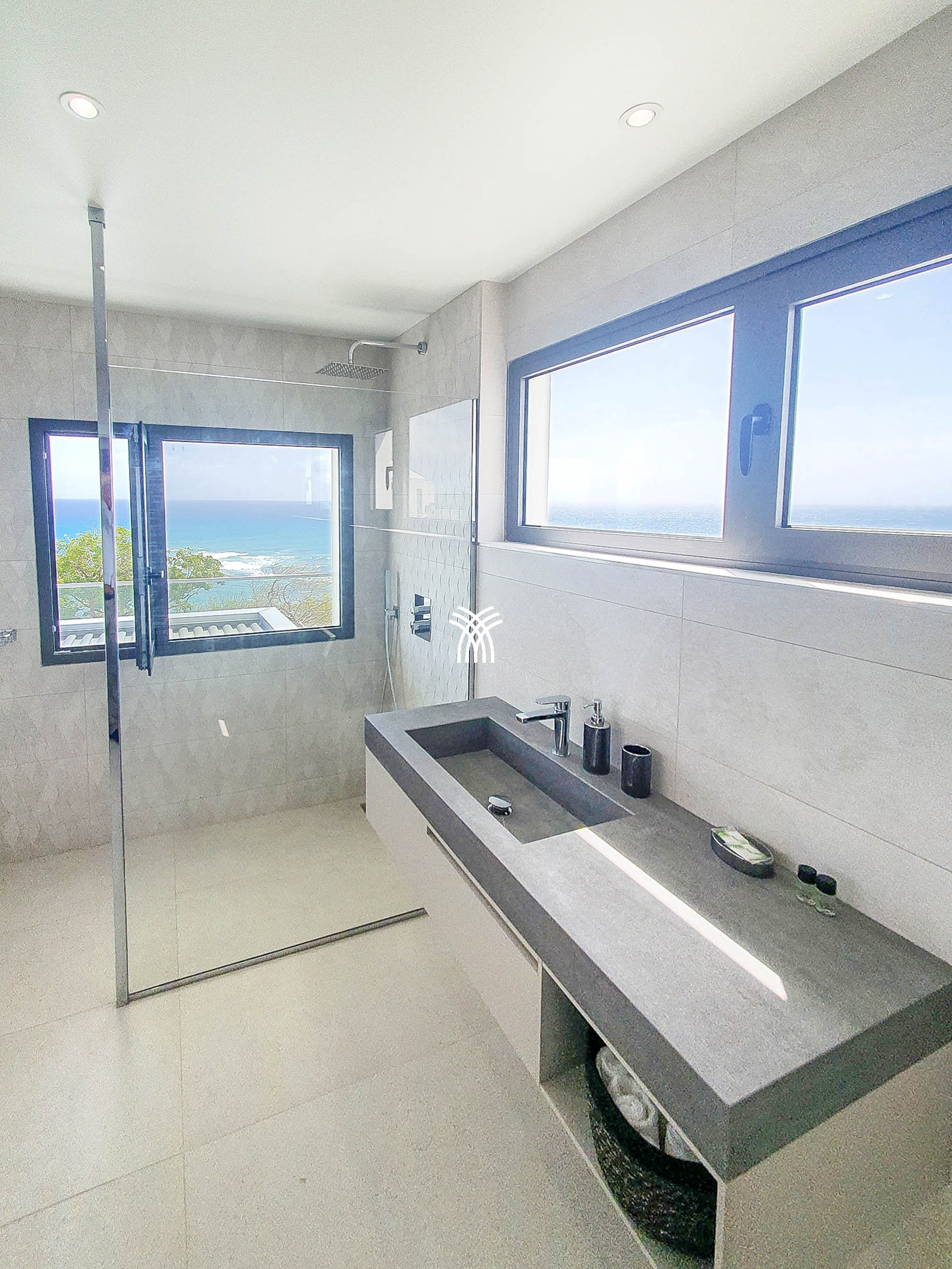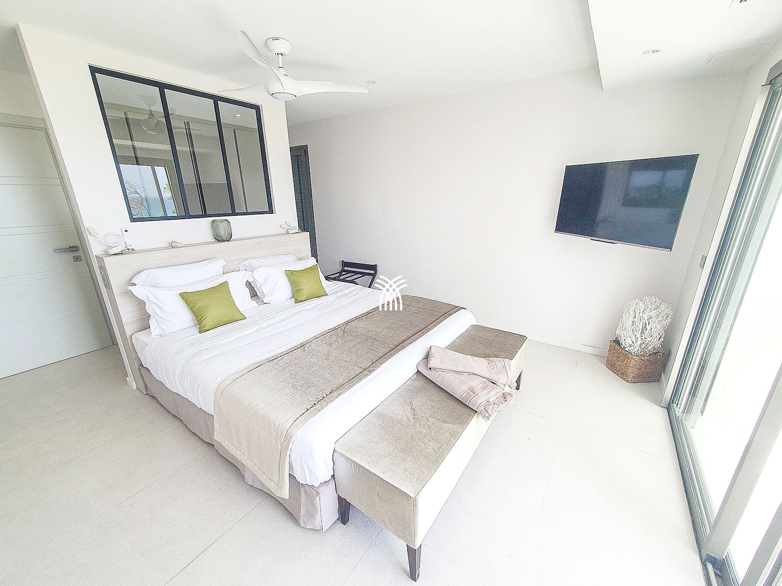 Located in a prestigious and secure residential area on the Tourist Route of Saint-François, the villa is designed on two levels and can accommodate up to 8 people in absolute comfort. It features four spacious bedrooms, one on the ground floor and three upstairs. Each bedroom has an en-suite bathroom and an unobstructed sea view, ensuring privacy and serenity for each guest.