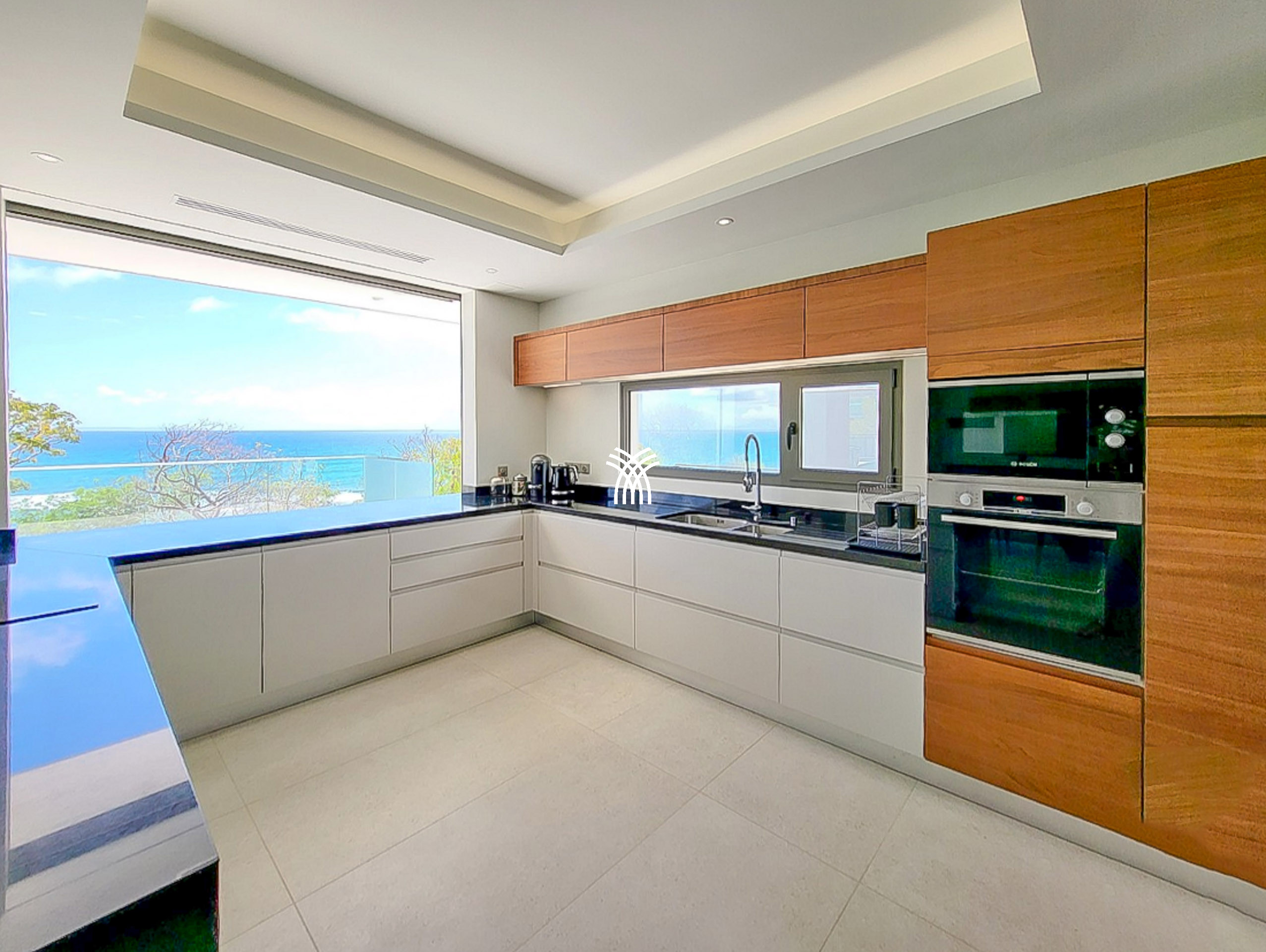 The ground floor reveals a fully equipped kitchen, open to a bright living room and an elegant dining area, all oriented towards the marine horizon. The spacious terrace is perfect for sharing convivial moments around a meal or an aperitif, while the infinity pool, visually blending into the ocean, offers an unforgettable experience of relaxation and luxury.