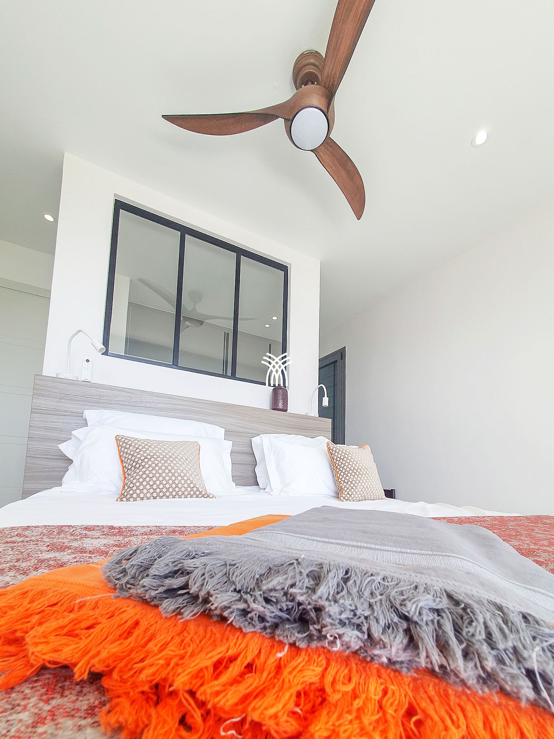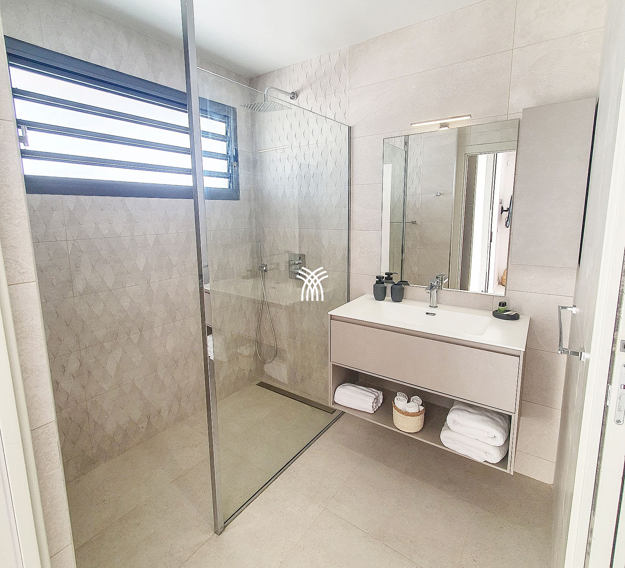 The single-storey Abawak villa features 4 air-conditioned bedrooms tastefully decorated to offer comfort and serenity. The main master suite is a true cocoon with a king-size bed, walk-in closet, and private bathroom. A second master suite offers a unique experience with an outdoor shower under the starry sky of Guadeloupe.