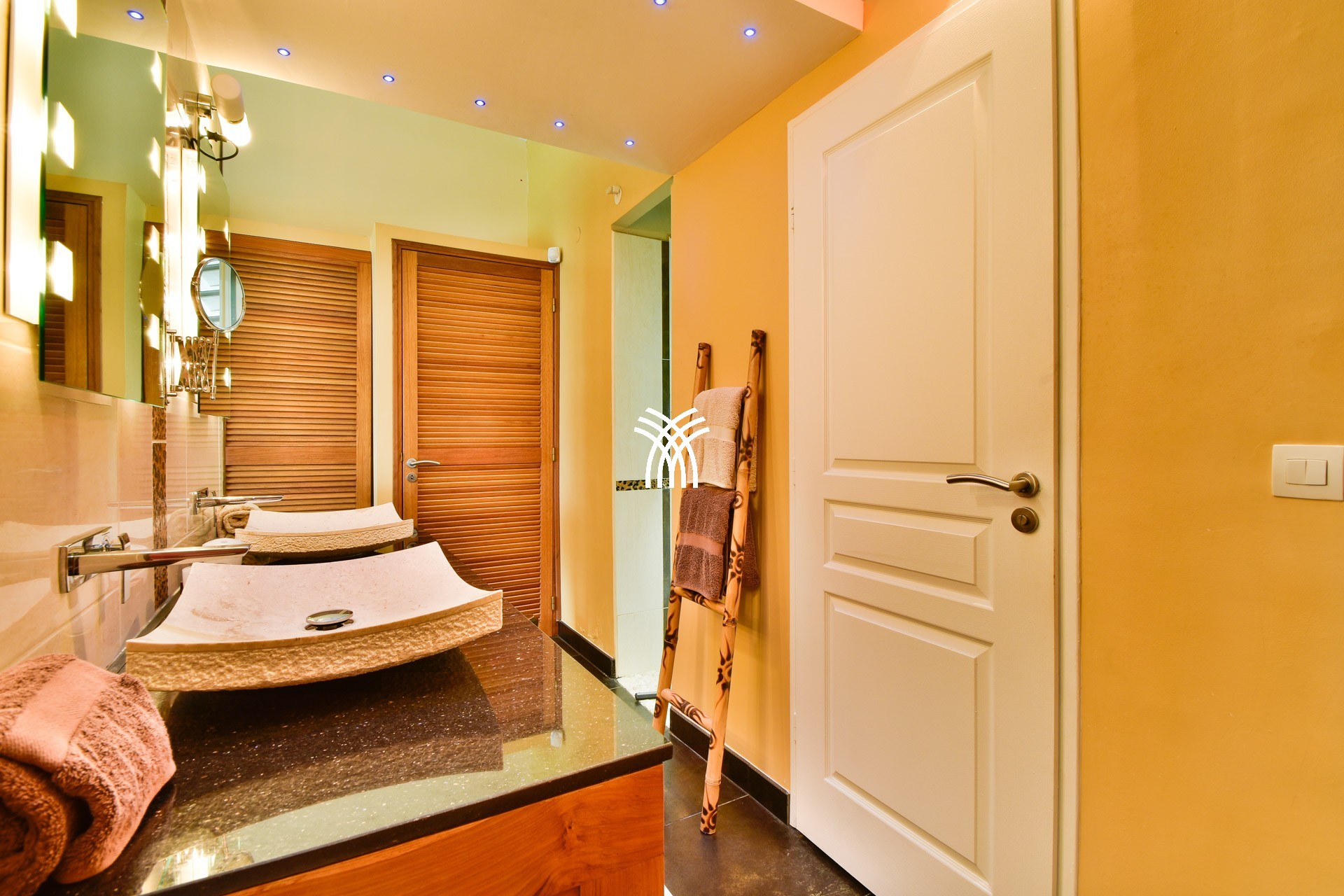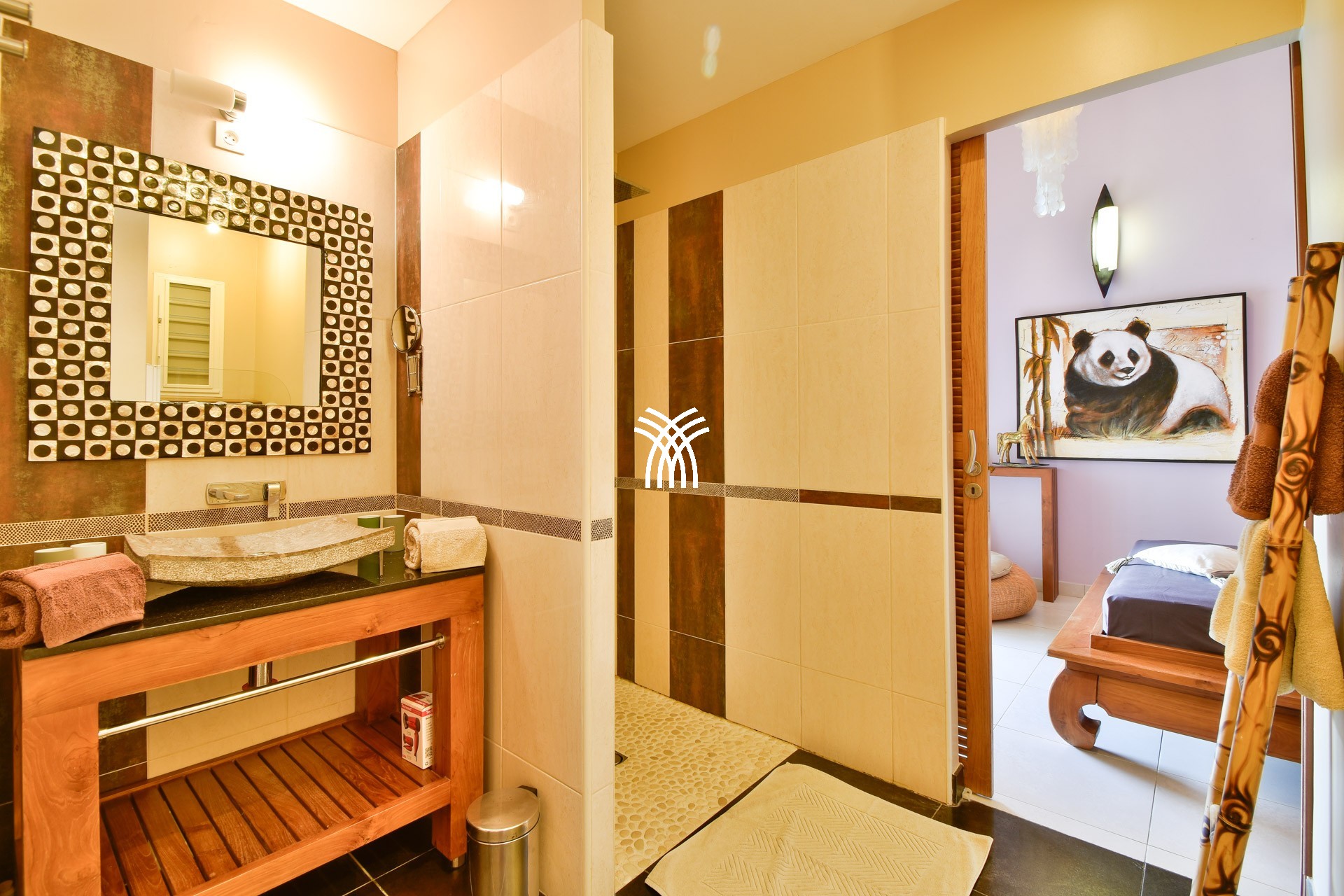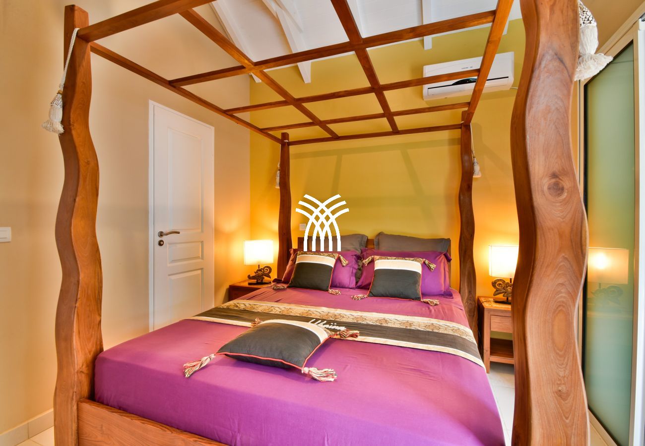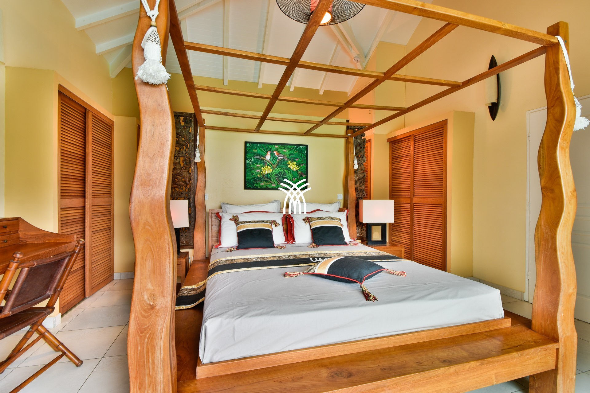 The single-storey Abawak villa features 4 air-conditioned bedrooms tastefully decorated to offer comfort and serenity. The main master suite is a true cocoon with a king-size bed, walk-in closet, and private bathroom. A second master suite offers a unique experience with an outdoor shower under the starry sky of Guadeloupe.