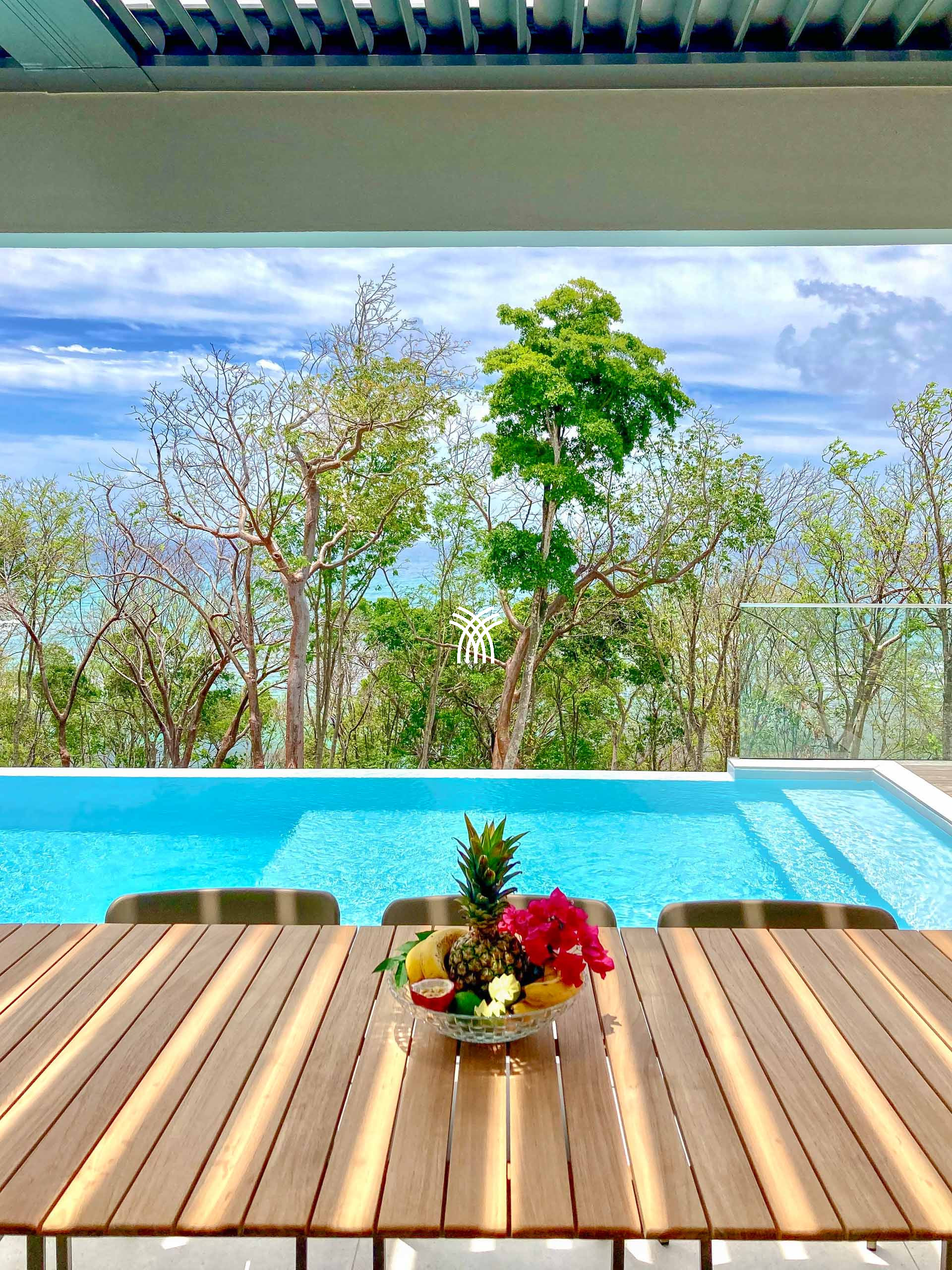 The ground floor reveals a fully equipped kitchen, open to a bright living room and an elegant dining area, all oriented towards the marine horizon. The spacious terrace is perfect for sharing convivial moments around a meal or an aperitif, while the infinity pool, visually blending into the ocean, offers an unforgettable experience of relaxation and luxury.