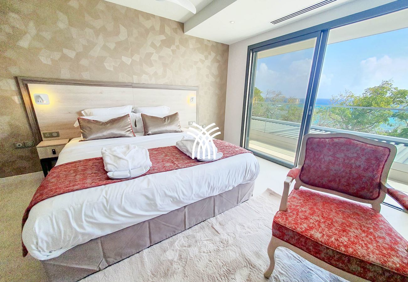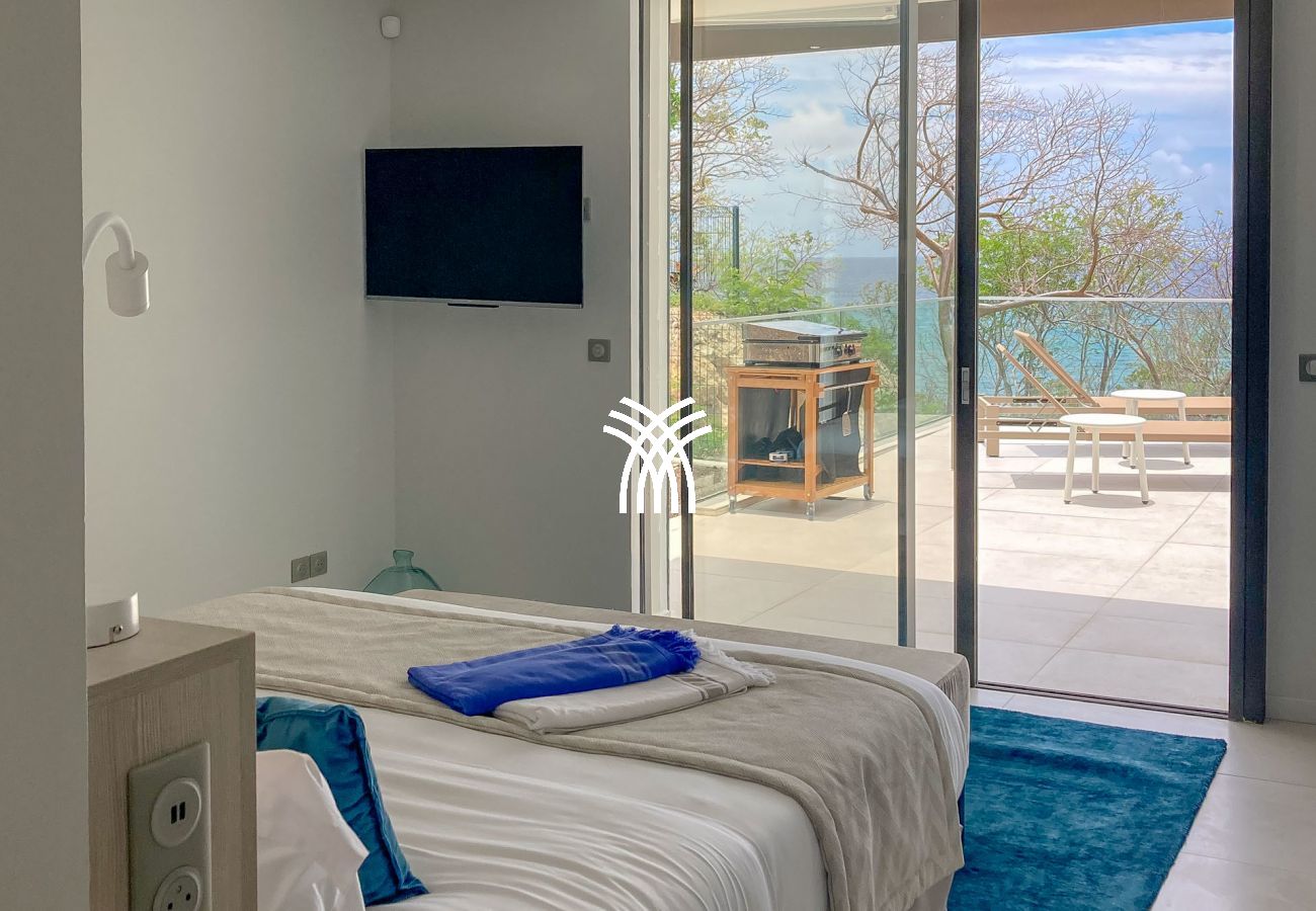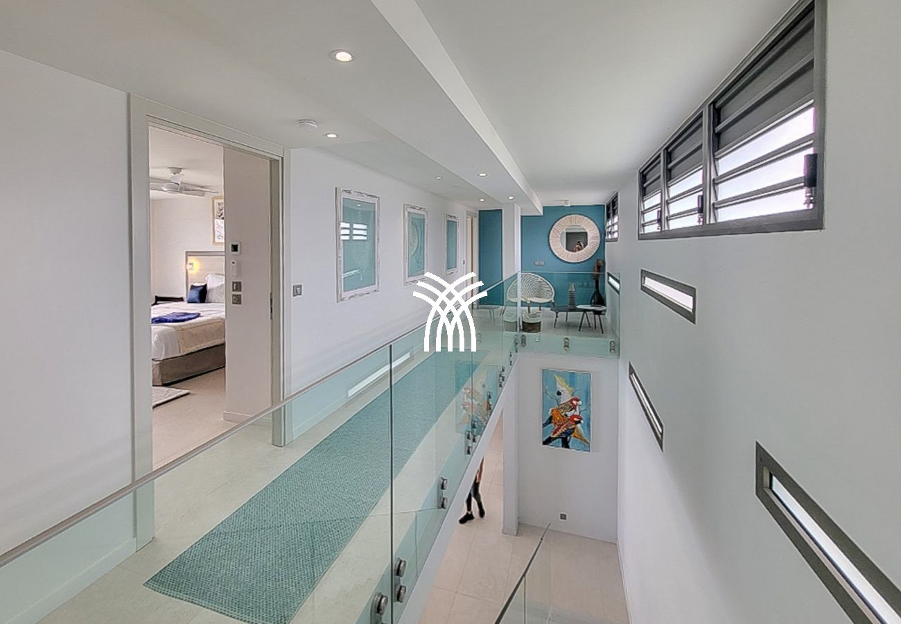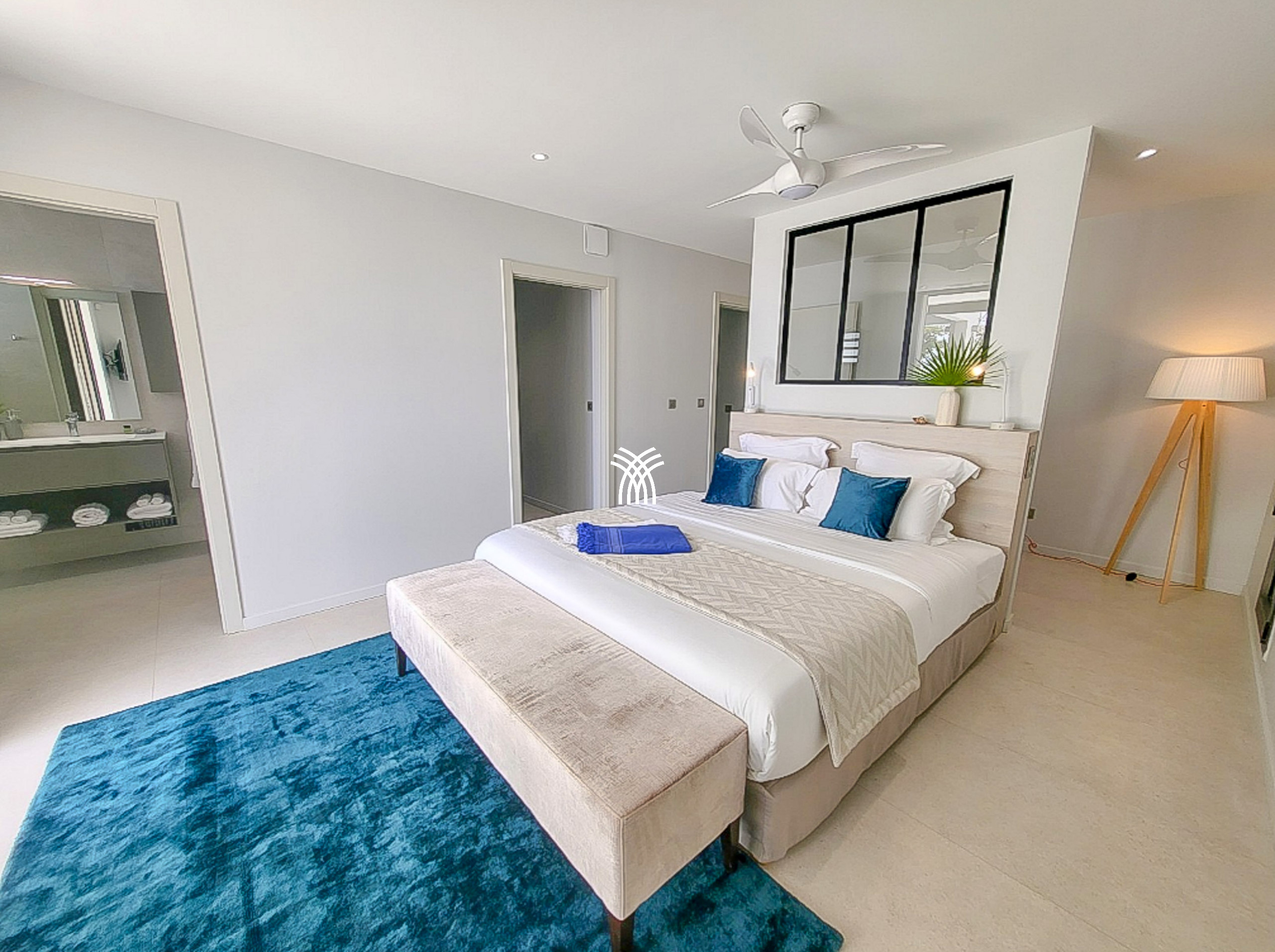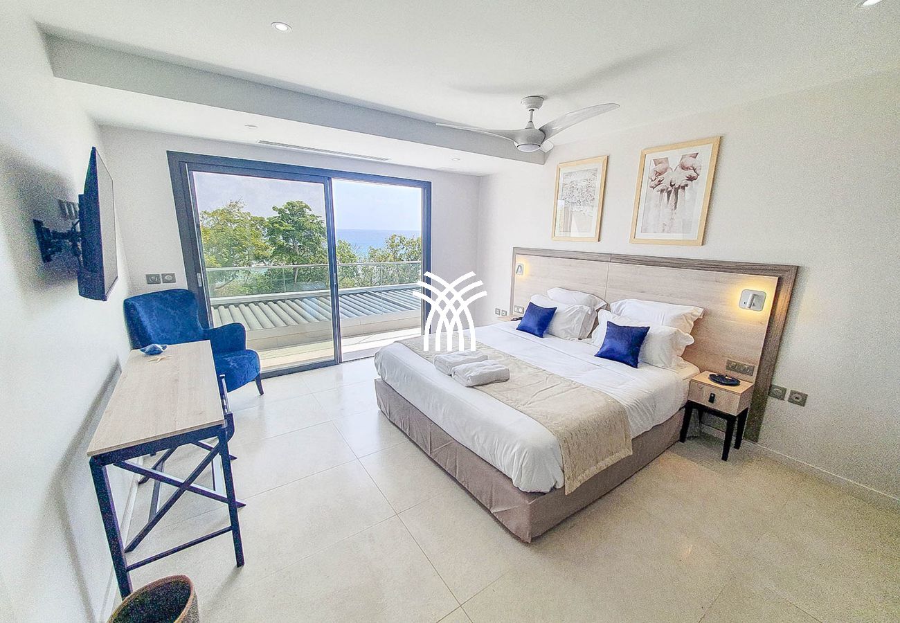 Located in a prestigious and secure residential area on the Tourist Route of Saint-François, the villa is designed on two levels and can accommodate up to 8 people in absolute comfort. It features four spacious bedrooms, one on the ground floor and three upstairs. Each bedroom has an en-suite bathroom and an unobstructed sea view, ensuring privacy and serenity for each guest.