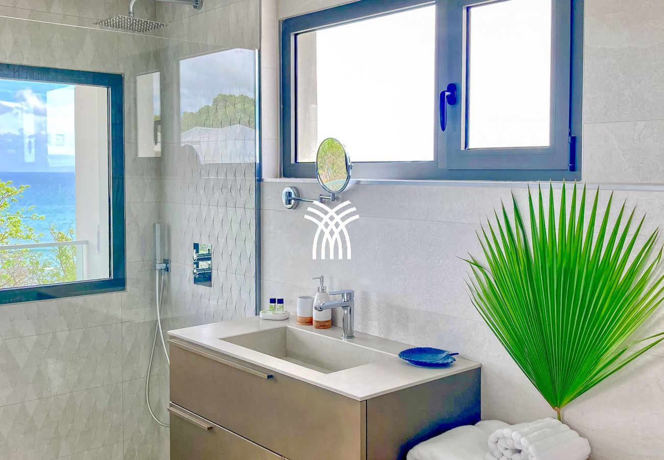 The single-storey Abawak villa features 4 air-conditioned bedrooms tastefully decorated to offer comfort and serenity. The main master suite is a true cocoon with a king-size bed, walk-in closet, and private bathroom. A second master suite offers a unique experience with an outdoor shower under the starry sky of Guadeloupe.