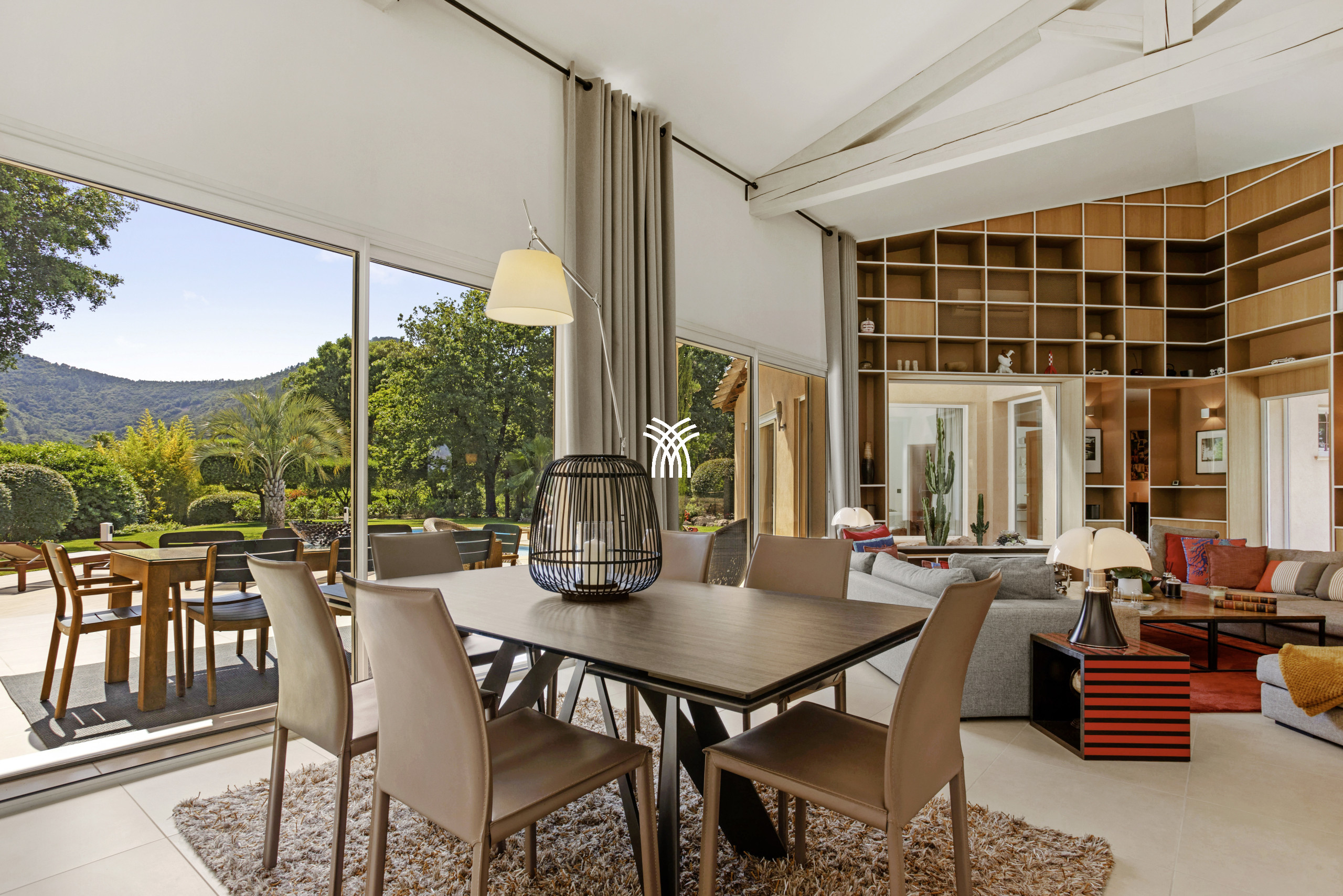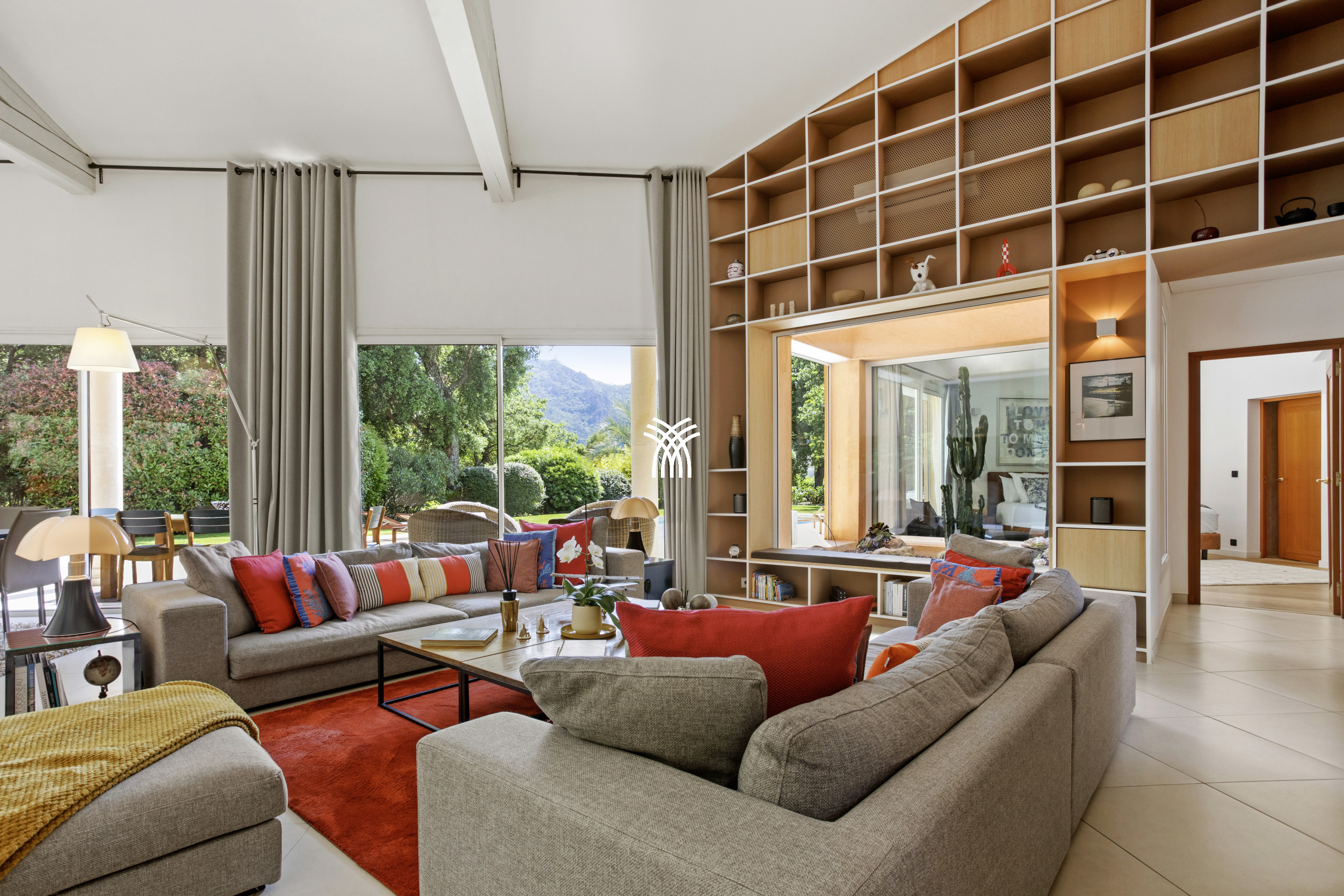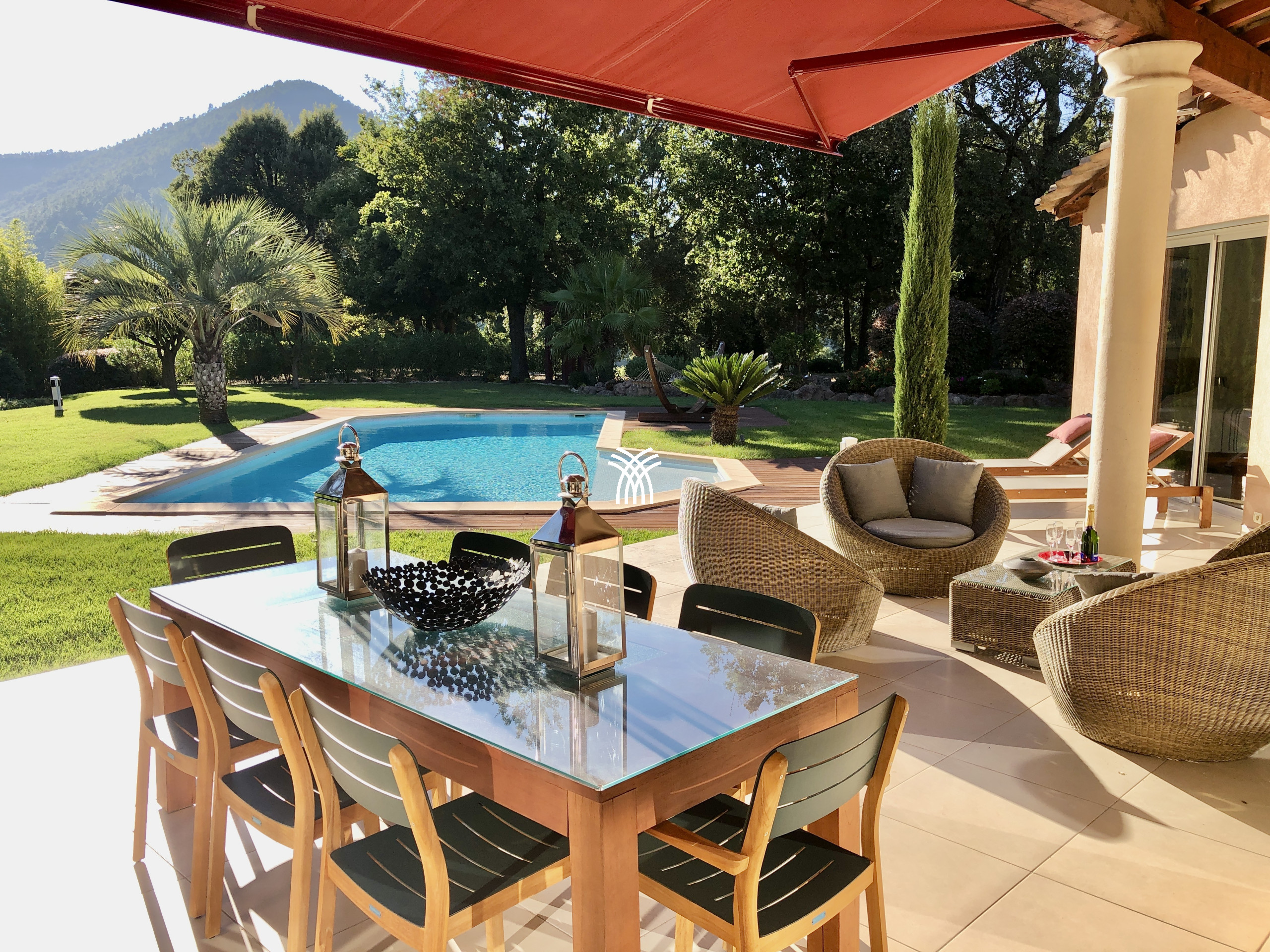 HSUD0019 - 8 km from Mandelieu, in a domain 15 minutes from the beaches, on St Jean de l'Estérel in the heart of the "Parc Résidentiel de l'Estérel", luxurious property with an enclosed park of 1 hectare. Heated salt pool on request, with submerged children's beach (10m x 6m, Depth 80/180 - Perimeter alarm), partially covered terraces of 100m² with garden furniture, deckchairs and a beautiful view of the park. 2 car garage. Parking for 3 cars. Fitness room. Sauna. Petanque. Ping-pong. BBQ. Residential tennis 600m. Shops and restaurants 4 km.