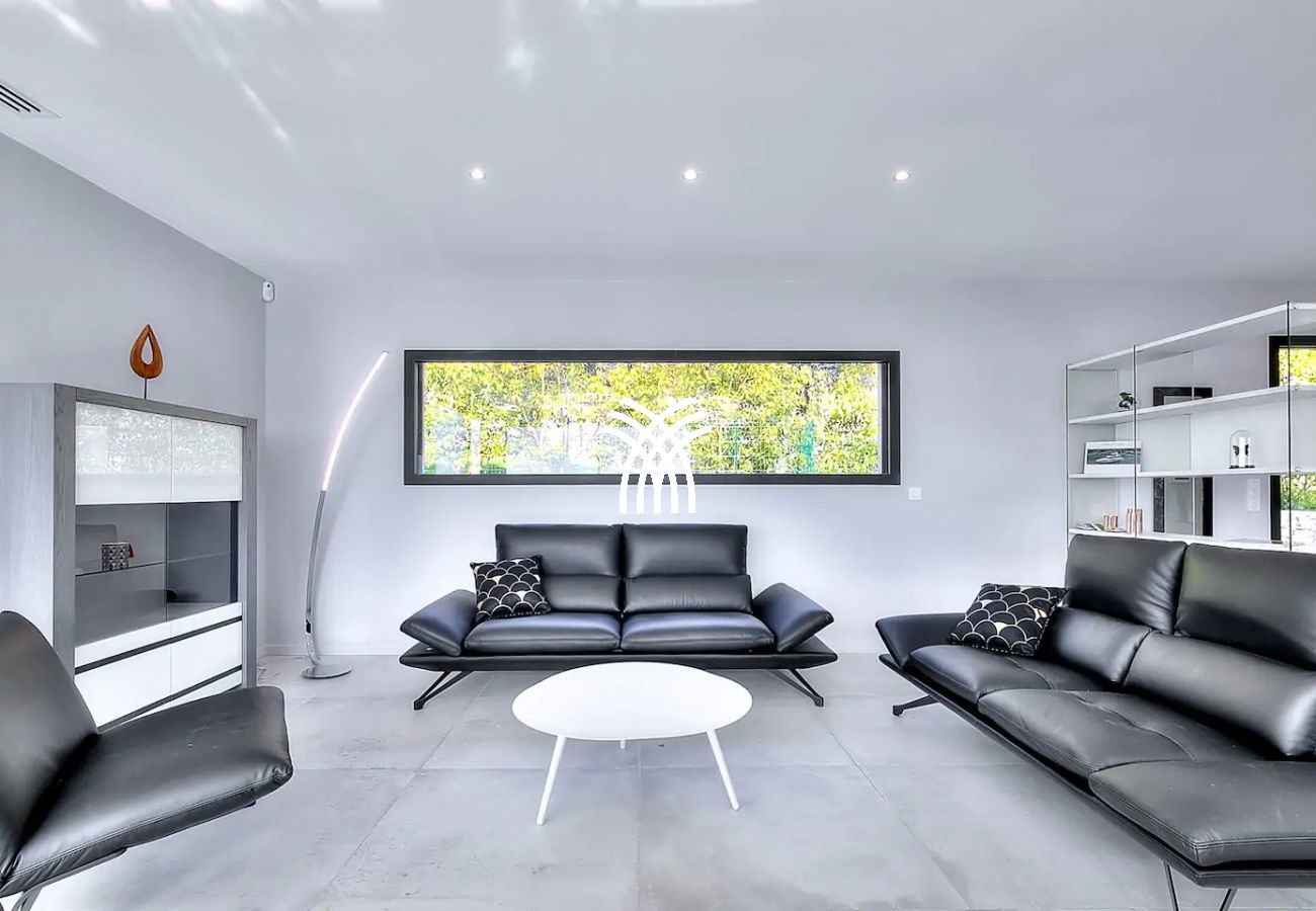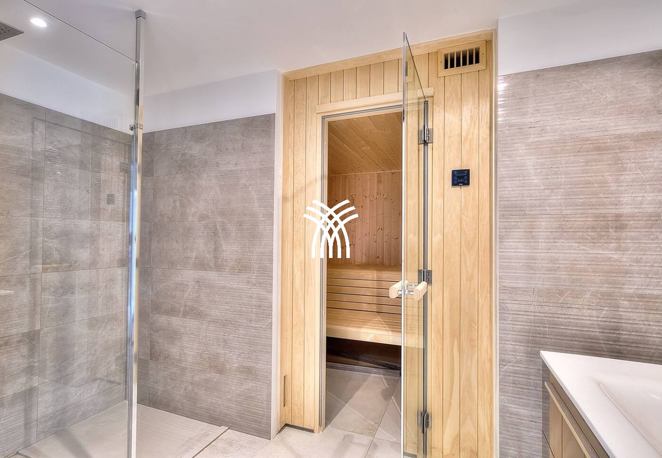 Outside, the villa features a vast wooden terrace bordered by a private pool, ideal for relaxing and enjoying the sunny French Riviera climate. You can also enjoy moments of relaxation in one of the many outdoor lounges, offering an unobstructed view of the sea and hills.
