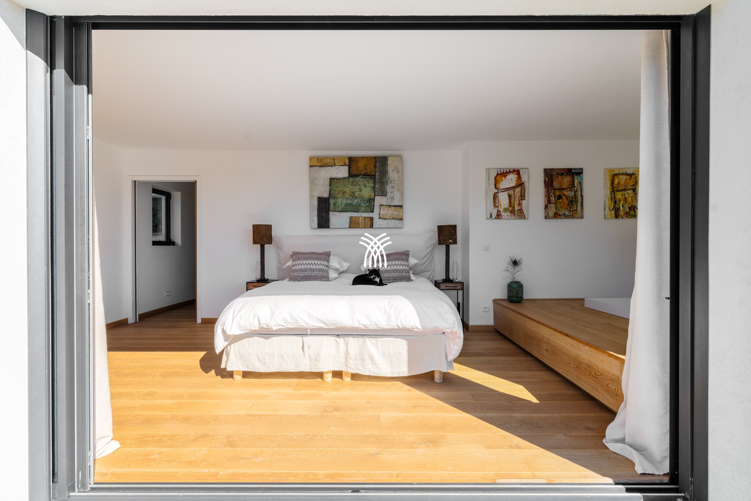 The living room, bathed in light, offers relaxation and reading spaces, perfect for moments of conviviality or relaxation. The villa has several levels, as well as landscaped terraces on the outside, offering a beautiful harmony between architecture and nature.