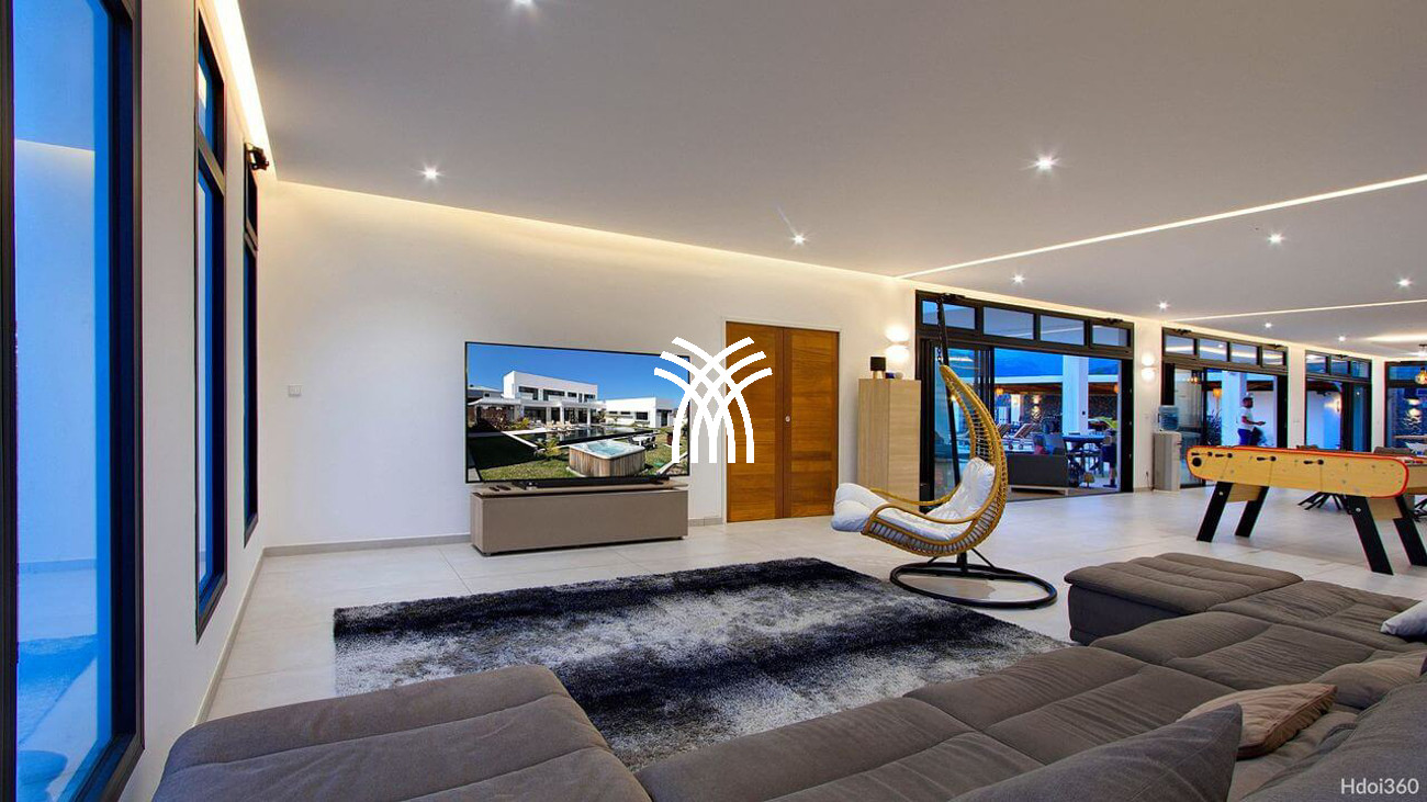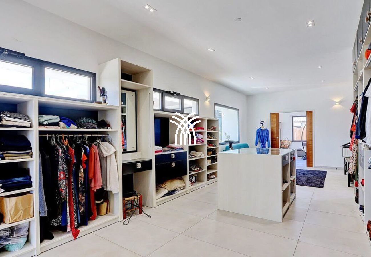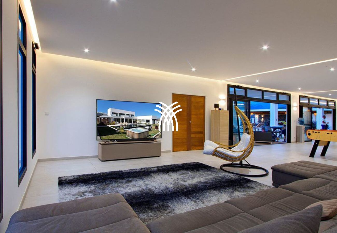 Outside, a sumptuous 100 m² infinity pool and two Jacuzzis invite you to relax in front of spectacular panoramic views. The 140 m² roof top also offers an incomparable living space, with a breathtaking view over a large part of the island. An 85 m² pool house, a sauna, a gym and leisure facilities such as table tennis and table soccer ensure that all residents have a great time.