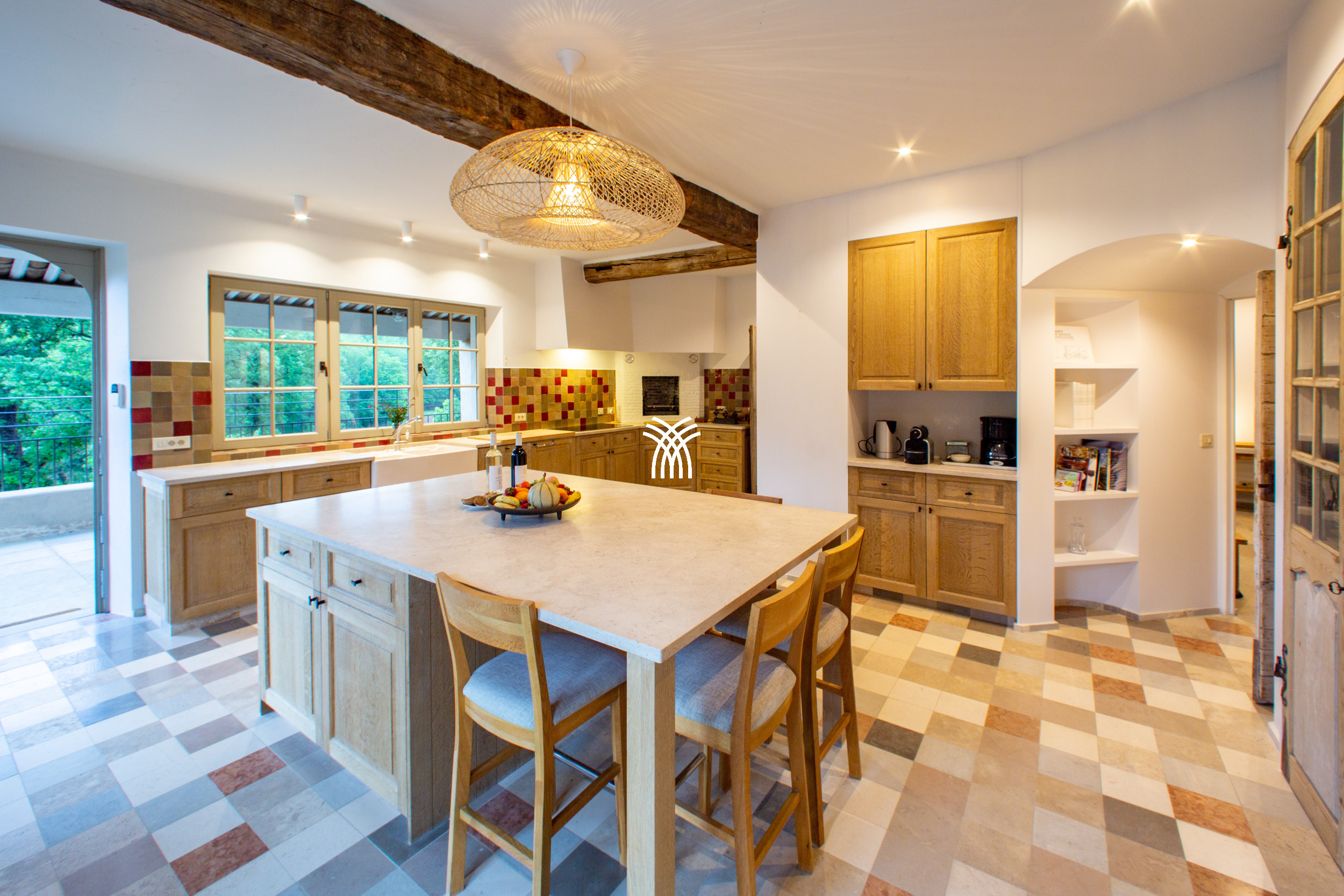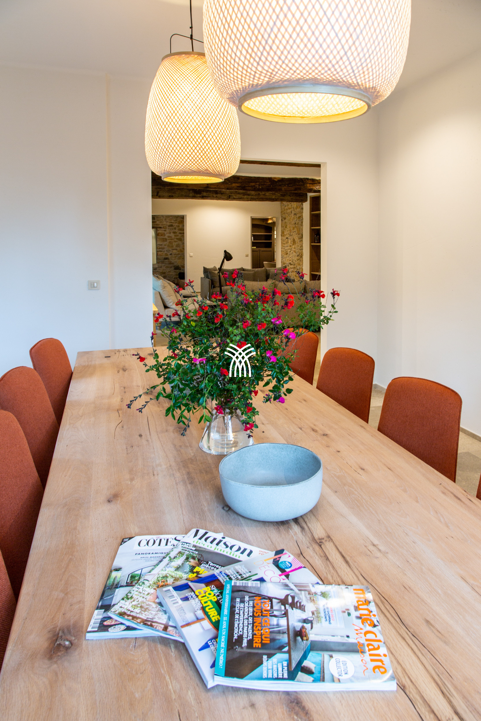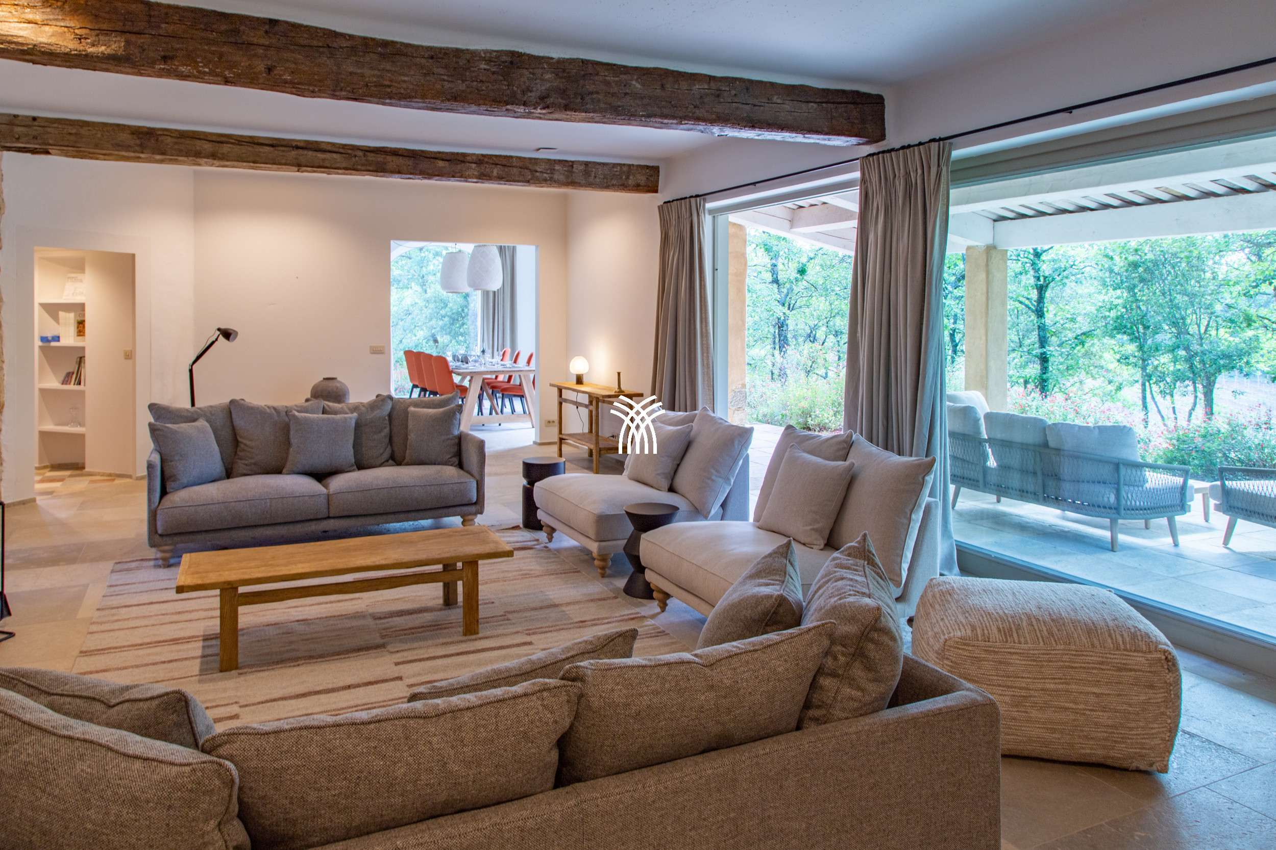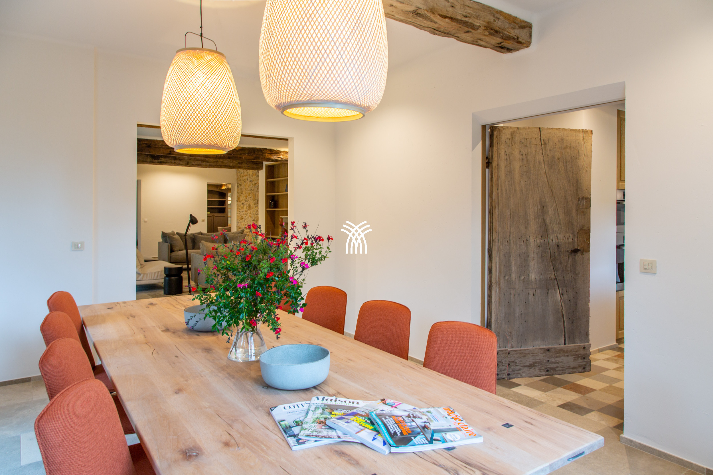 Designed to evoke warmth and authenticity, the bastide unfolds into generous living spaces that encourage both relaxation and togetherness. A spacious living room with deep armchairs and a fireplace creates an inviting setting for quiet moments, while the dining room and a separate television lounge offer additional spaces to gather or retreat. Every detail reflects the essence of Provençal living, where time slows and each moment is savoured.