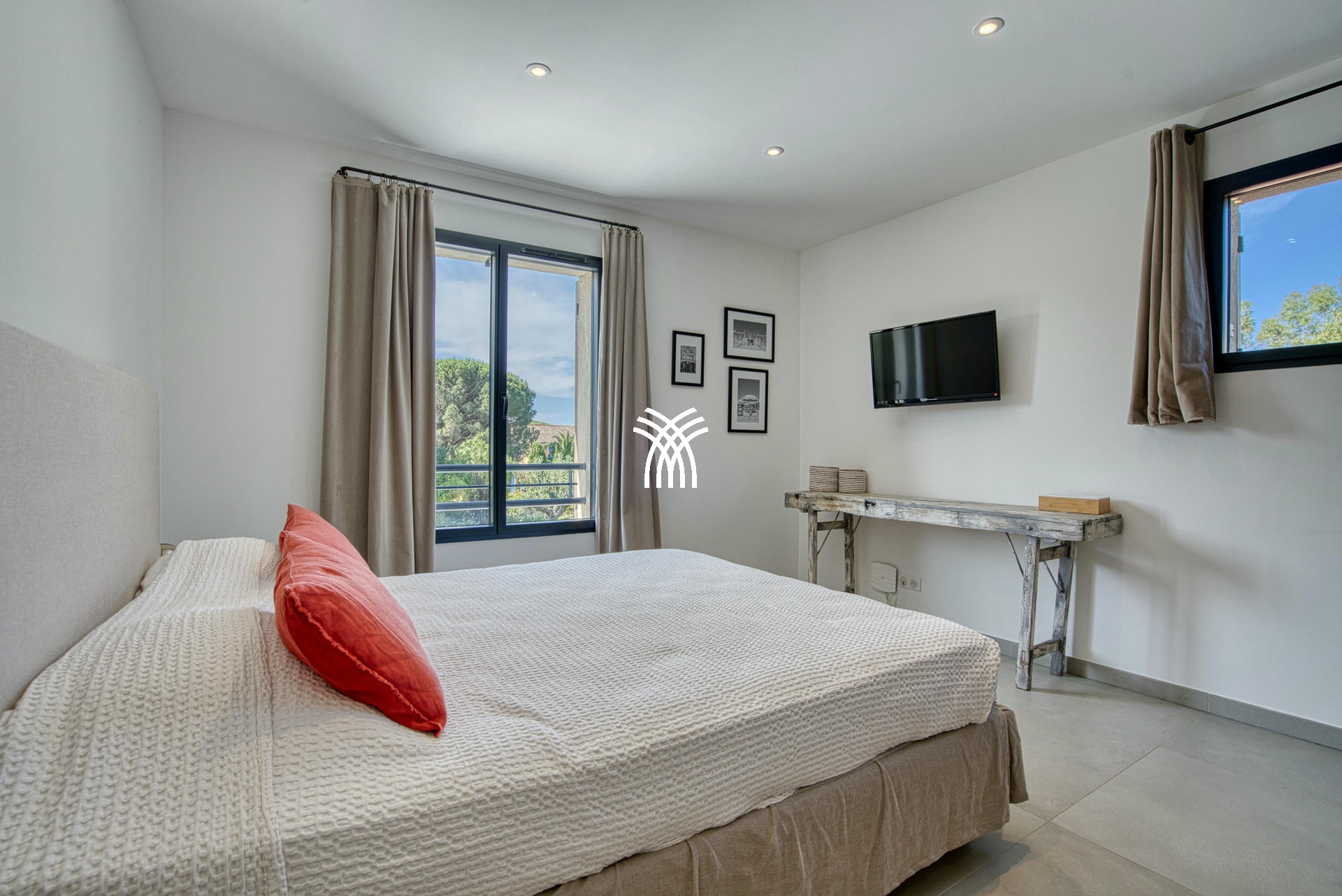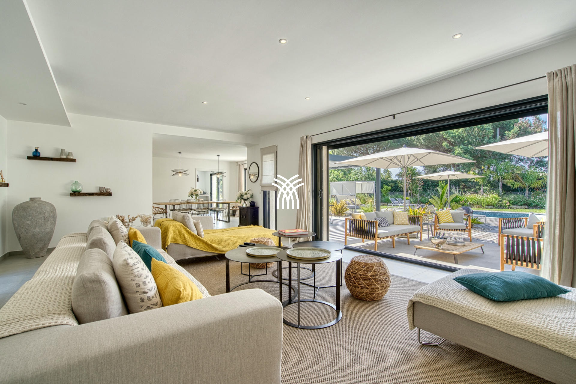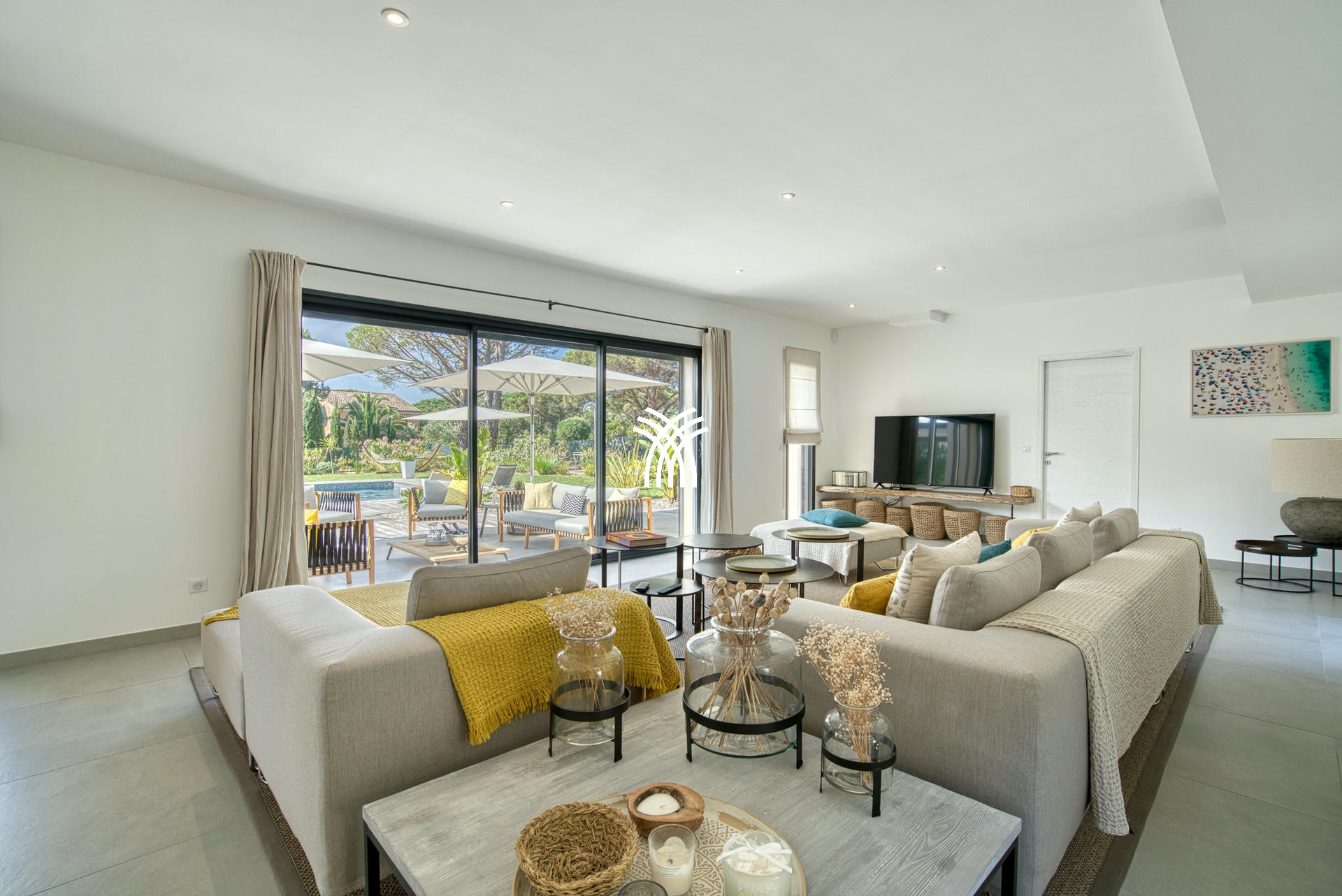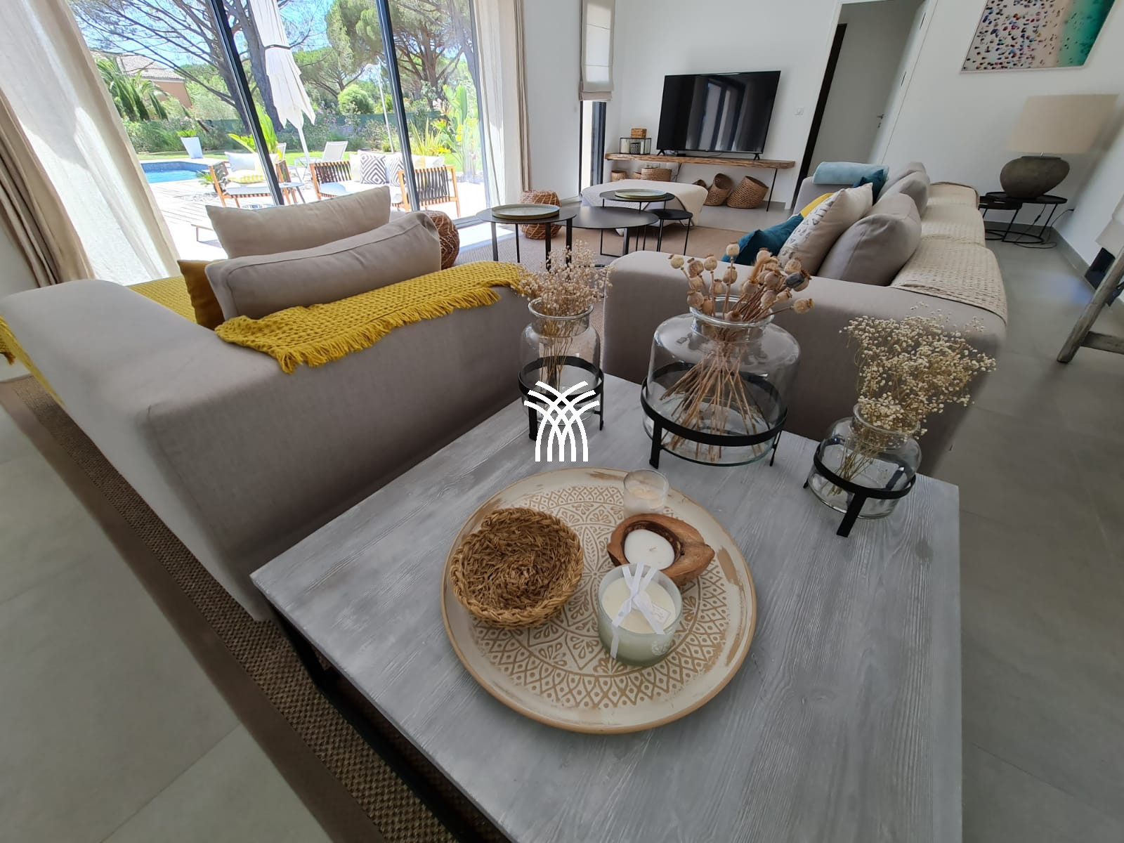 The villa is appealing with its high-end amenities: staff room, large laundry room, cold room, barbecue, fireplace, air conditioning, video surveillance system, Wi-Fi, as well as access to the domain's tennis courts. Children are welcome in a secure and privileged environment, with a sea view in the background.