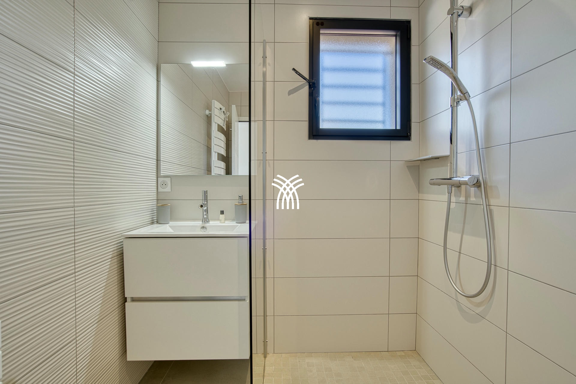 Its beautifully landscaped garden invites relaxation, featuring a heated 12x4m swimming pool, perfect for cooling off under the Mediterranean sun. A shaded terrace hosts an outdoor dining area, where the fragrance of flowers blends with the aroma of grilled delicacies from the barbecue, creating a warm and refined ambiance. A pétanque court completes this outdoor space, dedicated to summer pleasures.