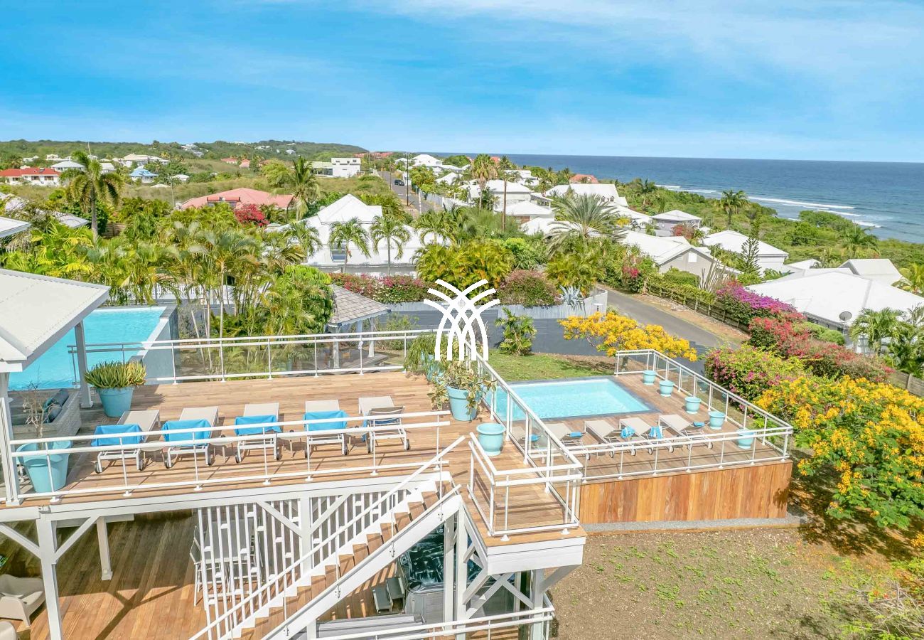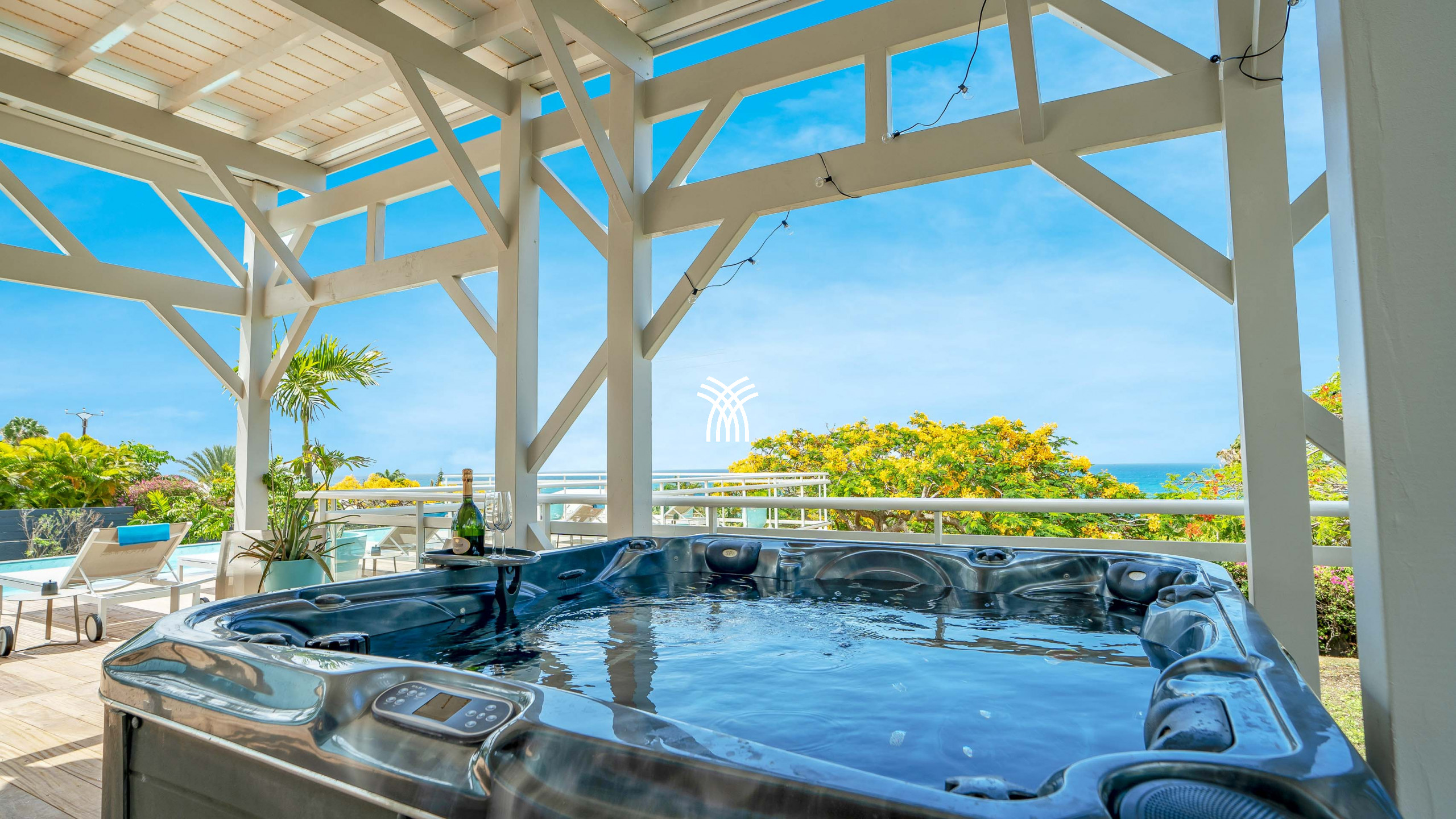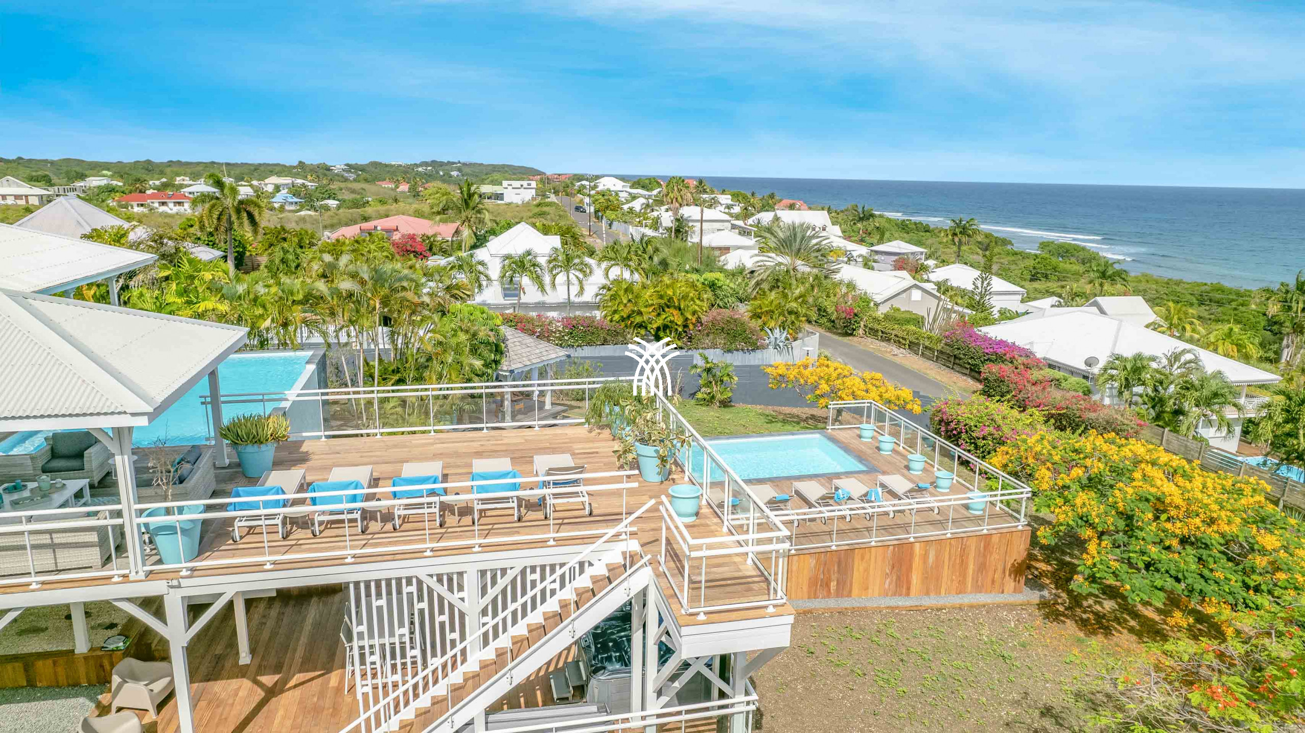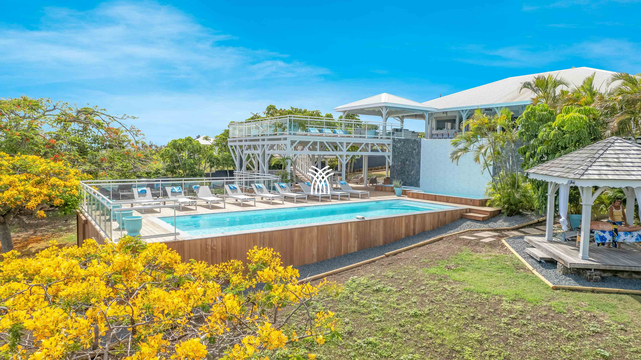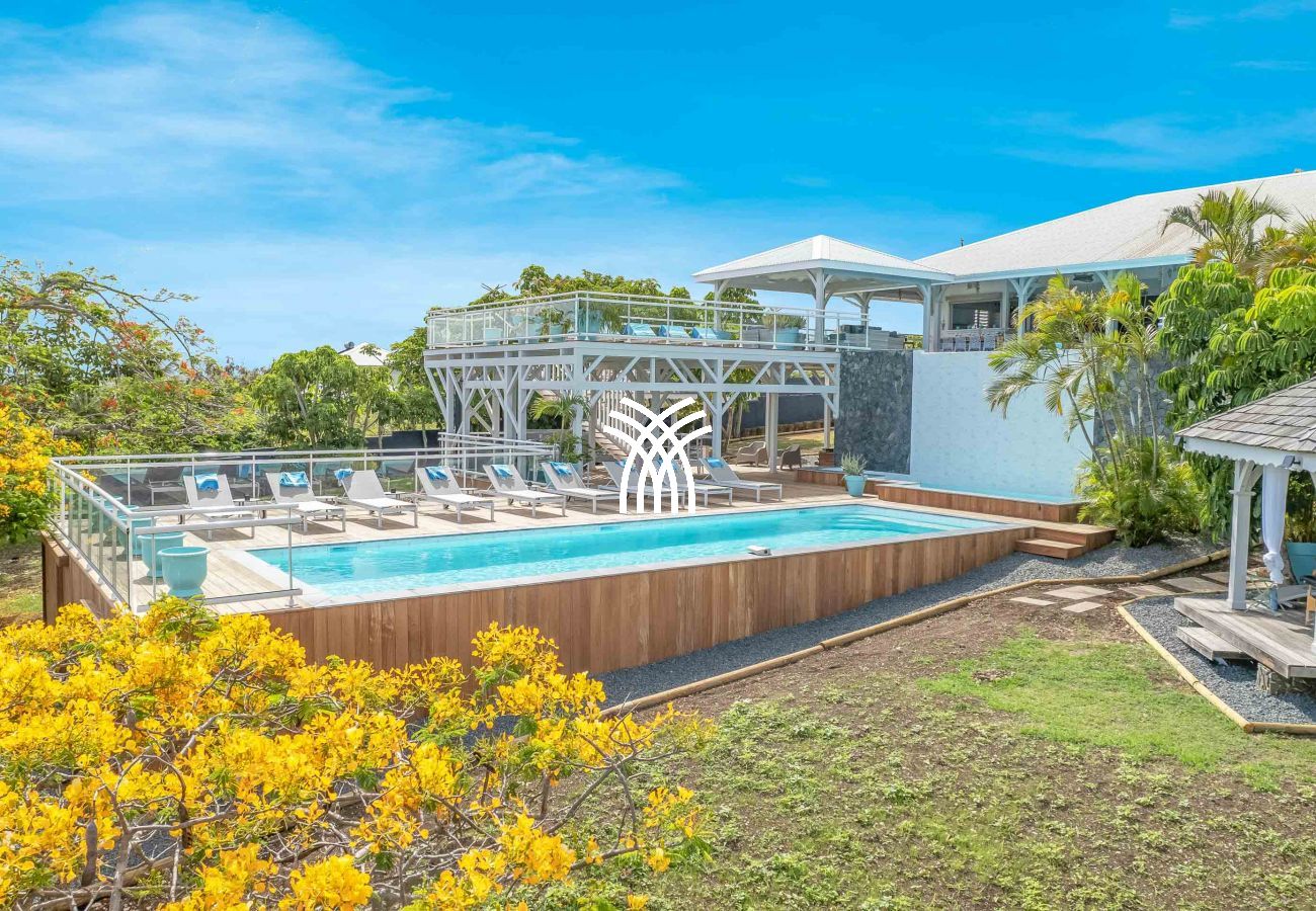 Outside, the villa reveals a true haven of peace with its three swimming pools, including an infinity pool with a breathtaking view of the ocean. Imagine starting your days facing a spectacular 180° view of Marie-Galante, Les Saintes and Basse-Terre, or relaxing in the jacuzzi at the end of the day, lulled by the trade winds. The children's pool also guarantees safe play moments for the little ones, while the petanque court promises convivial moments under the Caribbean sun.
