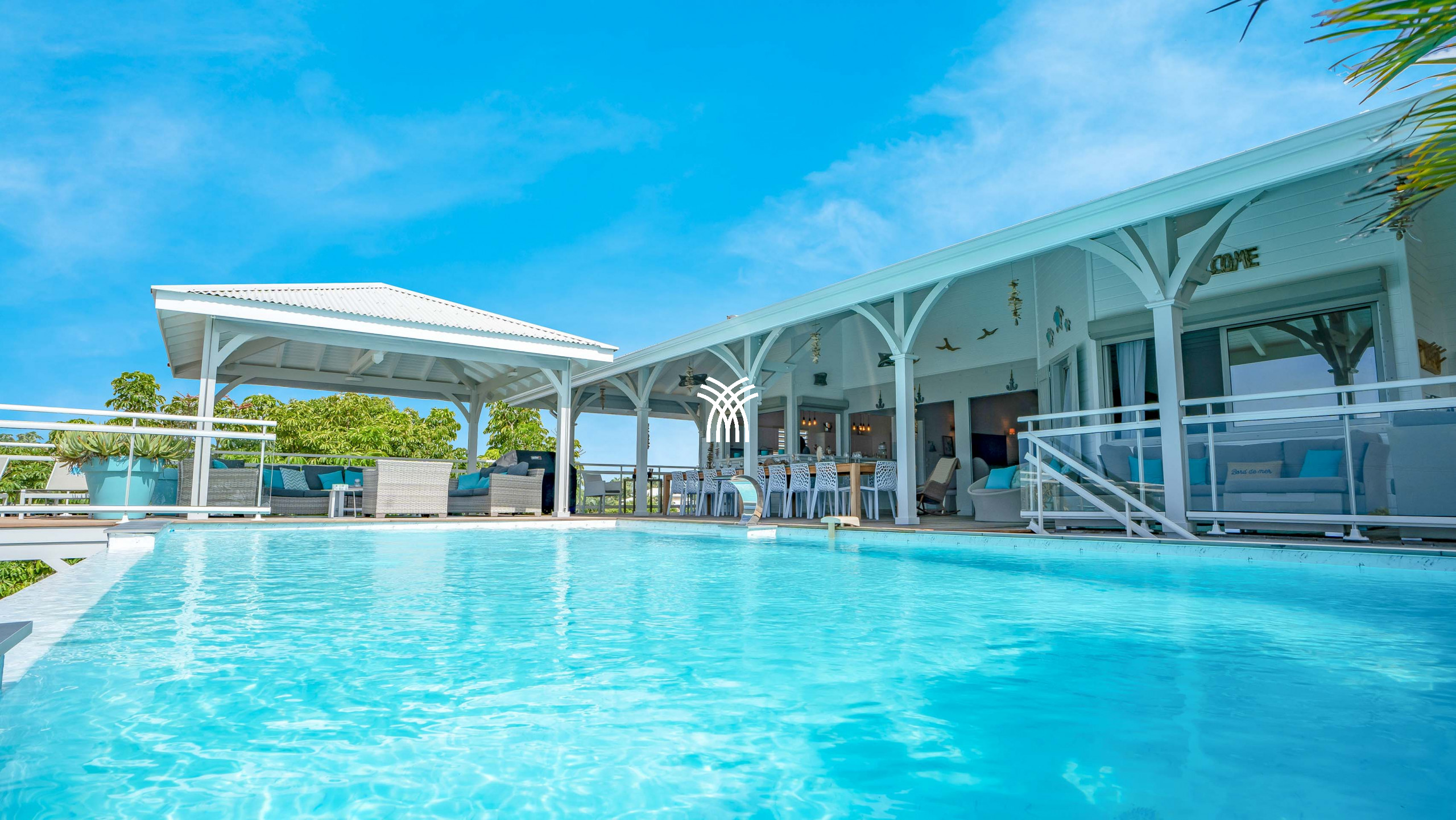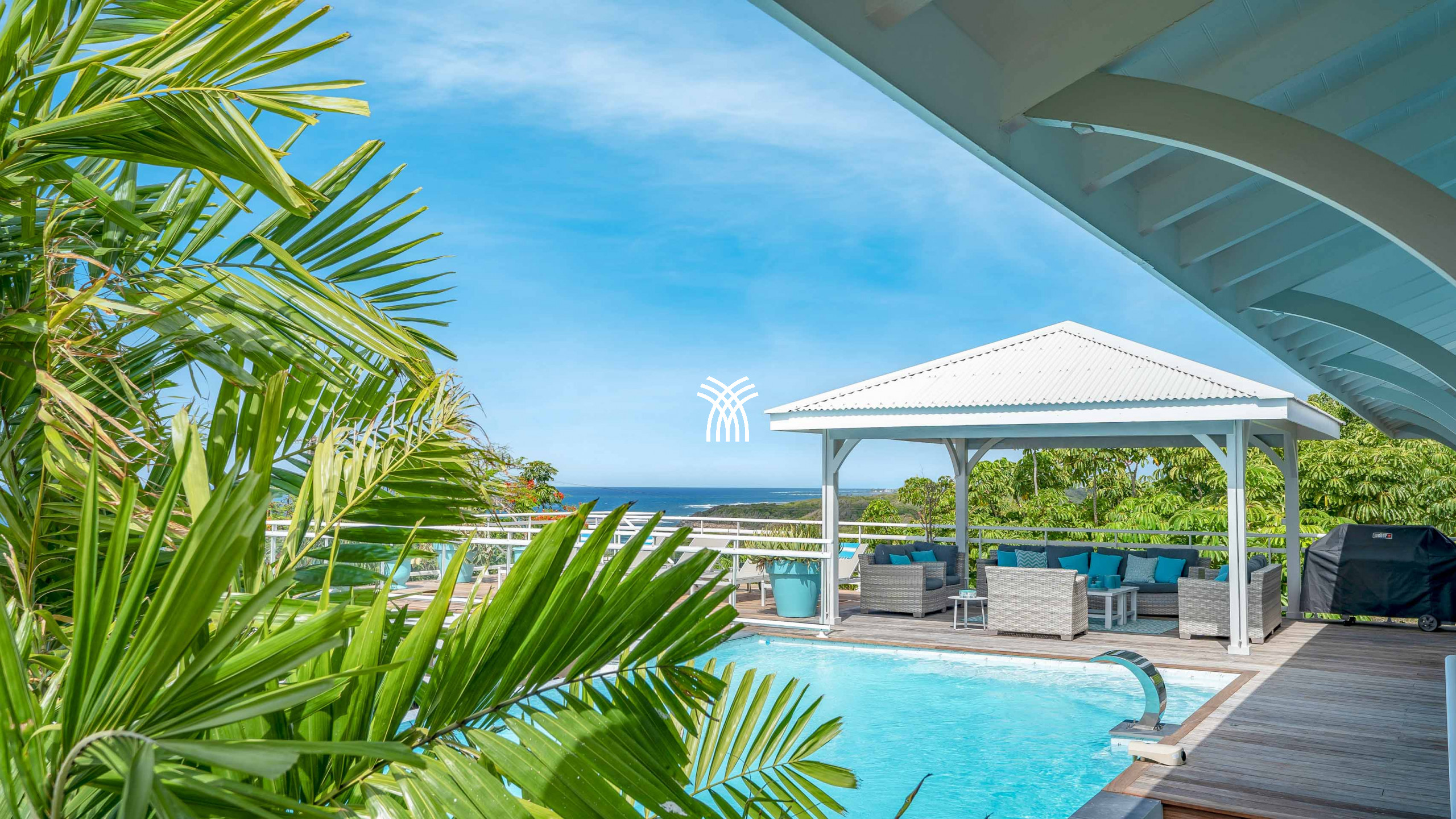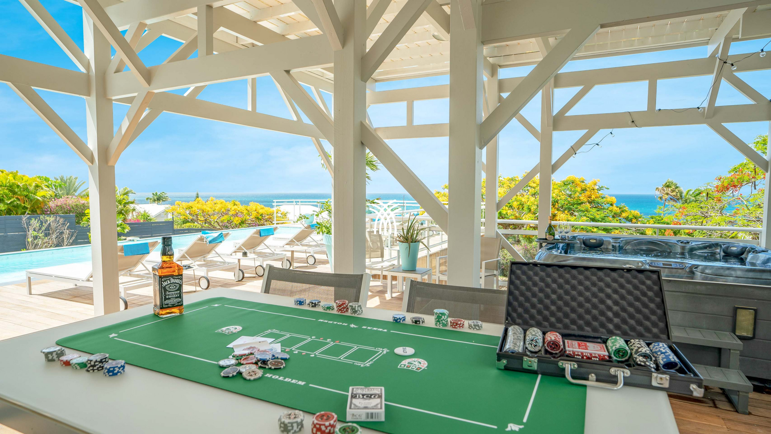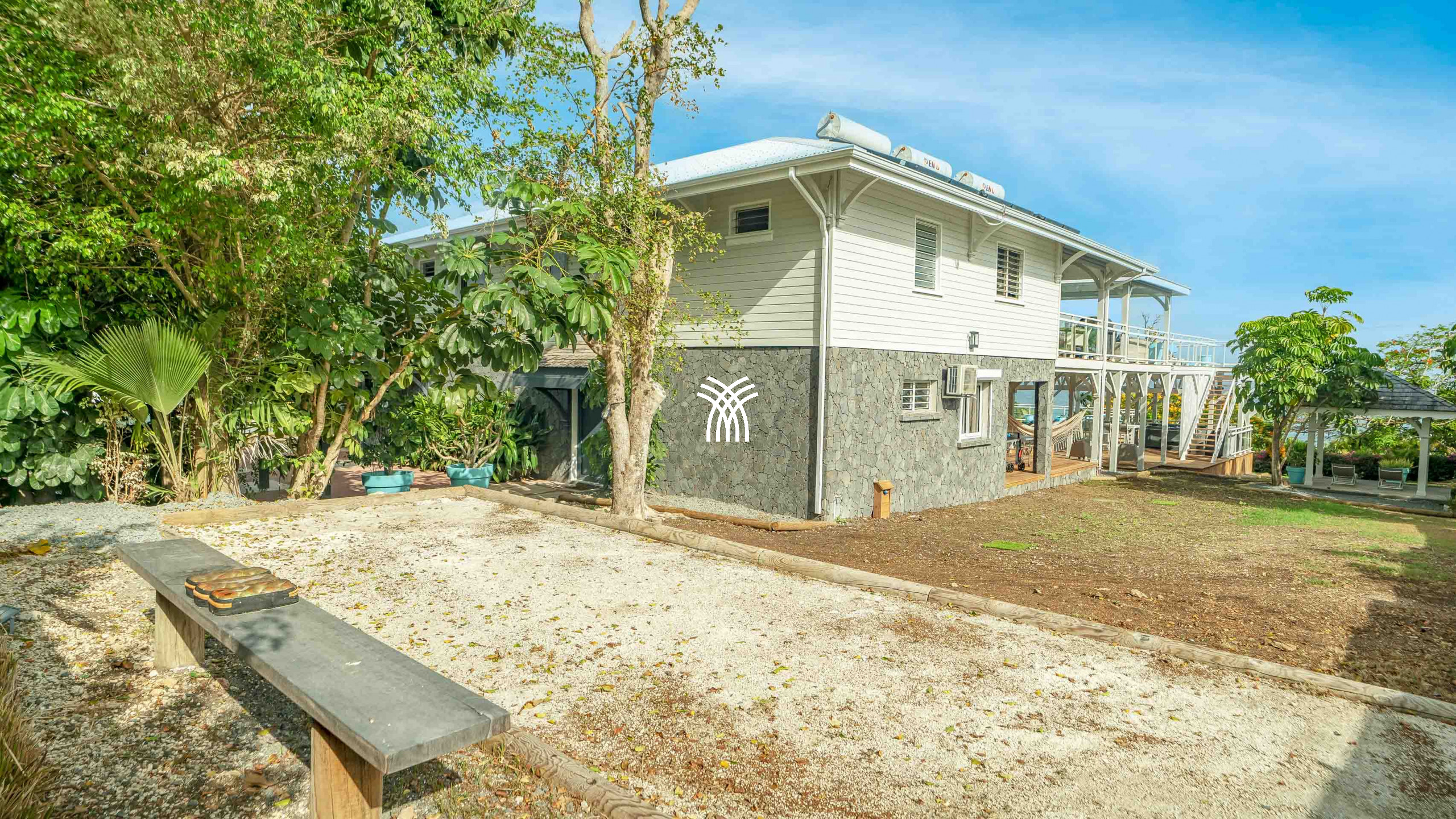 Outside, the villa reveals a true haven of peace with its three swimming pools, including an infinity pool with a breathtaking view of the ocean. Imagine starting your days facing a spectacular 180° view of Marie-Galante, Les Saintes and Basse-Terre, or relaxing in the jacuzzi at the end of the day, lulled by the trade winds. The children's pool also guarantees safe play moments for the little ones, while the petanque court promises convivial moments under the Caribbean sun.