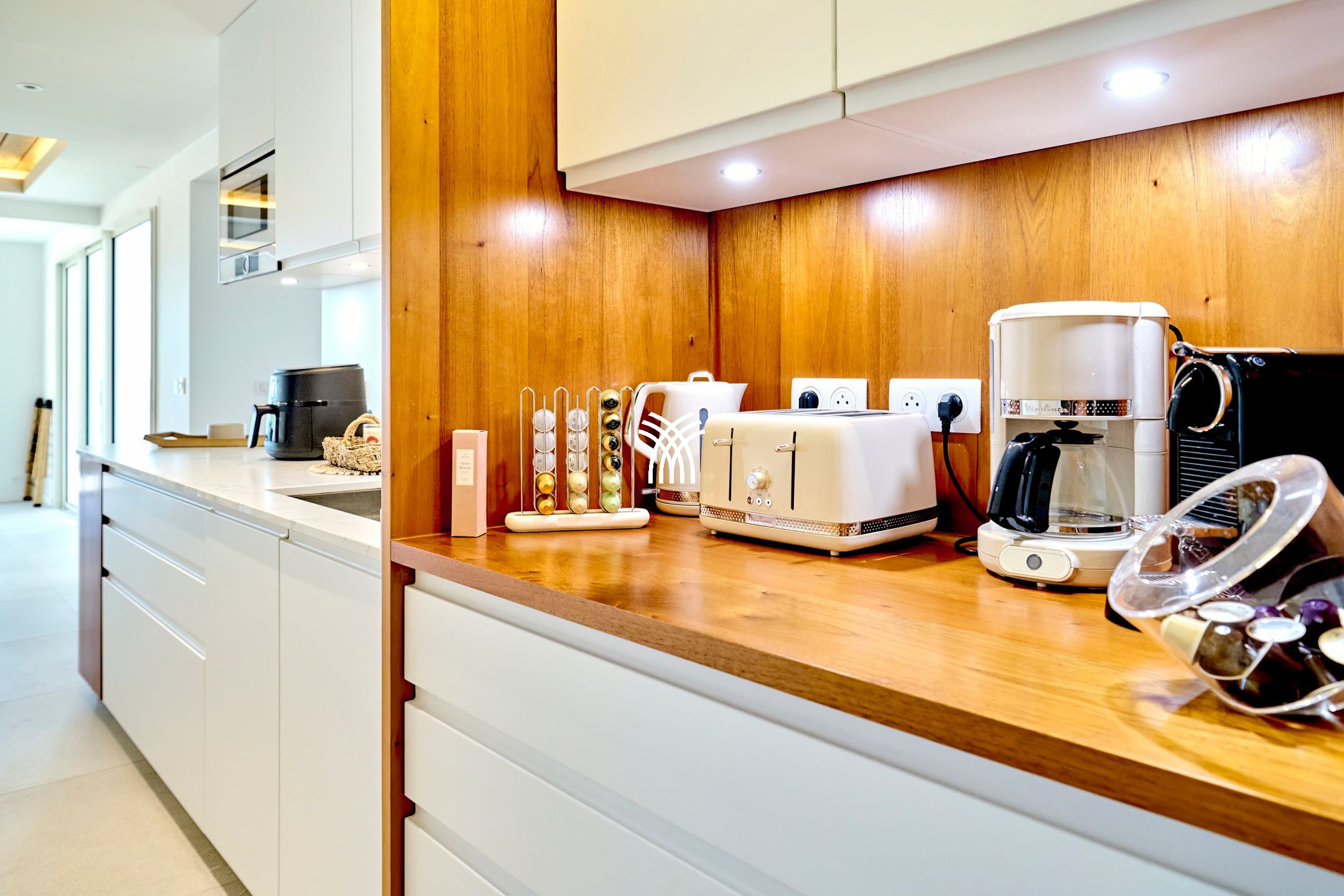 The 4 air-conditioned bedrooms share three bathrooms with shower and one suite even has a bathtub with sea view. The kitchen is fully equipped and open to the spacious living room. Available with many utensils and other equipment: Nespresso coffee machine, filter coffee and kettle.